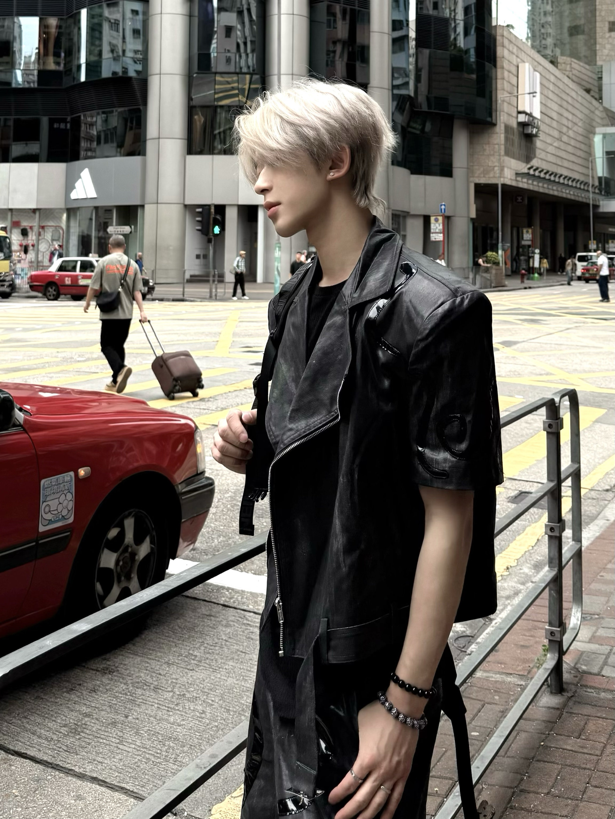 Jichuan Hong Kong Style Cool and Stylish Design Large Lapel Short-Sleeved Pu Leather Jacket Short Coat and Pants Set
