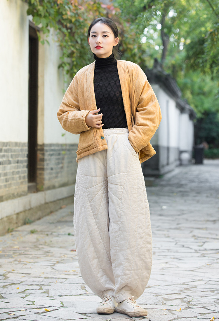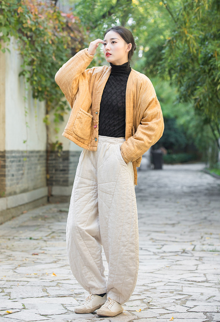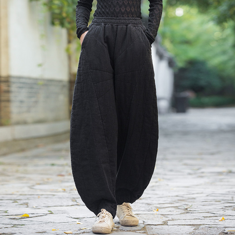Quilted Thickened Long Pants for Women, New Chinese Style, Cotton and Linen Quilted Pants, Ramie Retro Loose Lantern Pants, Outerwear Cotton Pants