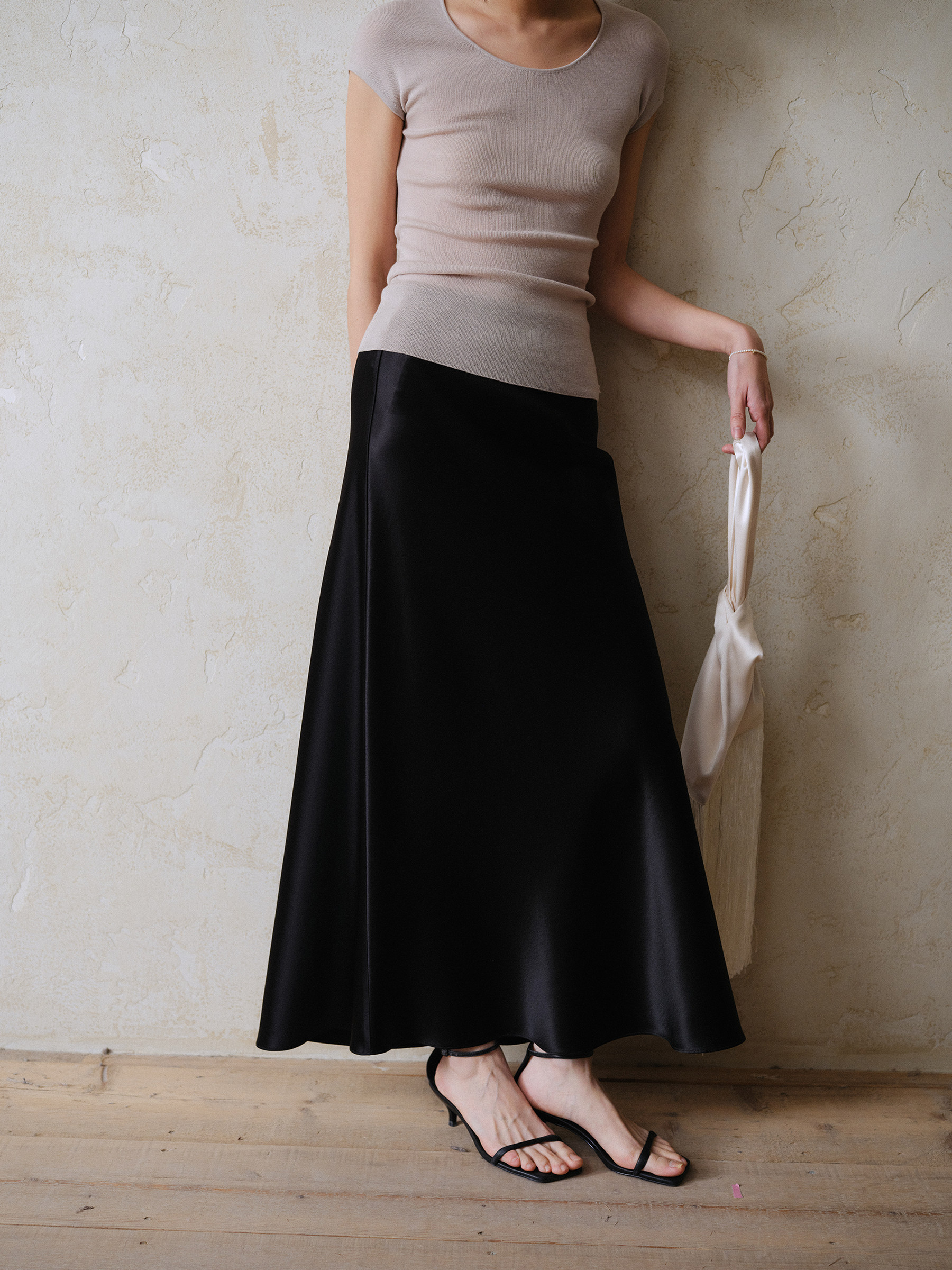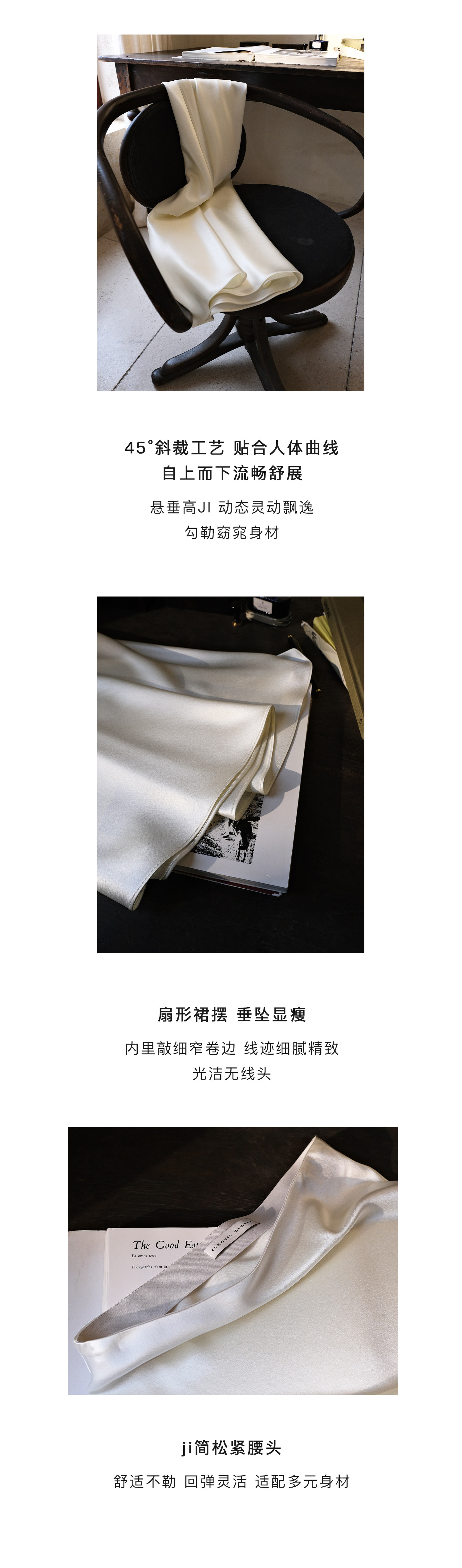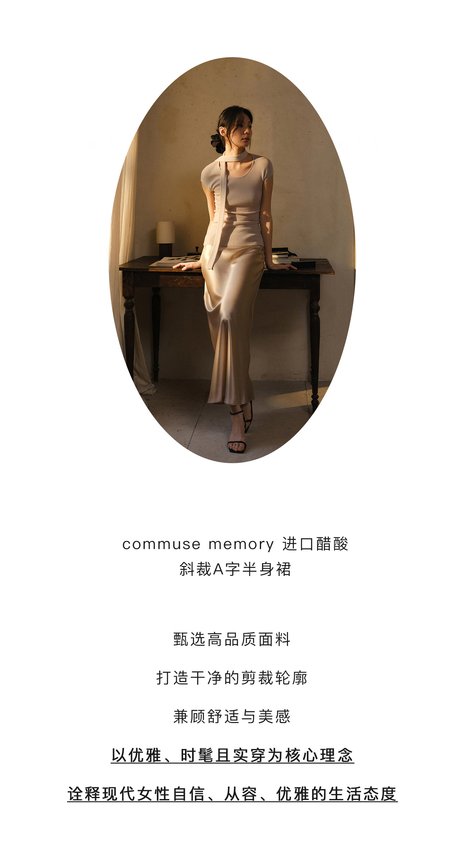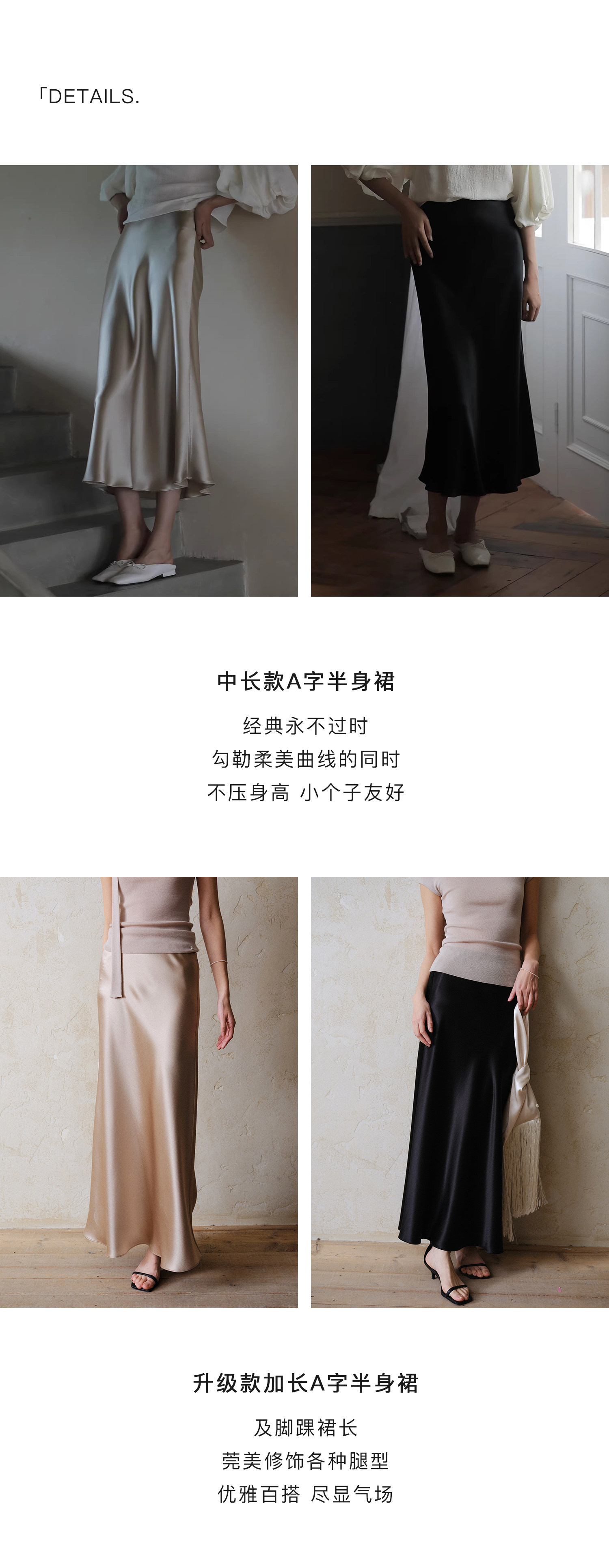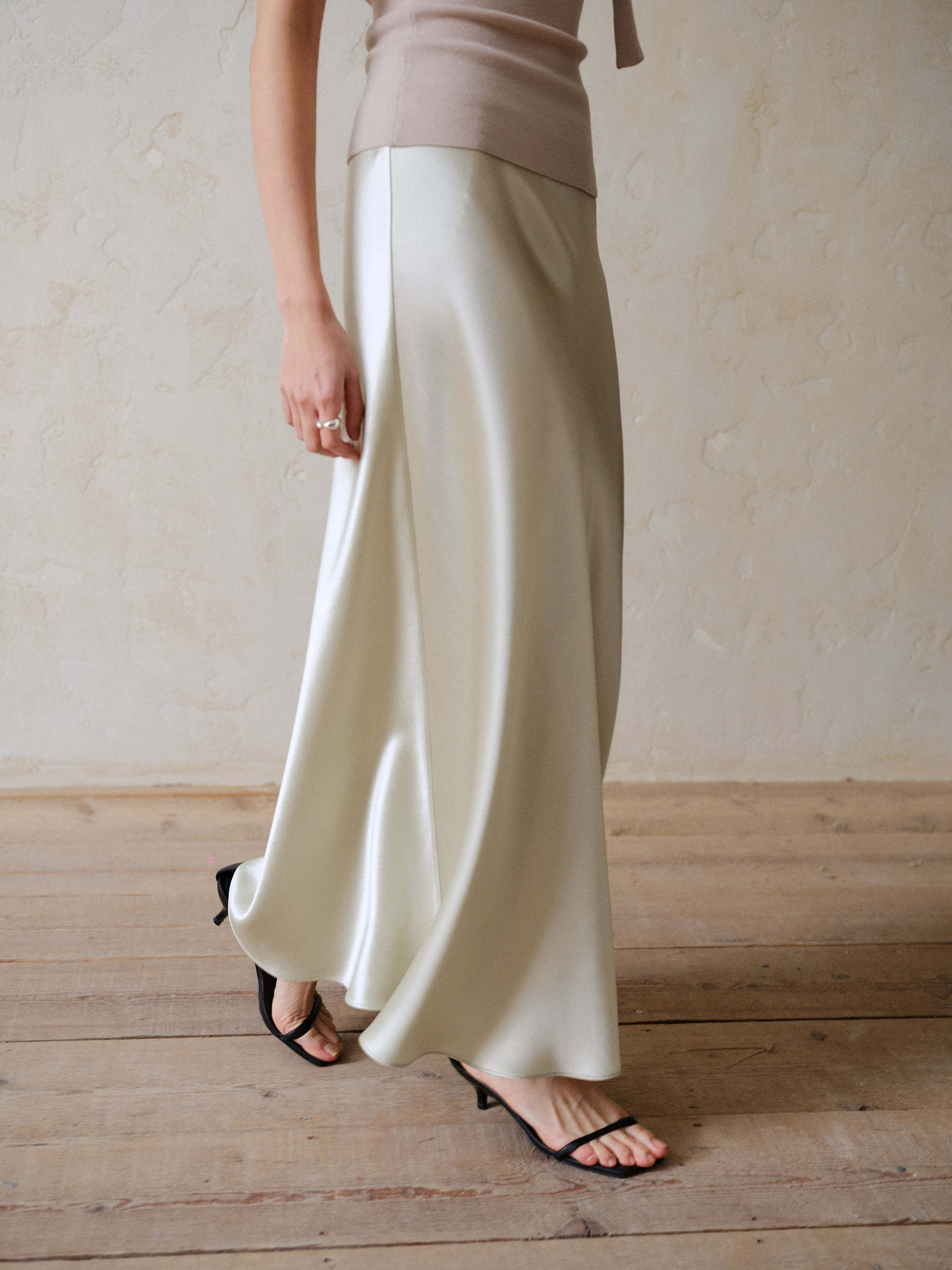 Commuse Memory Imported Acetate Satin Silky Drape Slimming Elastic Waist A-Line Mid-Length Skirt