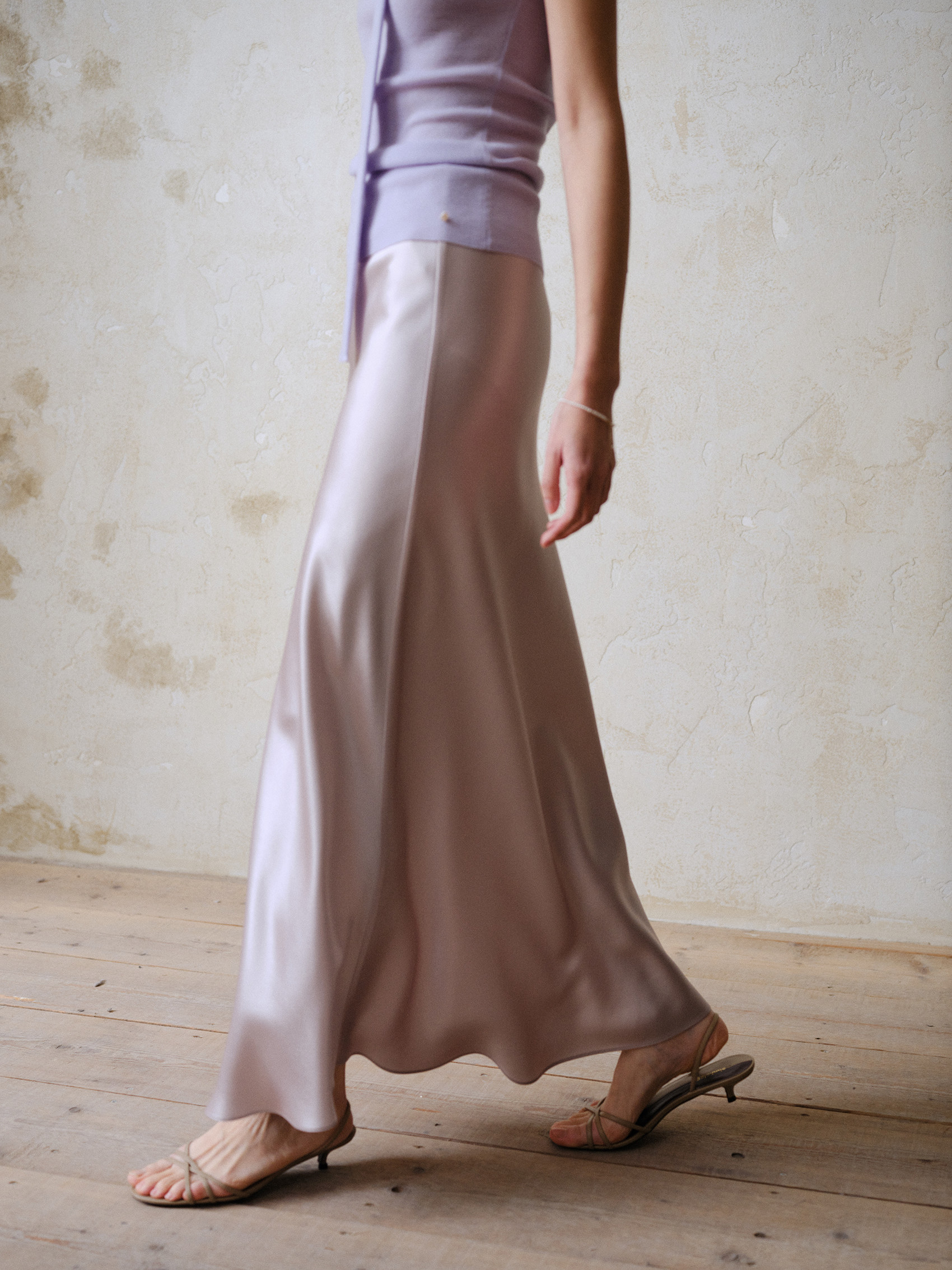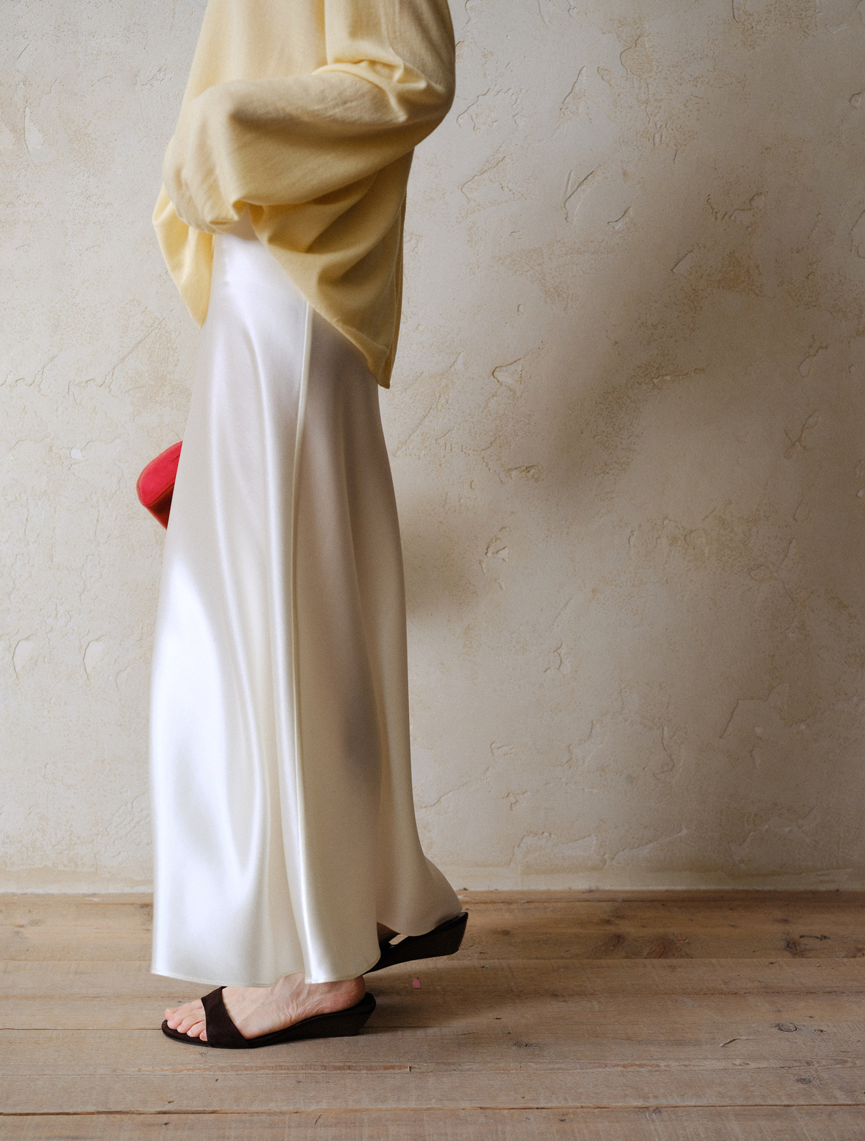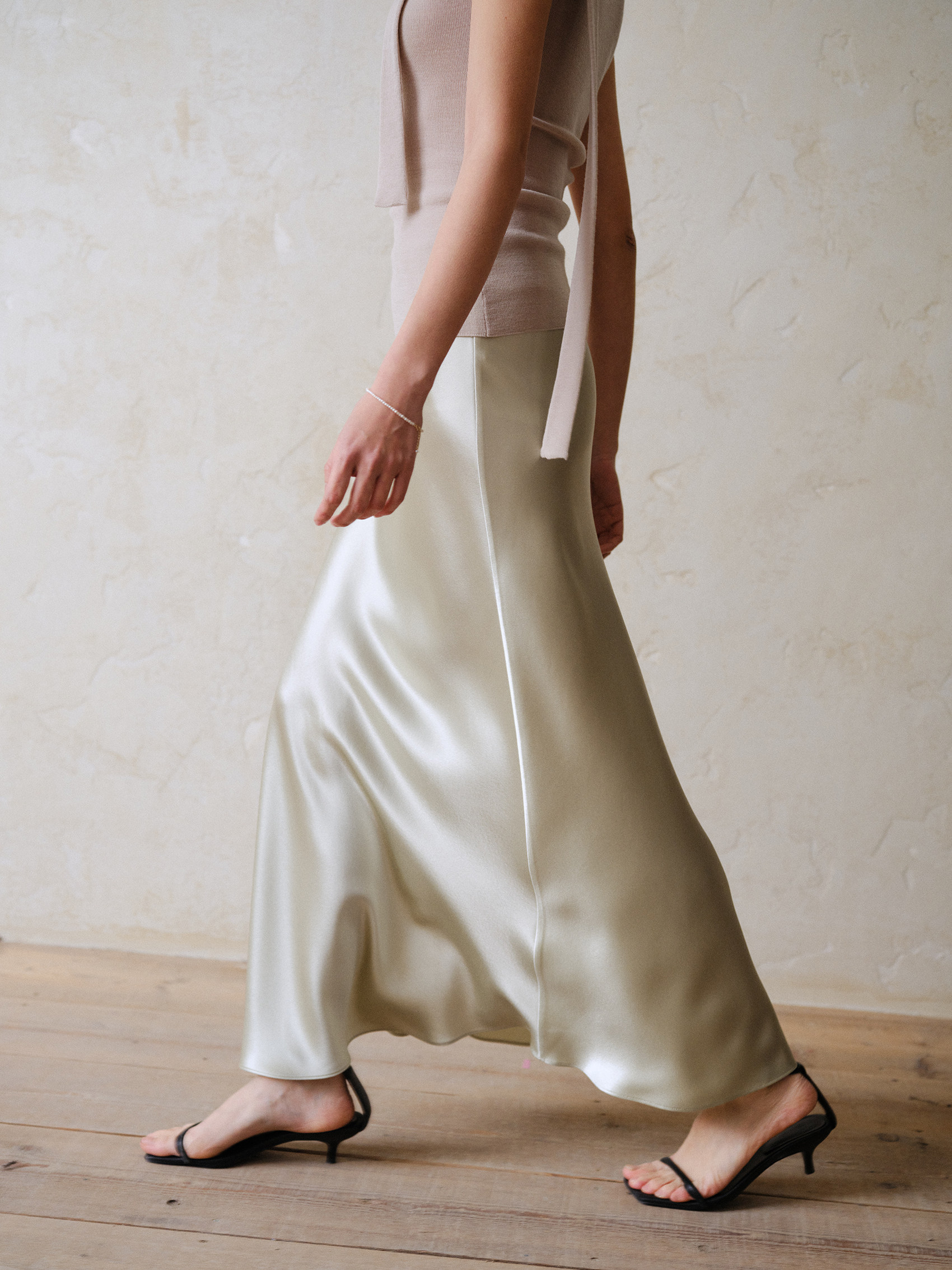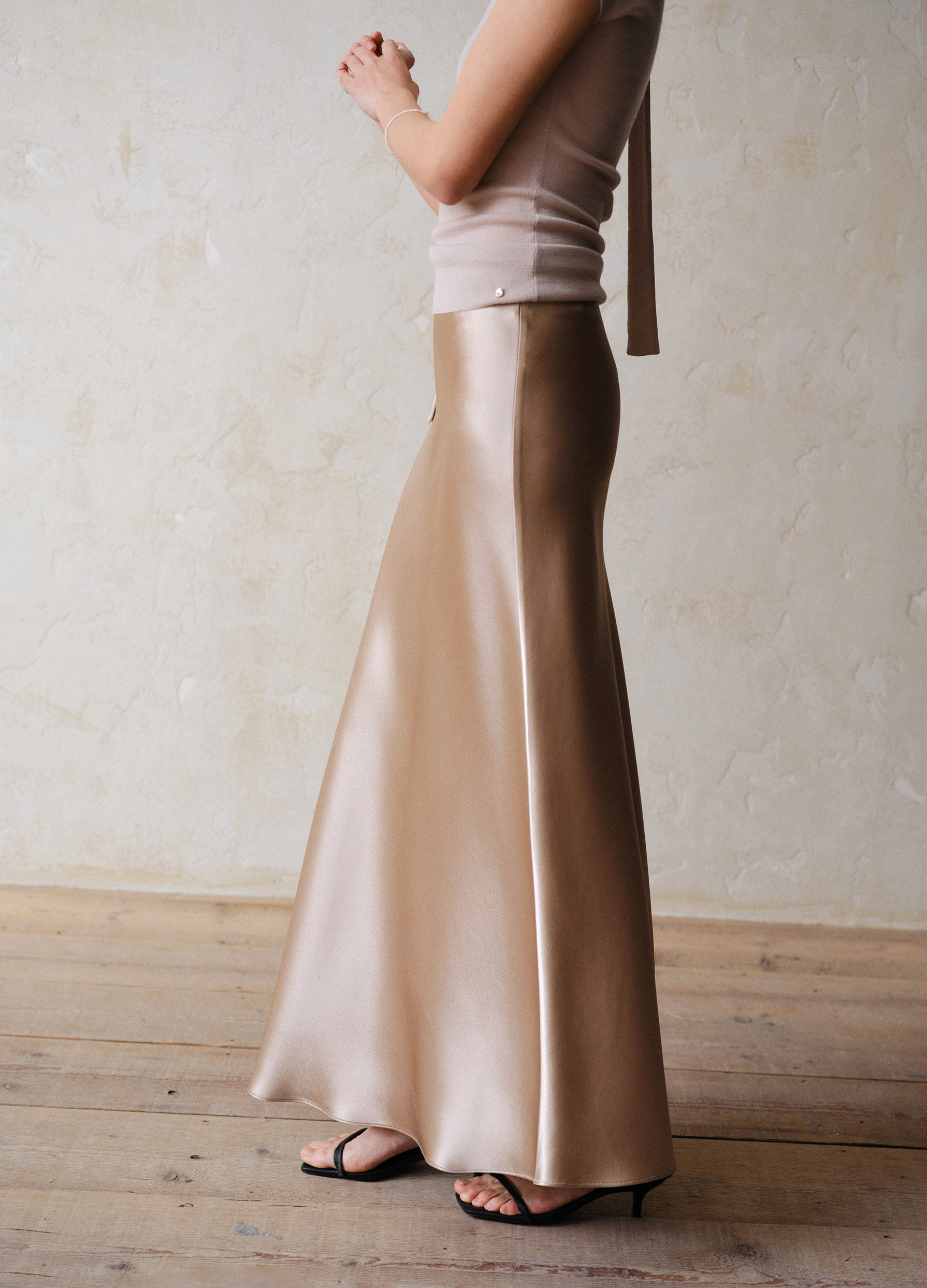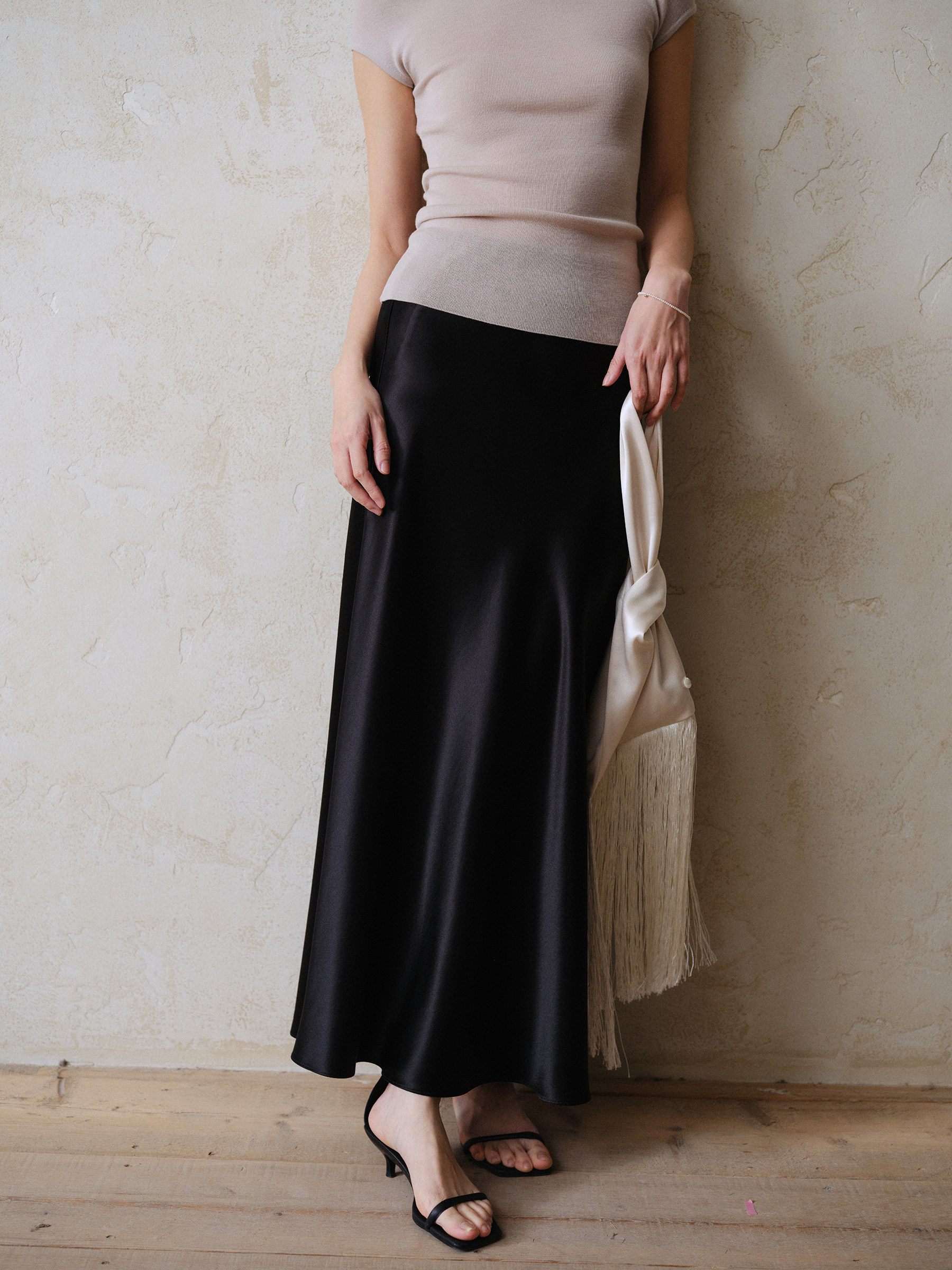 Commuse Memory Imported Acetate Satin Silky Drape Slimming Elastic Waist A-Line Mid-Length Skirt