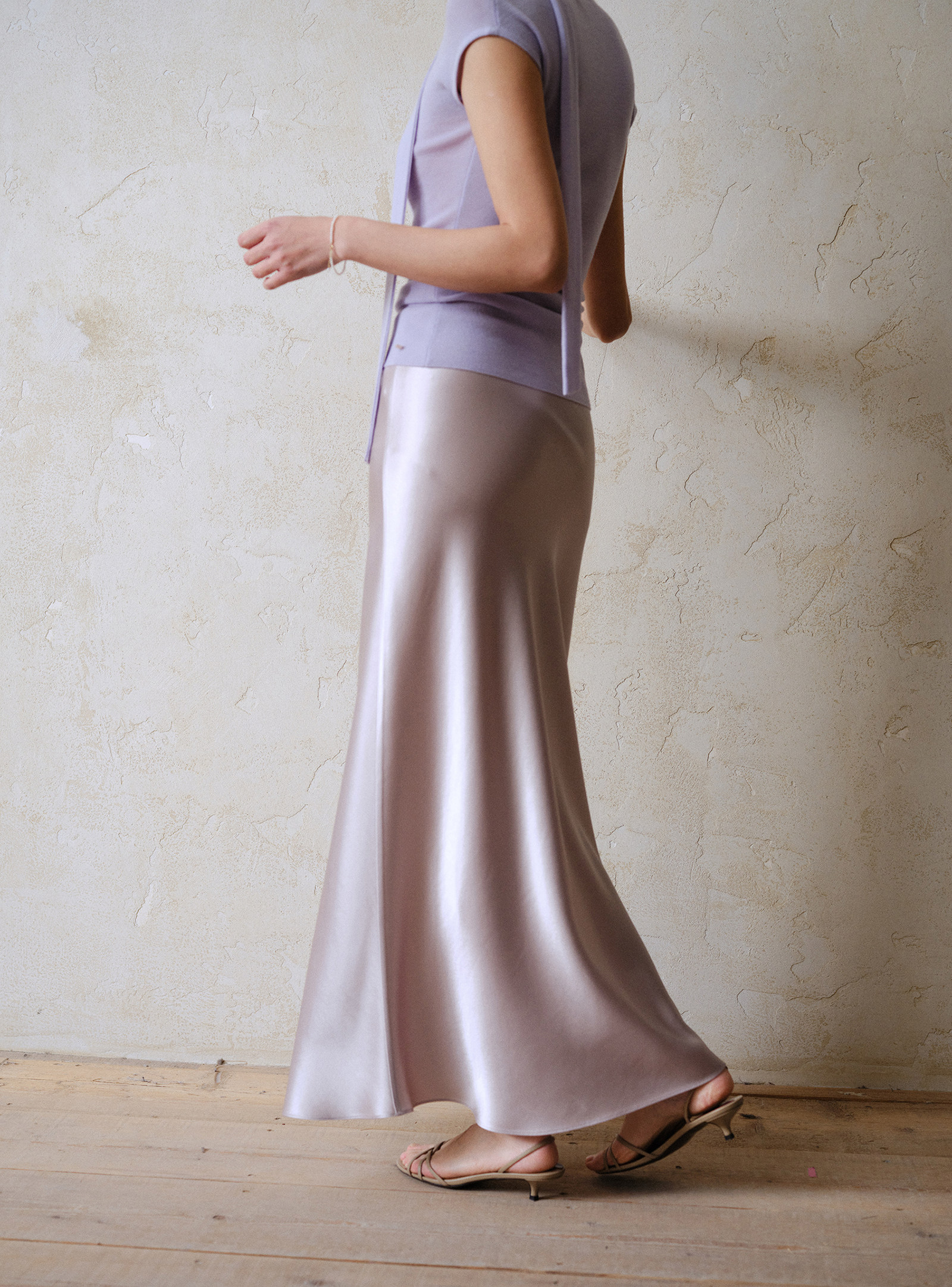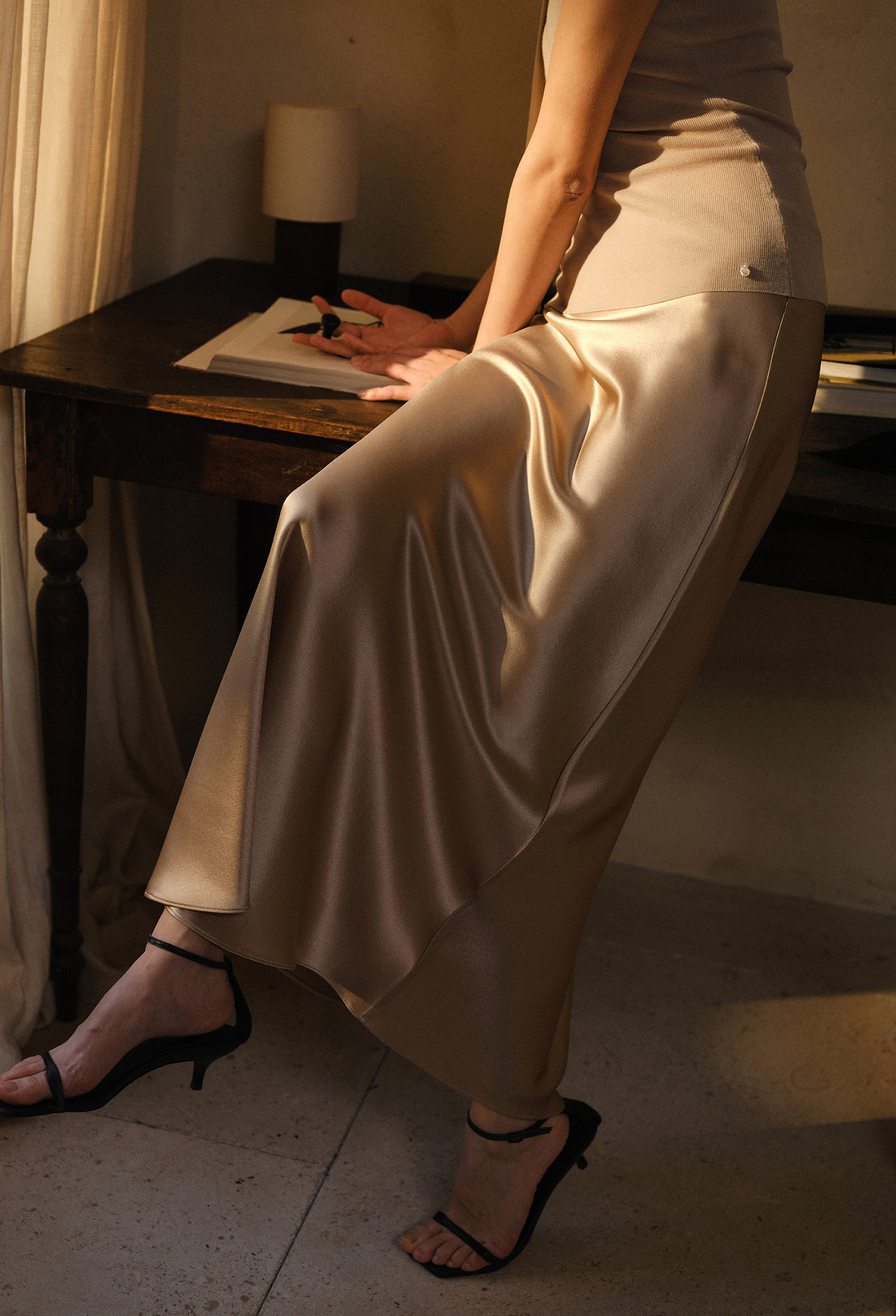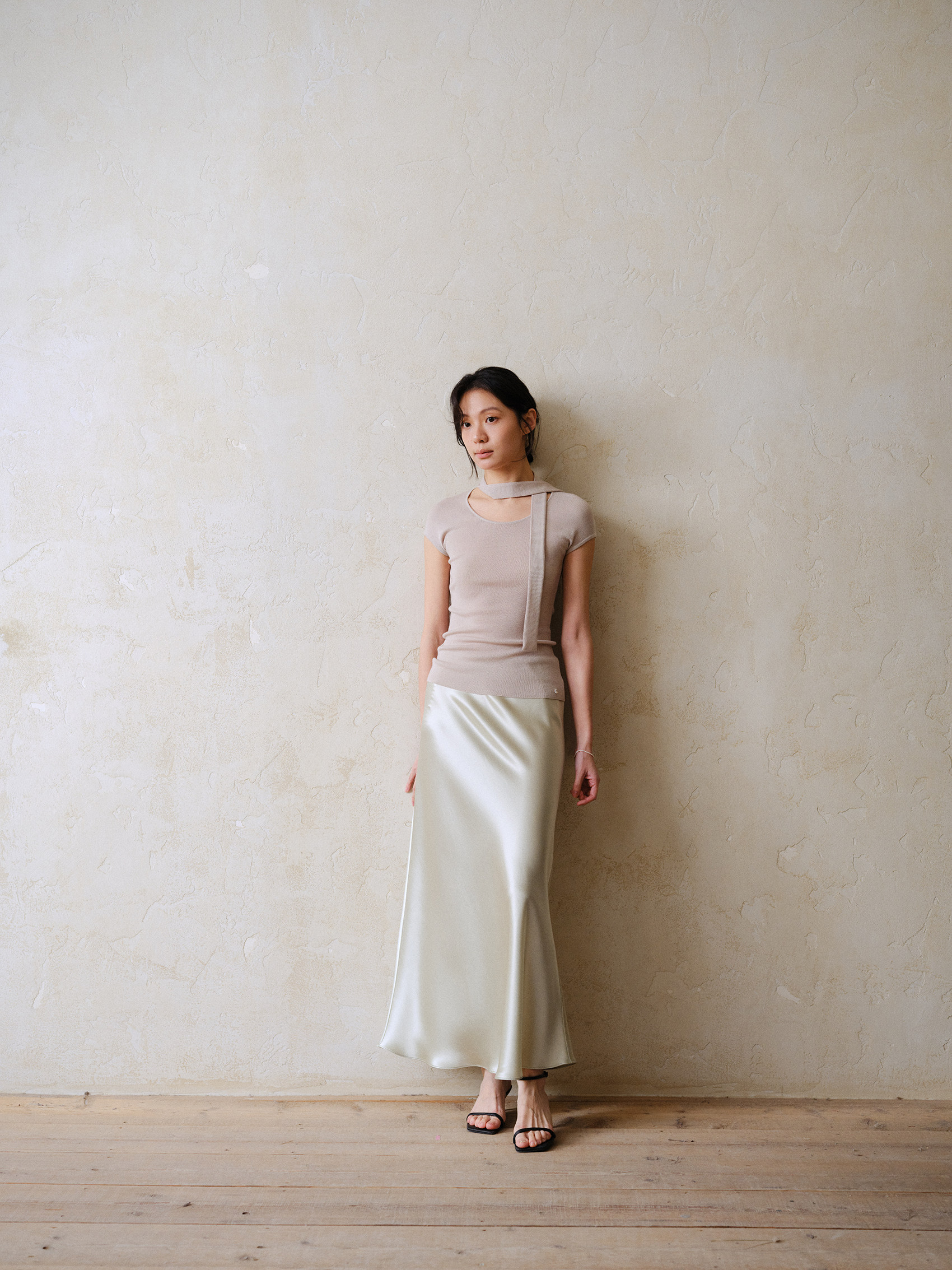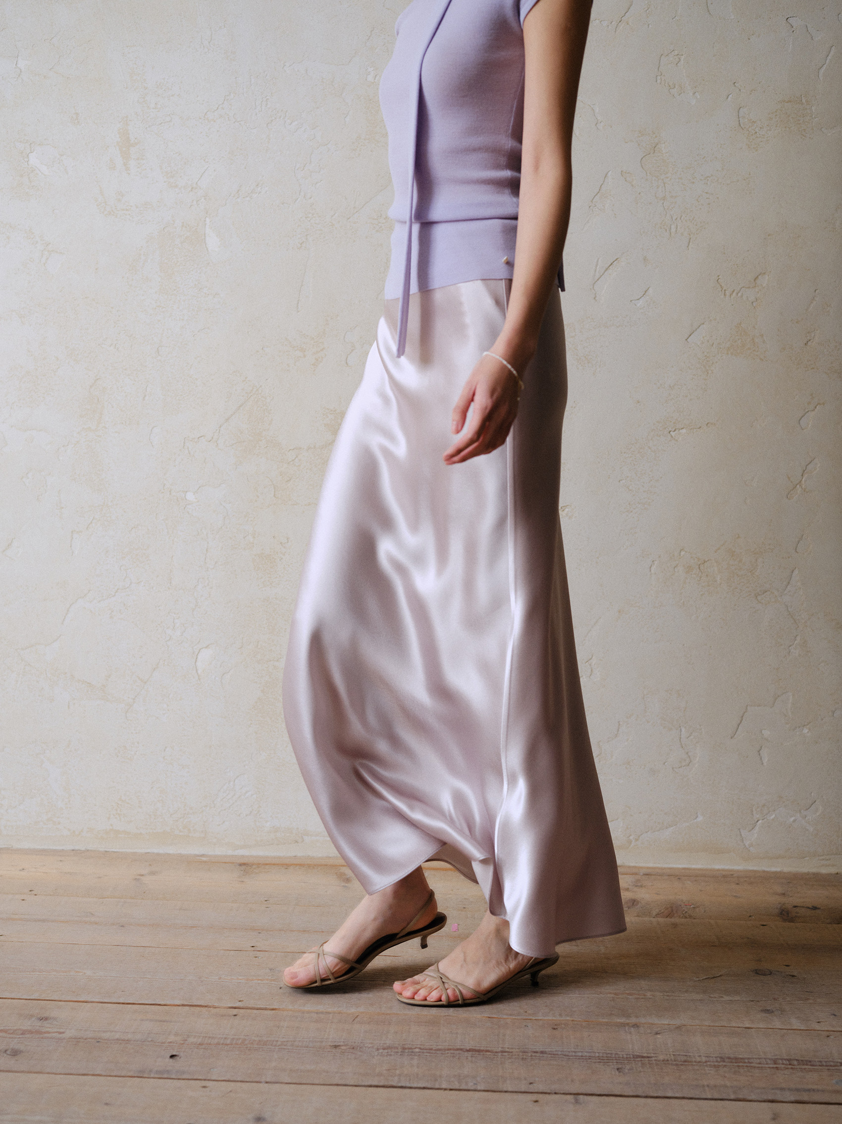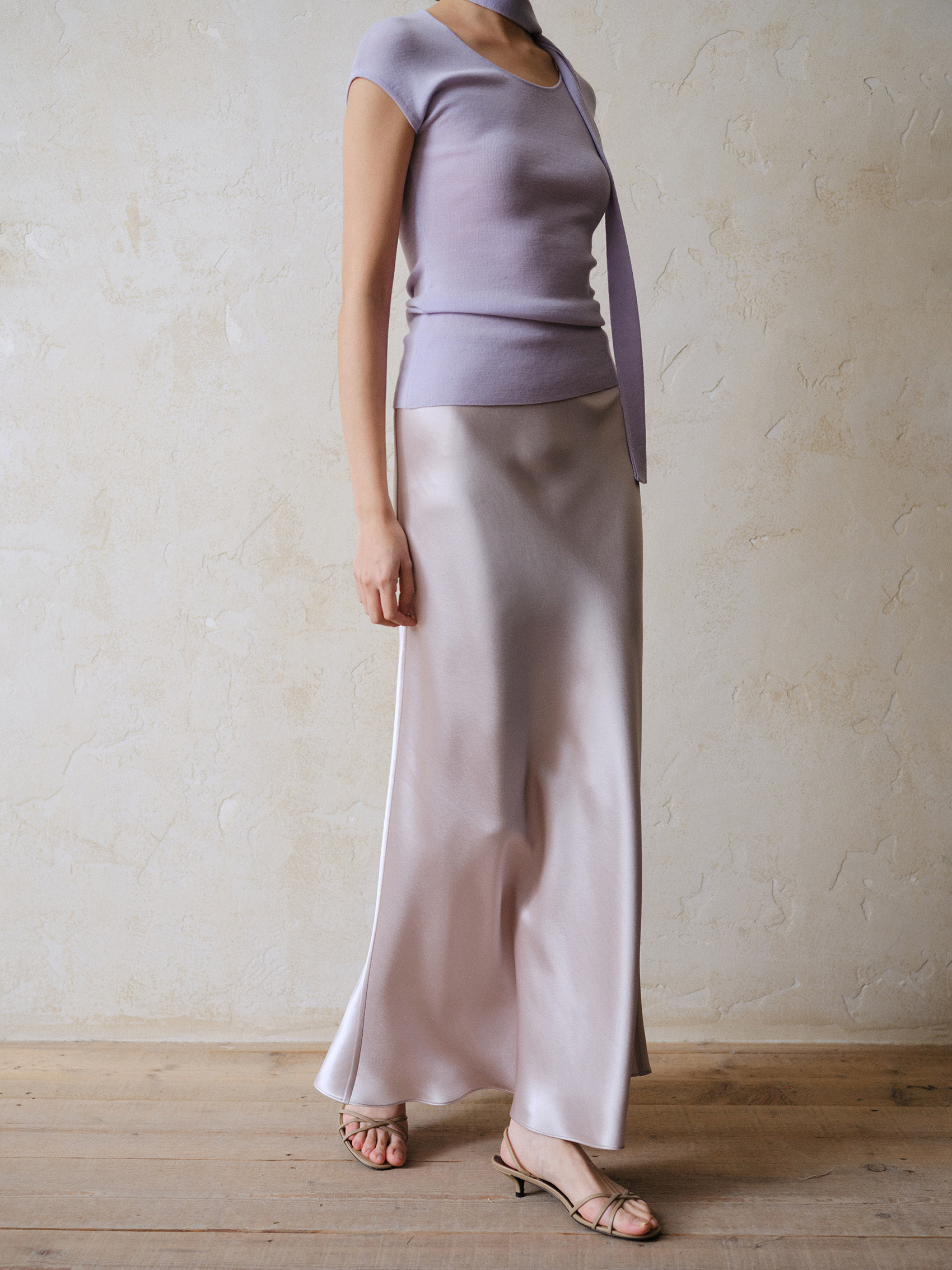 Commuse Memory Imported Acetate Satin Silky Drape Slimming Elastic Waist A-Line Mid-Length Skirt