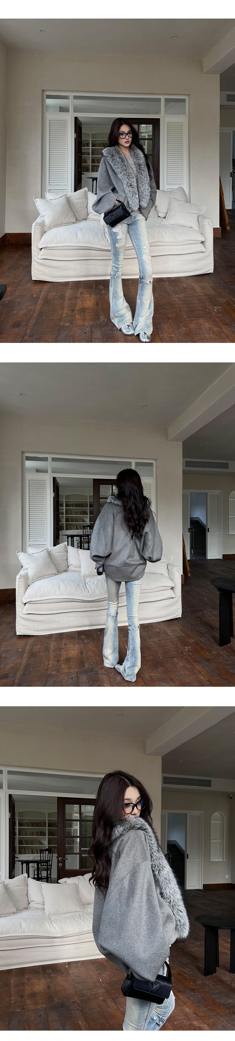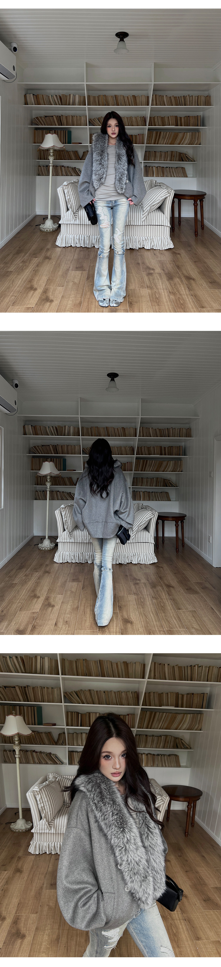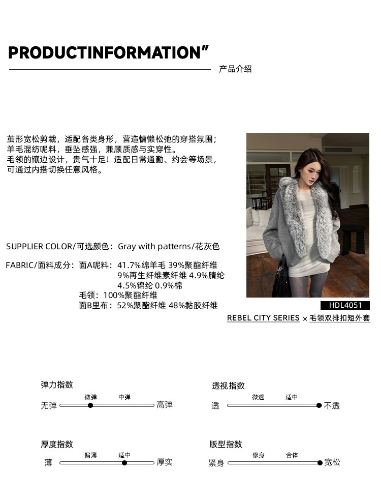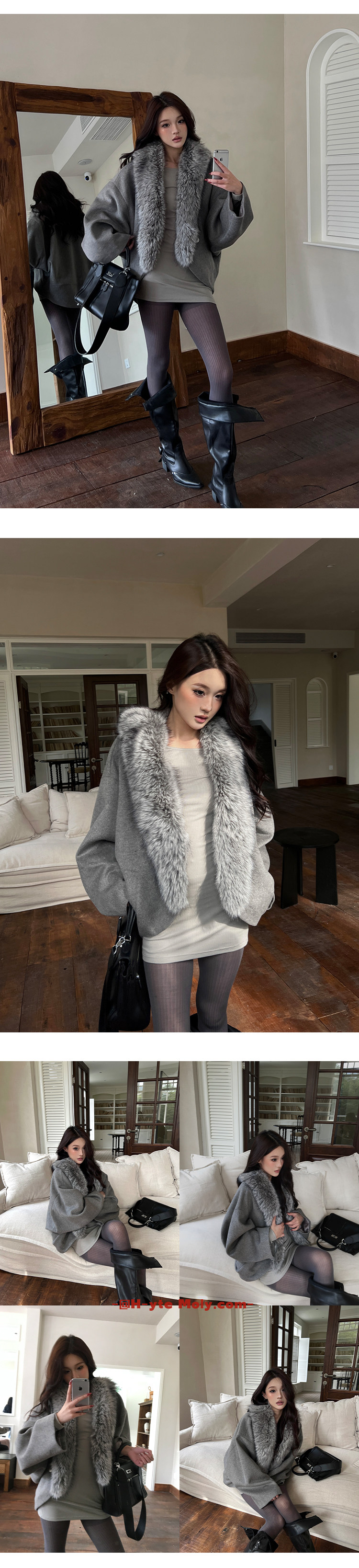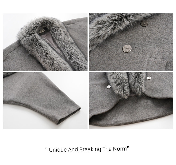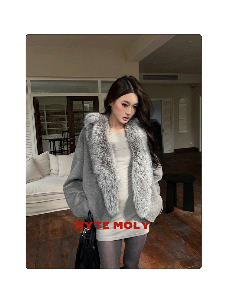Hytemoly Wool Blend Cocoon-Shaped Eco-Friendly Fur Collar Loose Drop Shoulder Woolen Fabric Double-Breasted Four-Button Short Coat for Women