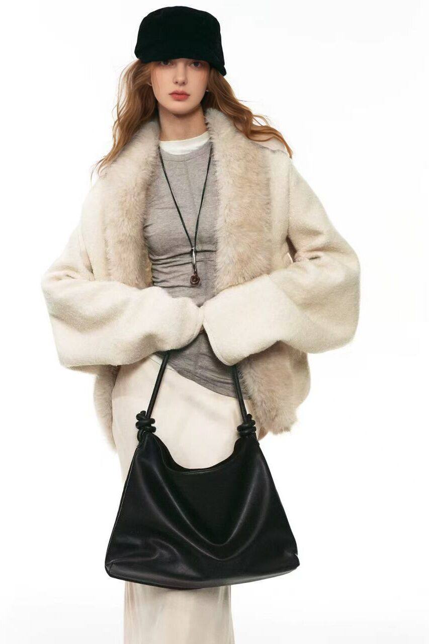 【In Stock Singl】 25Aw French-Style Winter Light Luxury Elegant Cocoon-Shaped Wool Collar Cardigan Jacket for Women