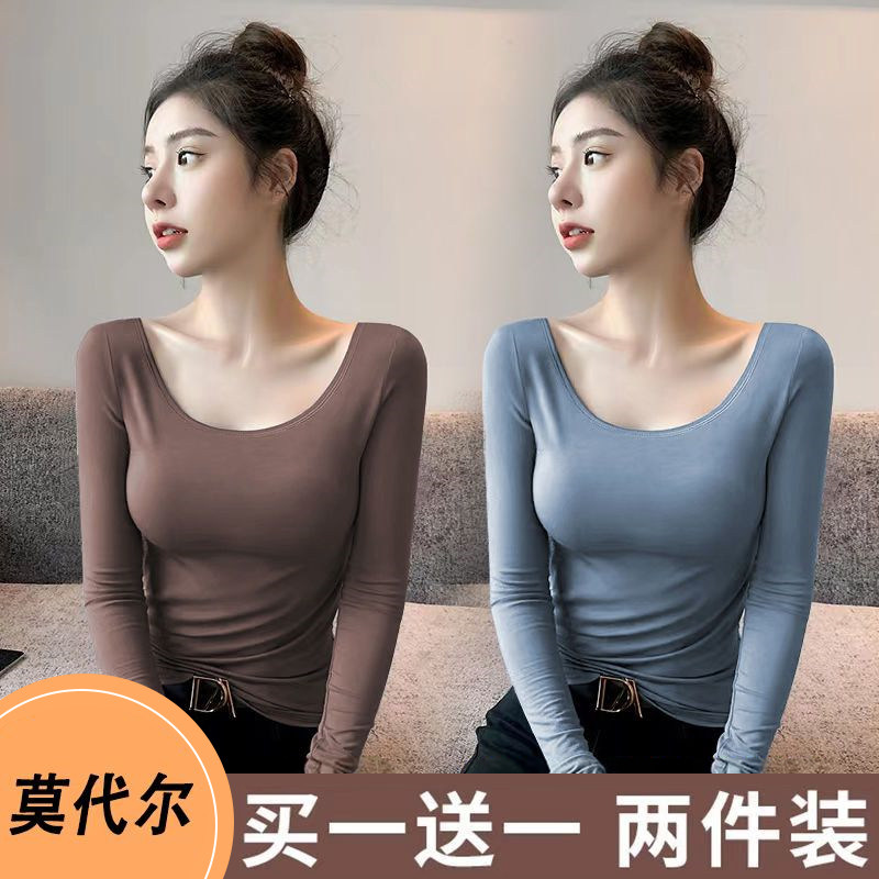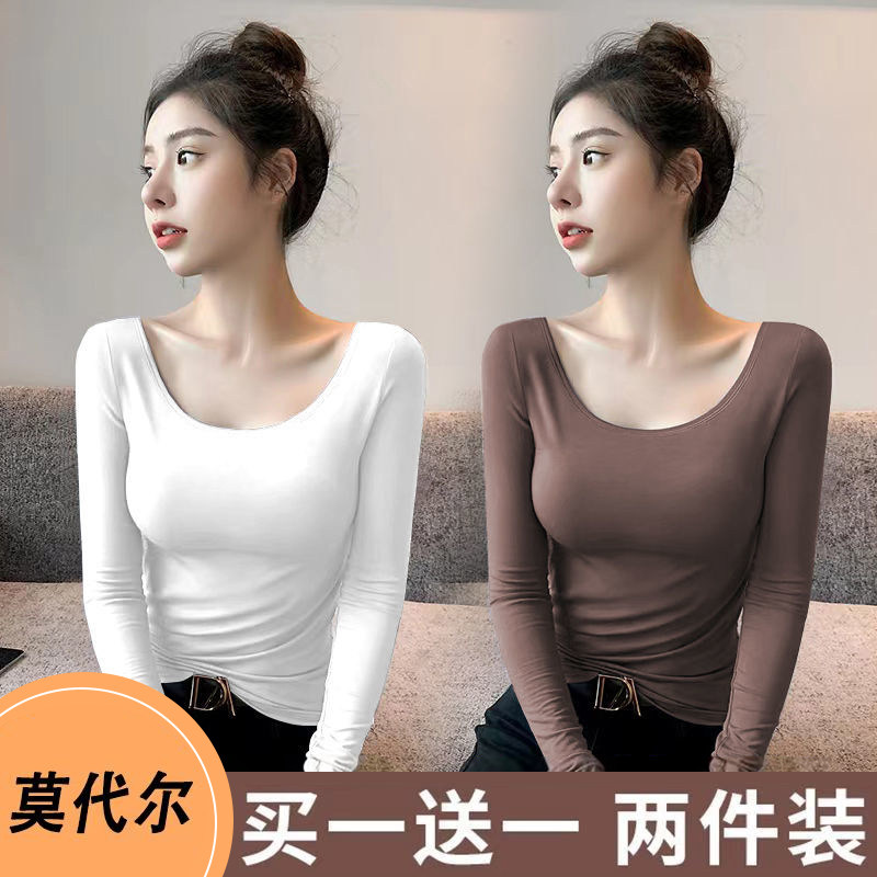 Modal Black Low-Neck Base Layer Shirt for Women, U-Neck Long-Sleeve T-Shirt for Women, Thin and Slim-Fitting Versatile Top for Autumn and Winter