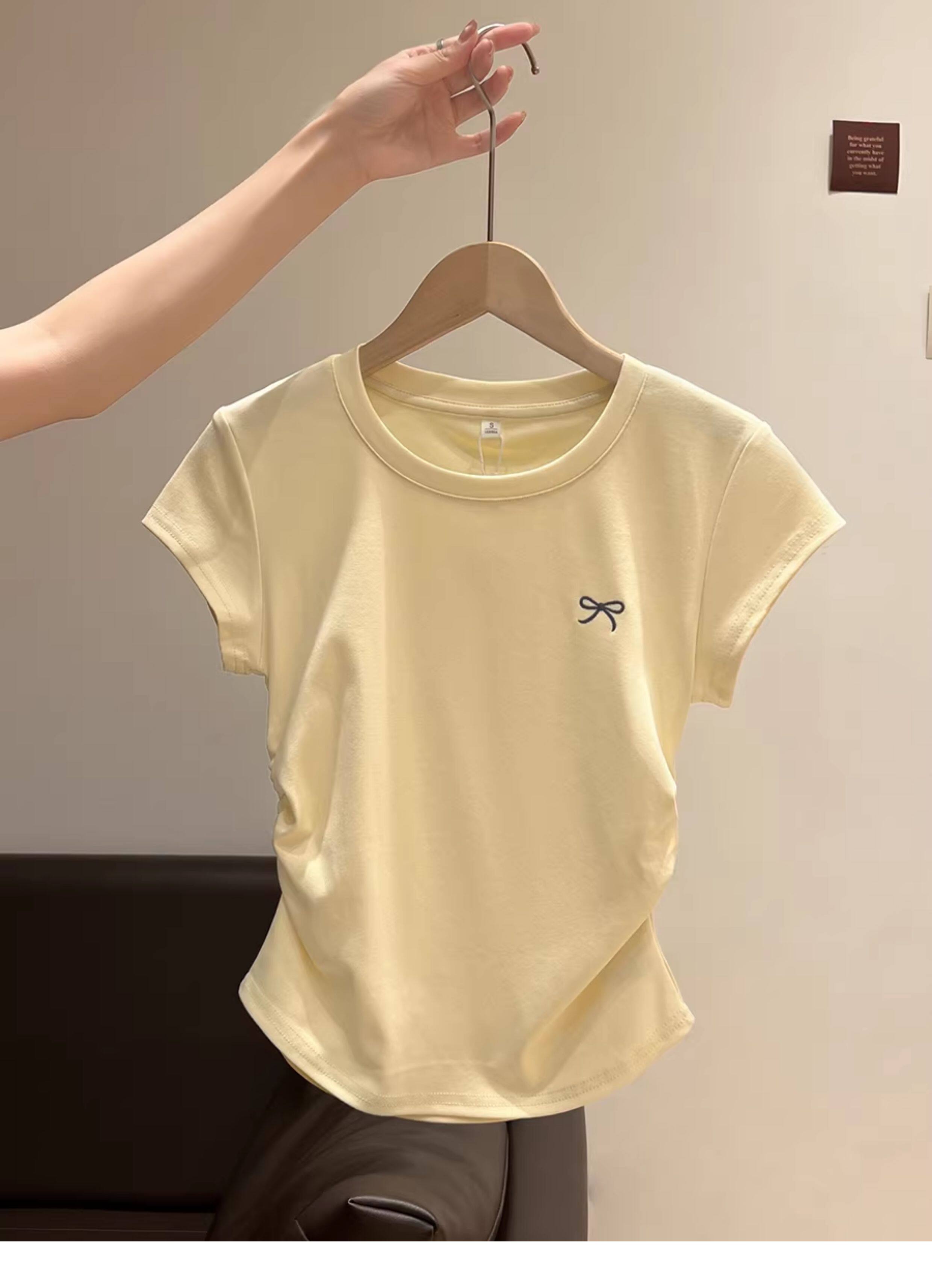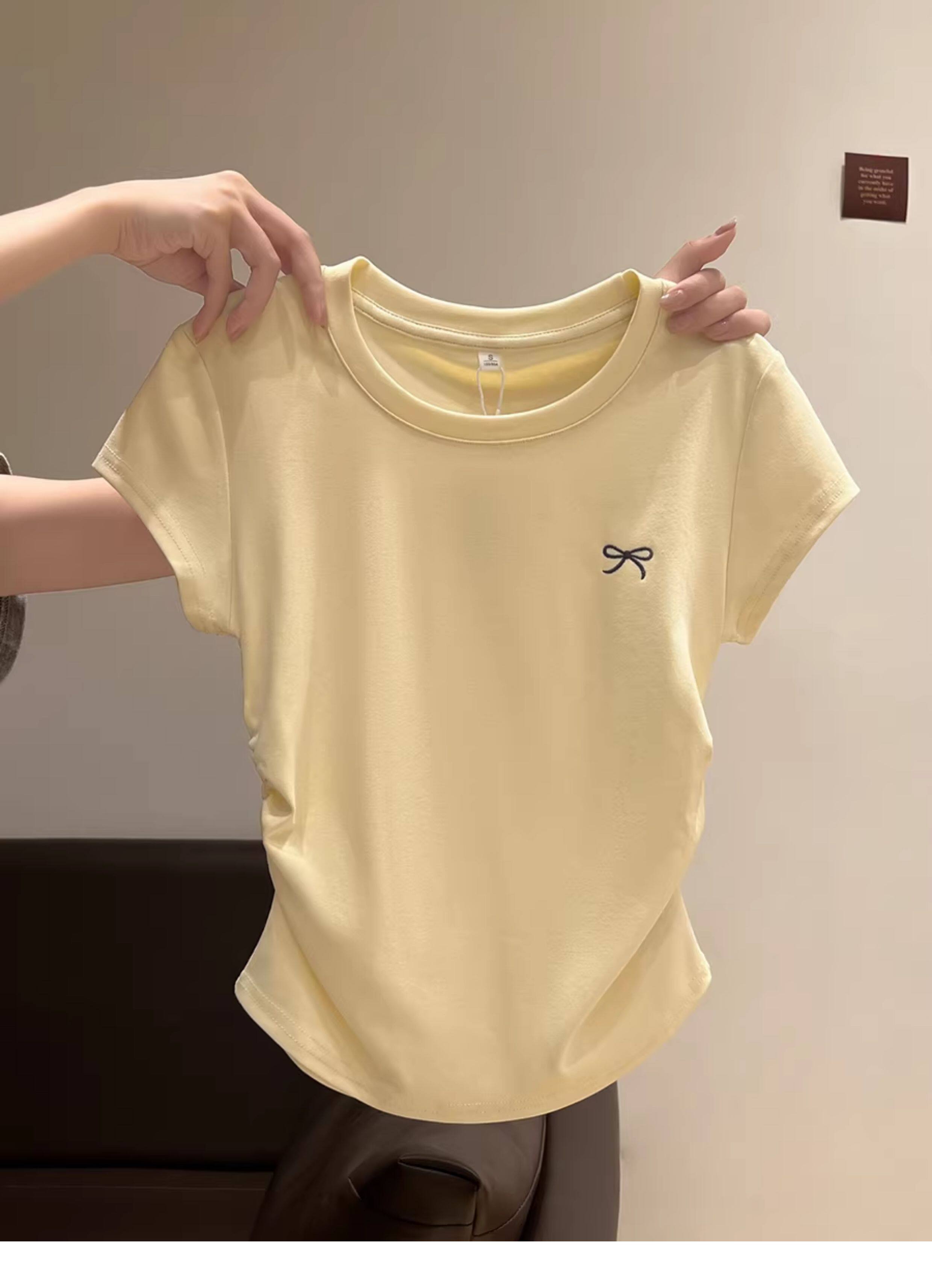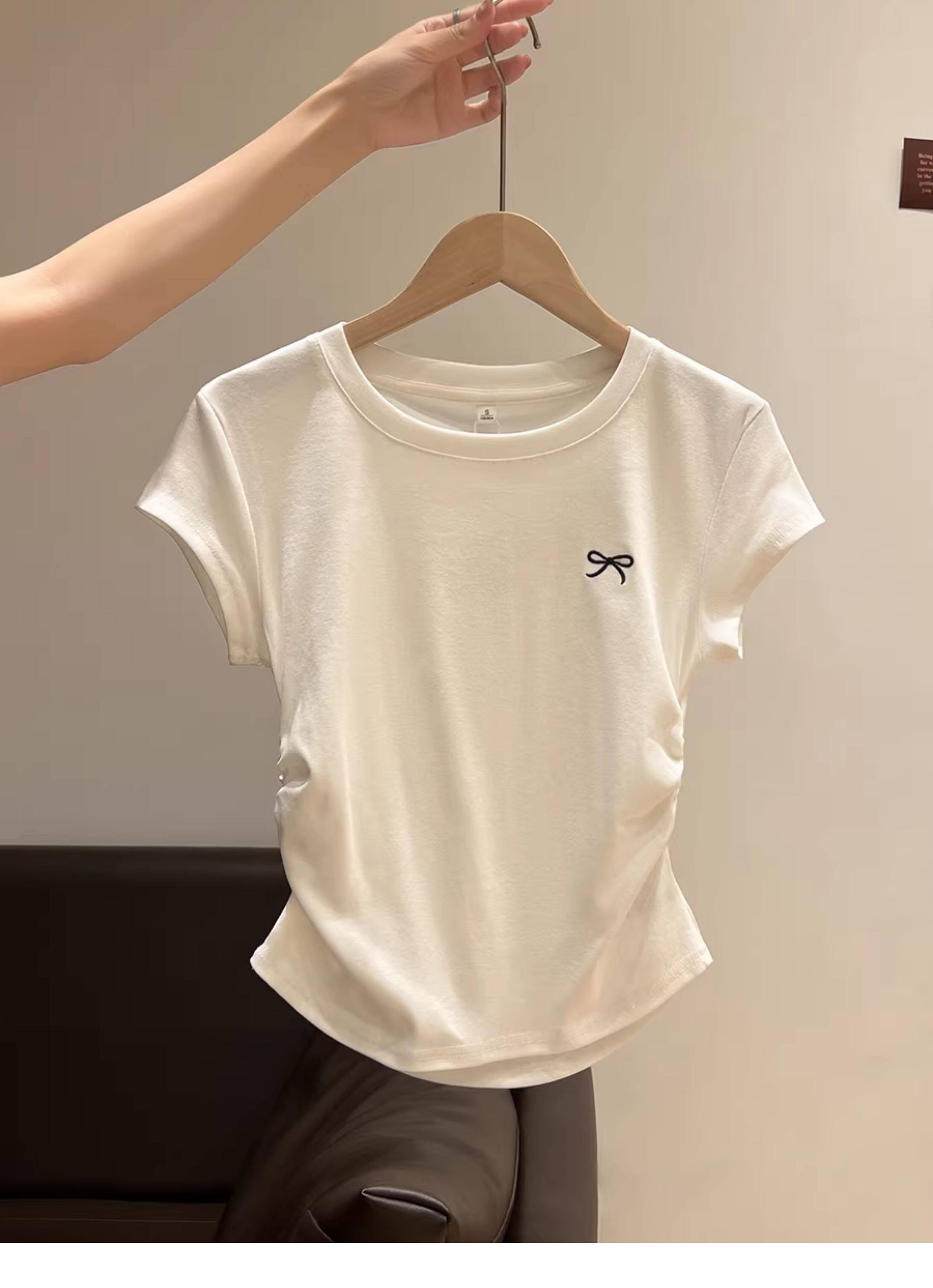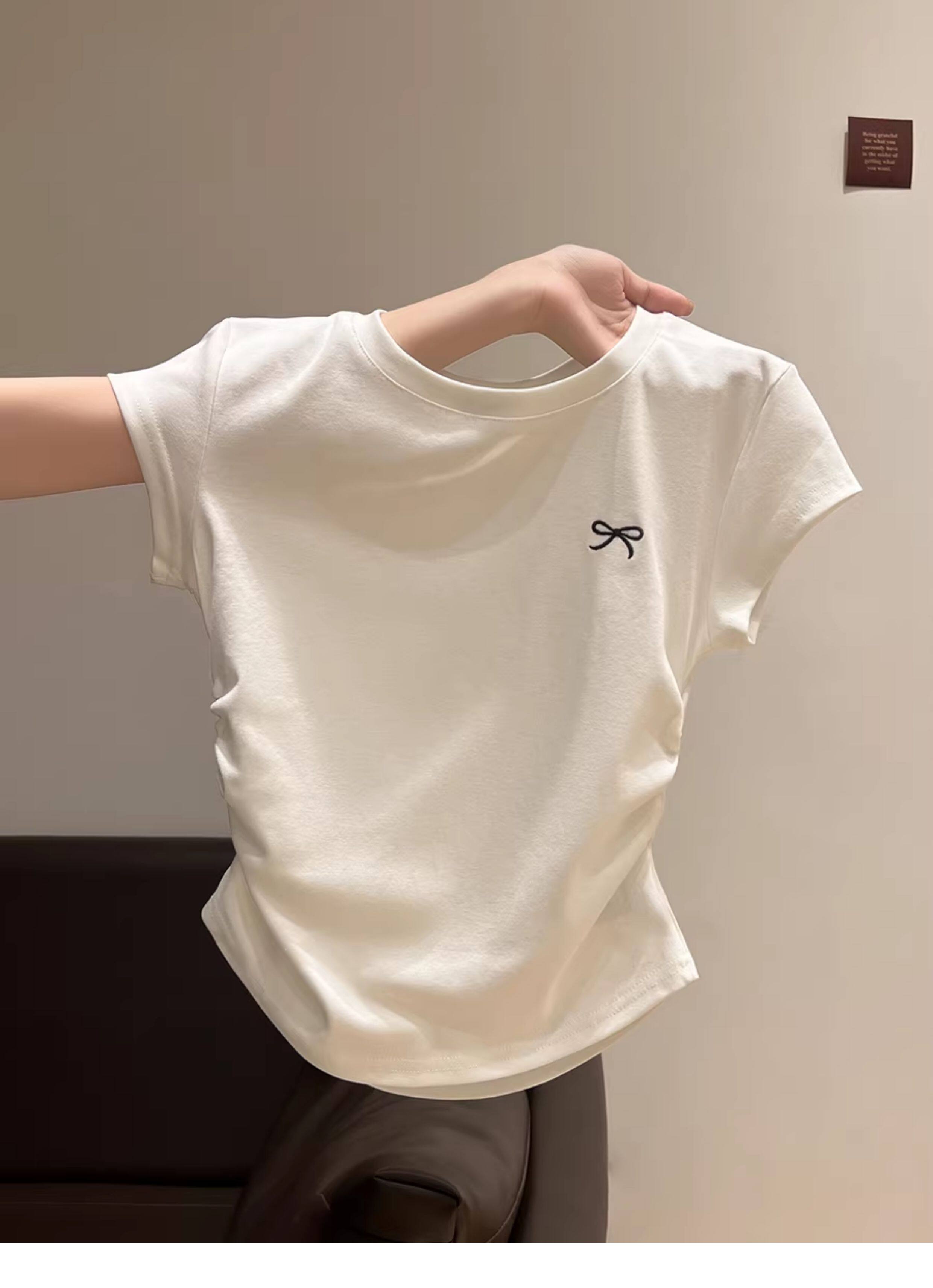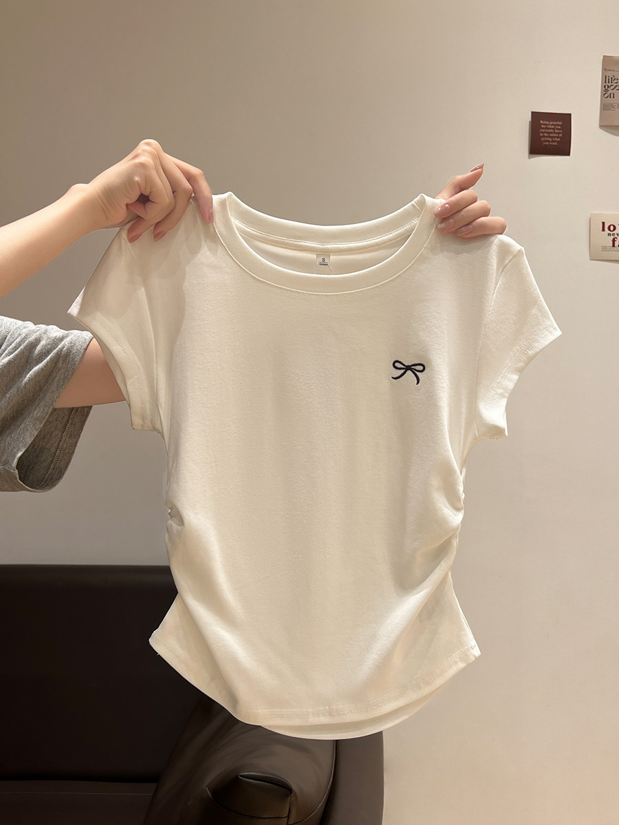 White Bow Embroidered Round Neck Short-Sleeve T-Shirt for Women, Summer Ruched Waist Slim-Fit Short Top with Flutter Sleeves