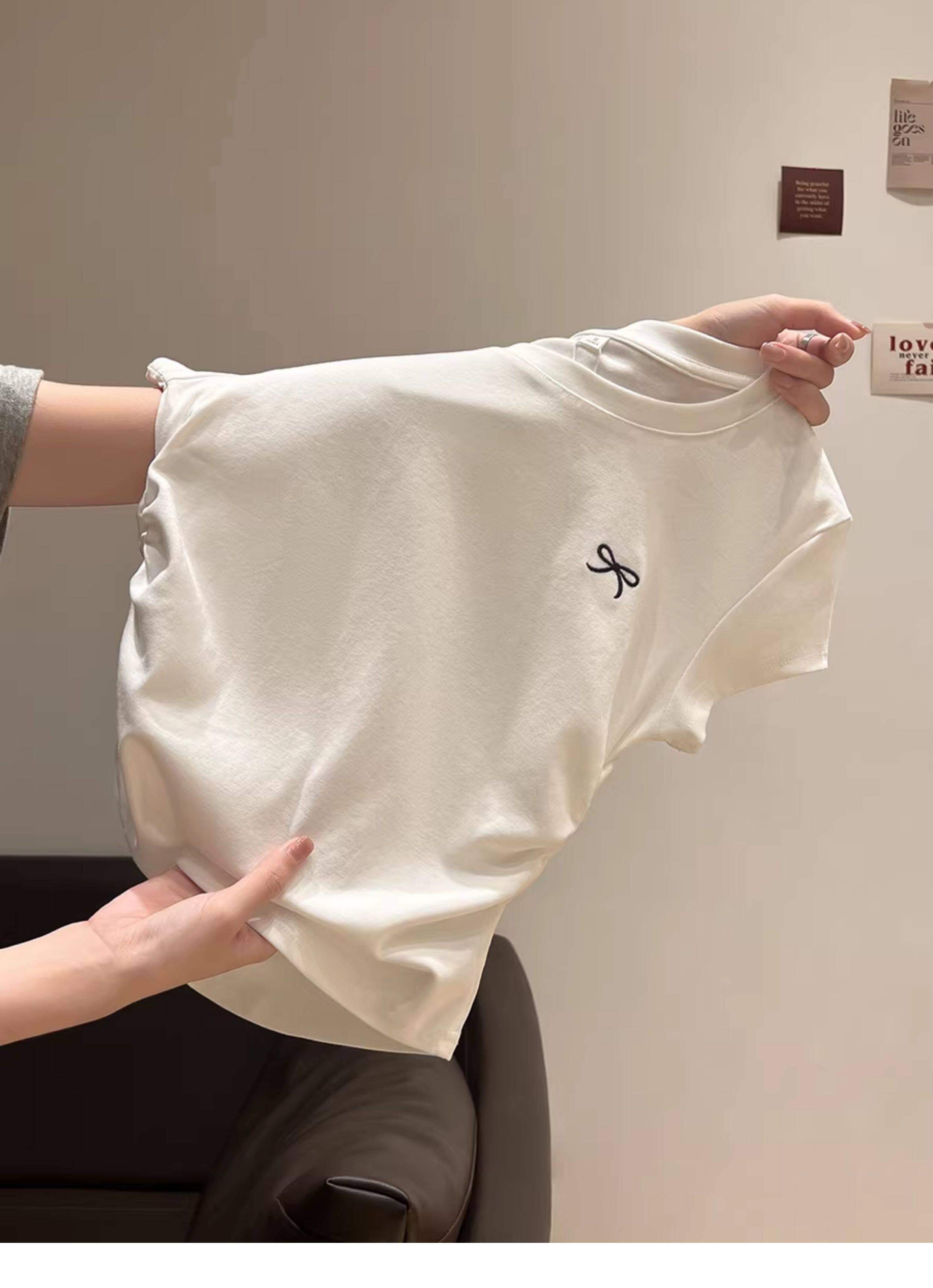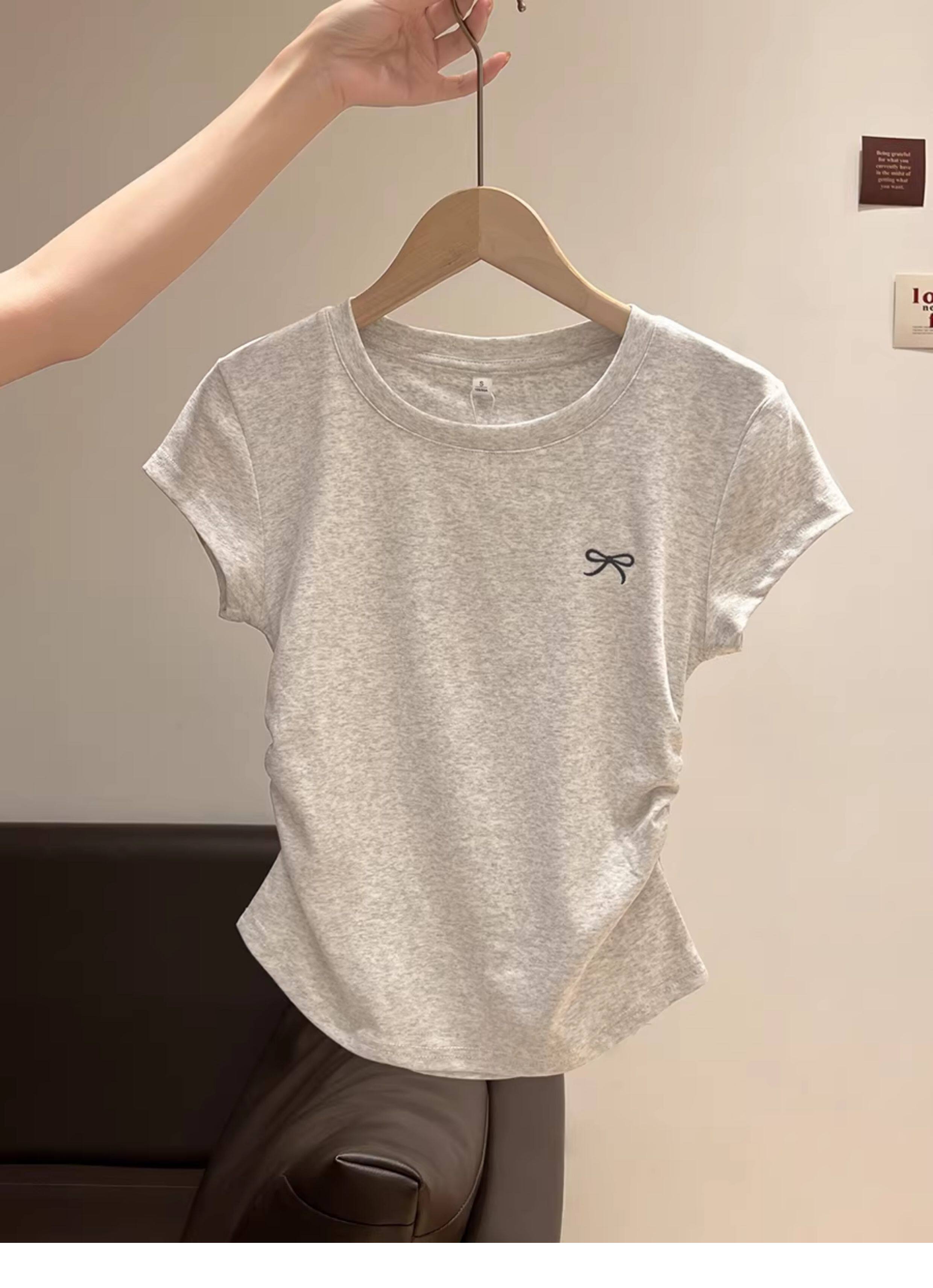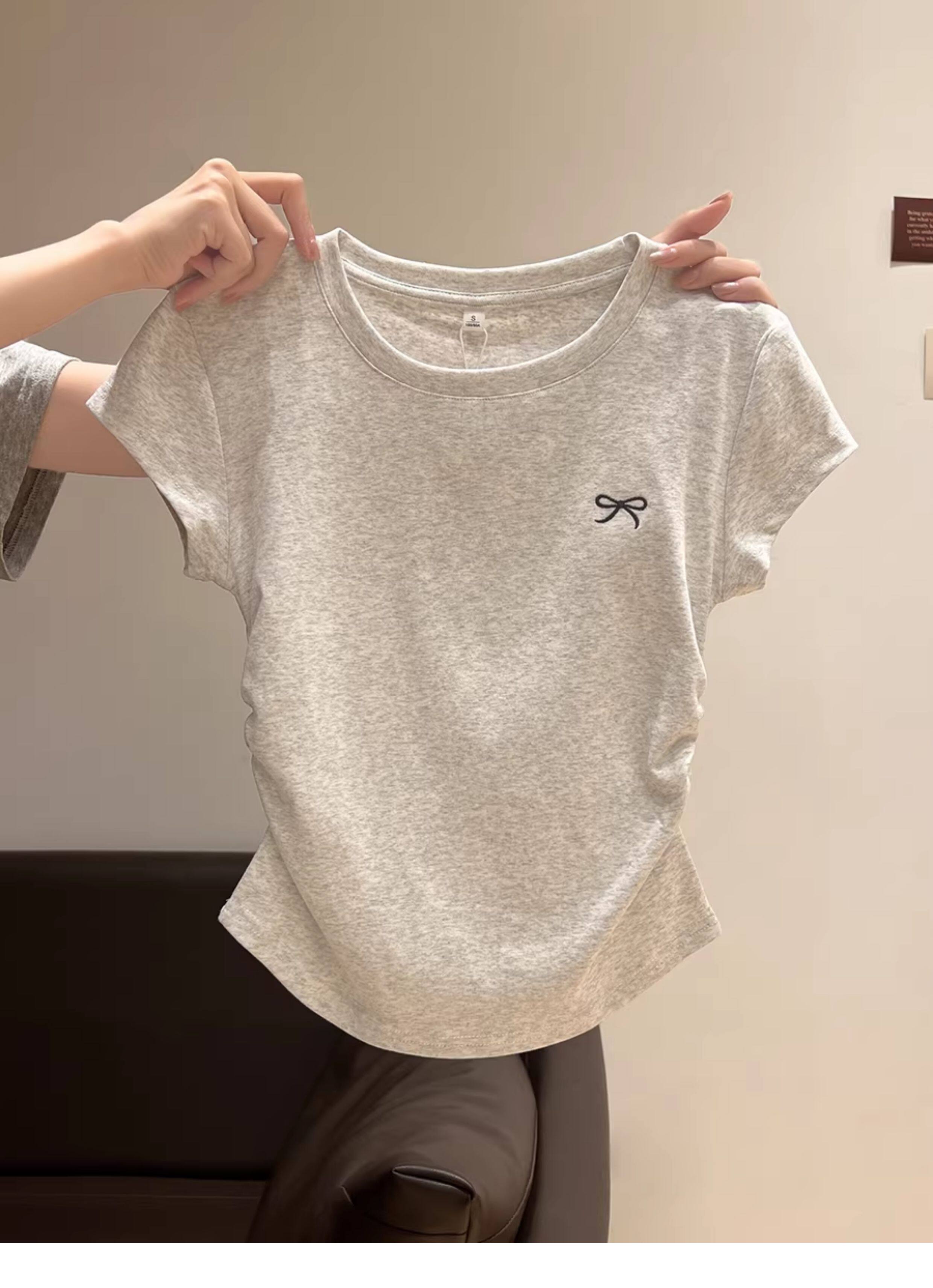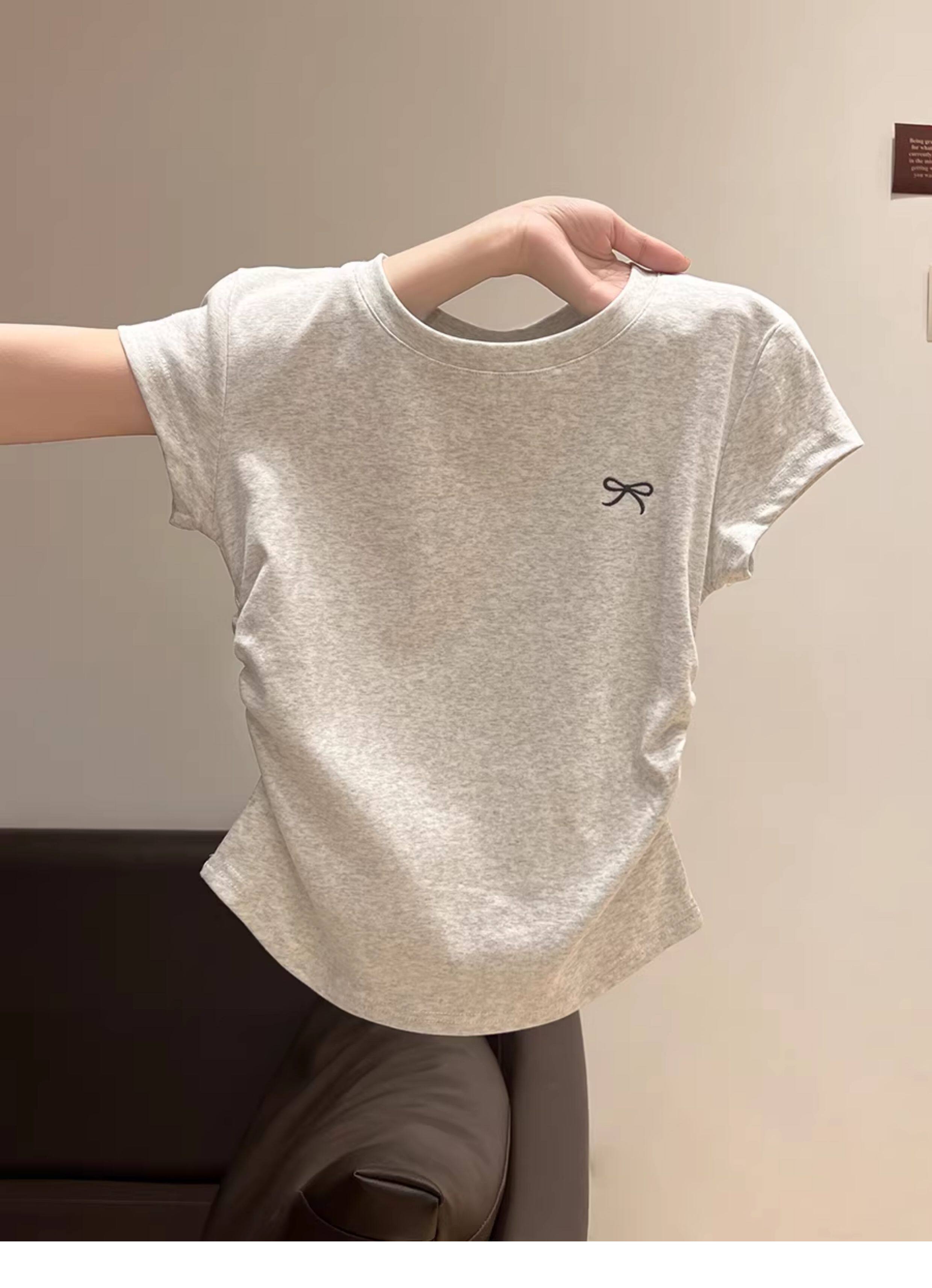 White Bow Embroidered Round Neck Short-Sleeve T-Shirt for Women, Summer Ruched Waist Slim-Fit Short Top with Flutter Sleeves