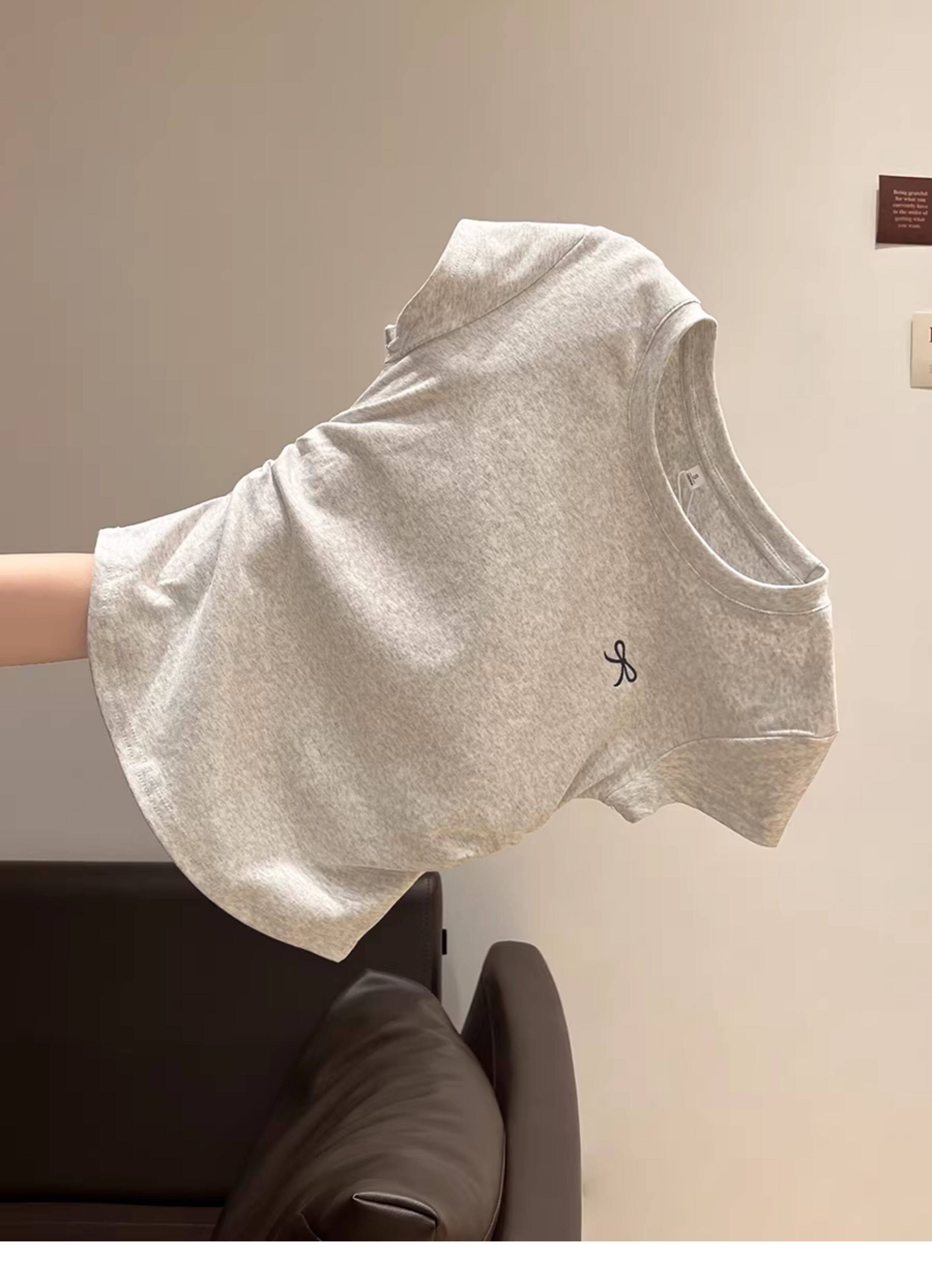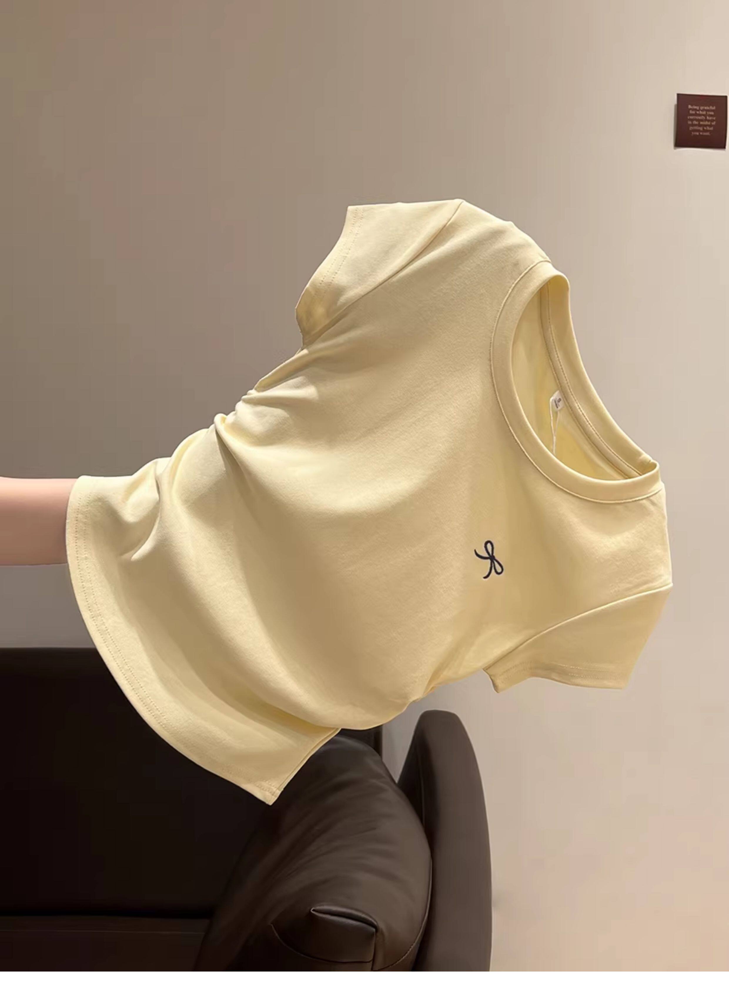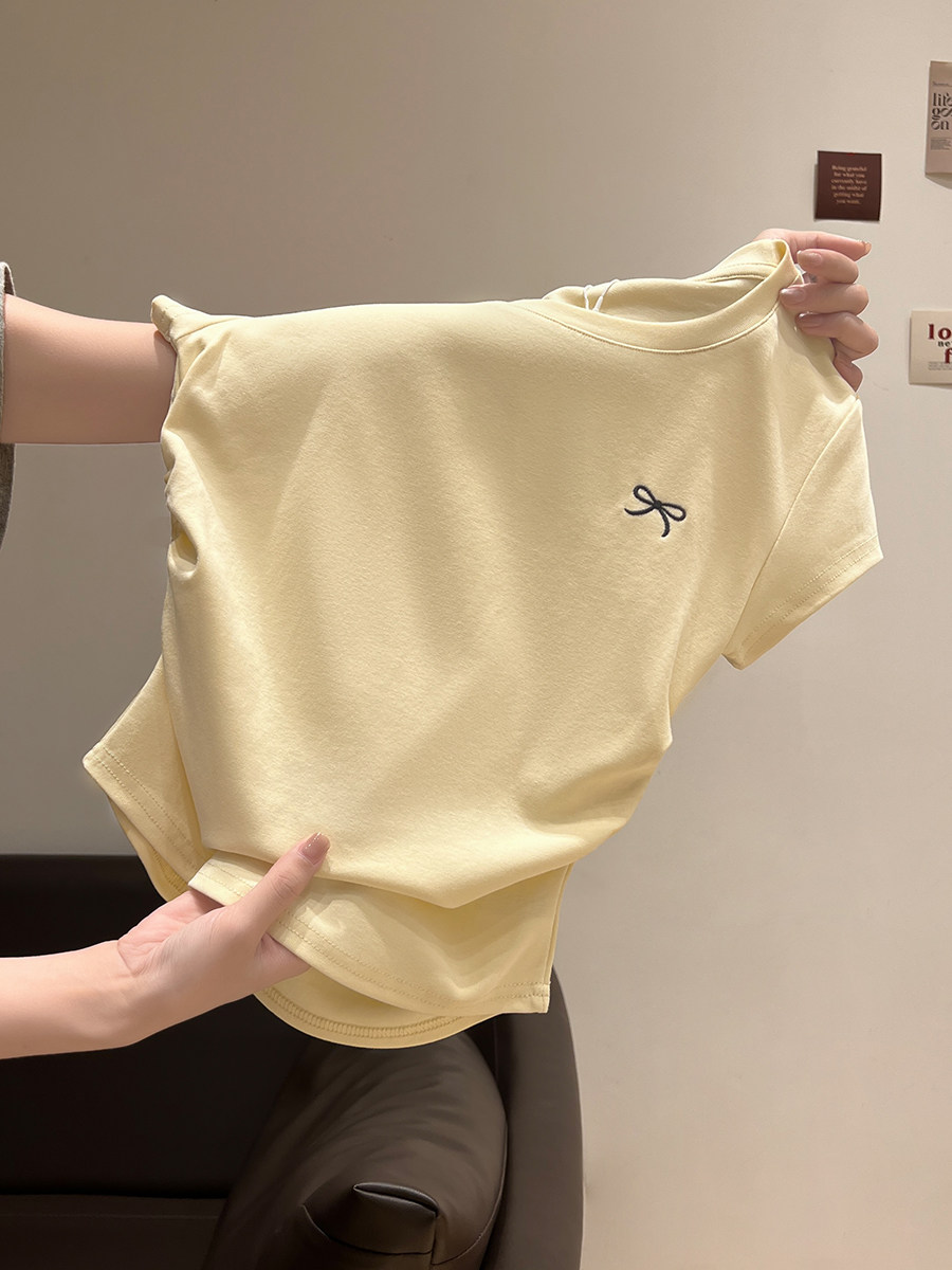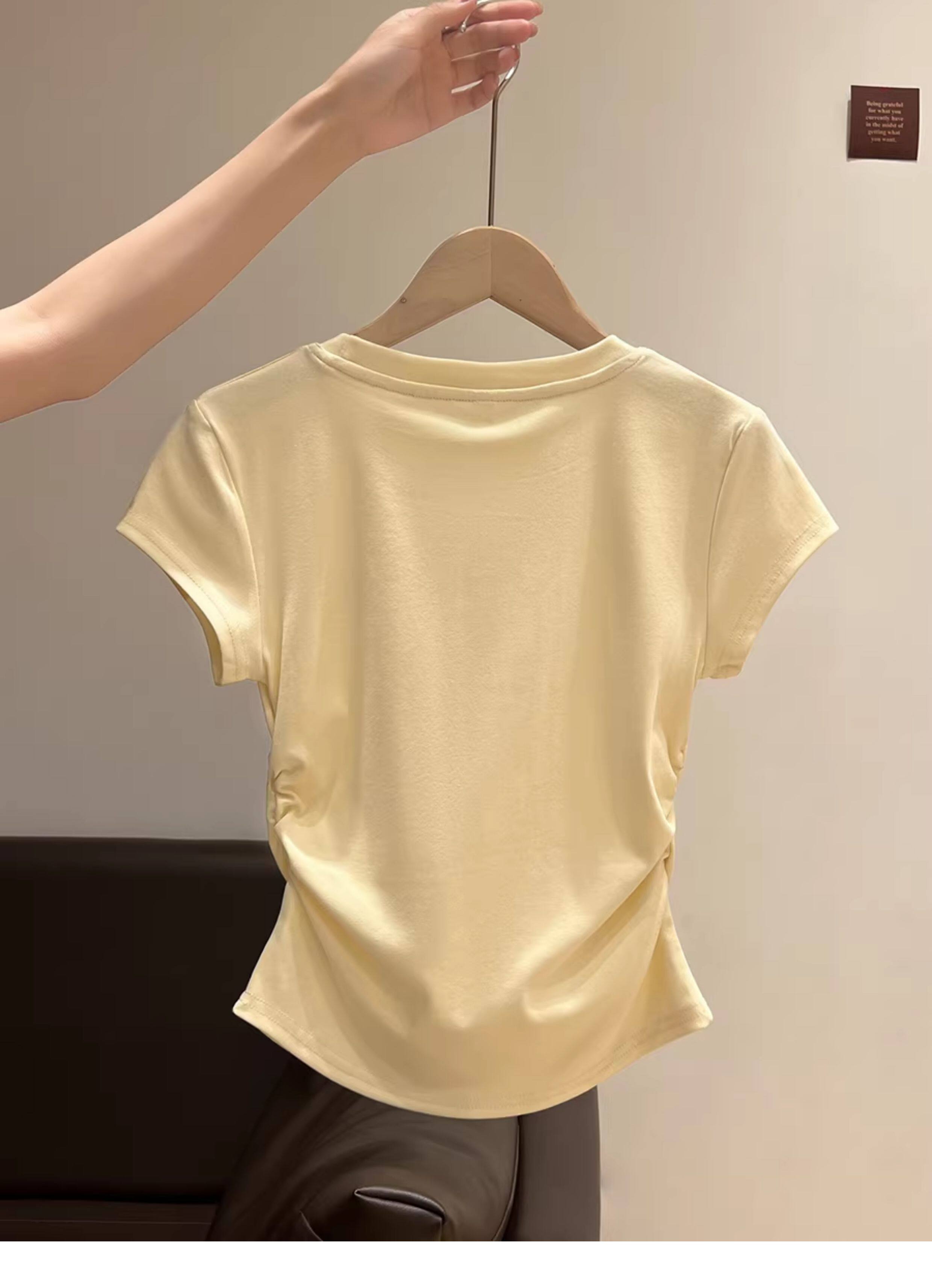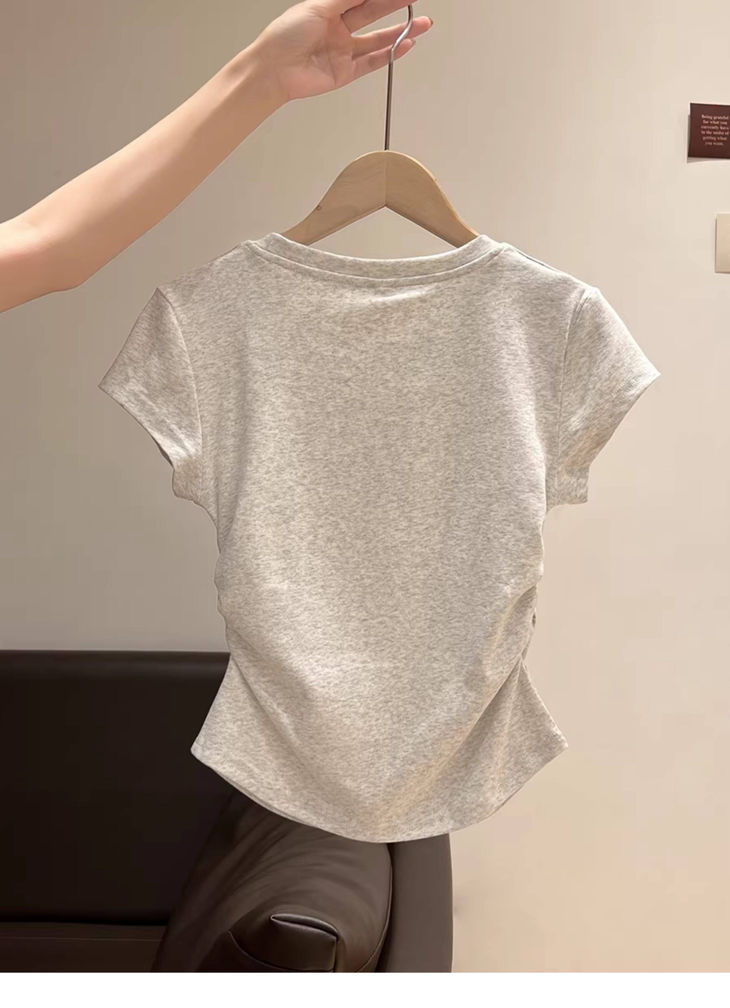 White Bow Embroidered Round Neck Short-Sleeve T-Shirt for Women, Summer Ruched Waist Slim-Fit Short Top with Flutter Sleeves