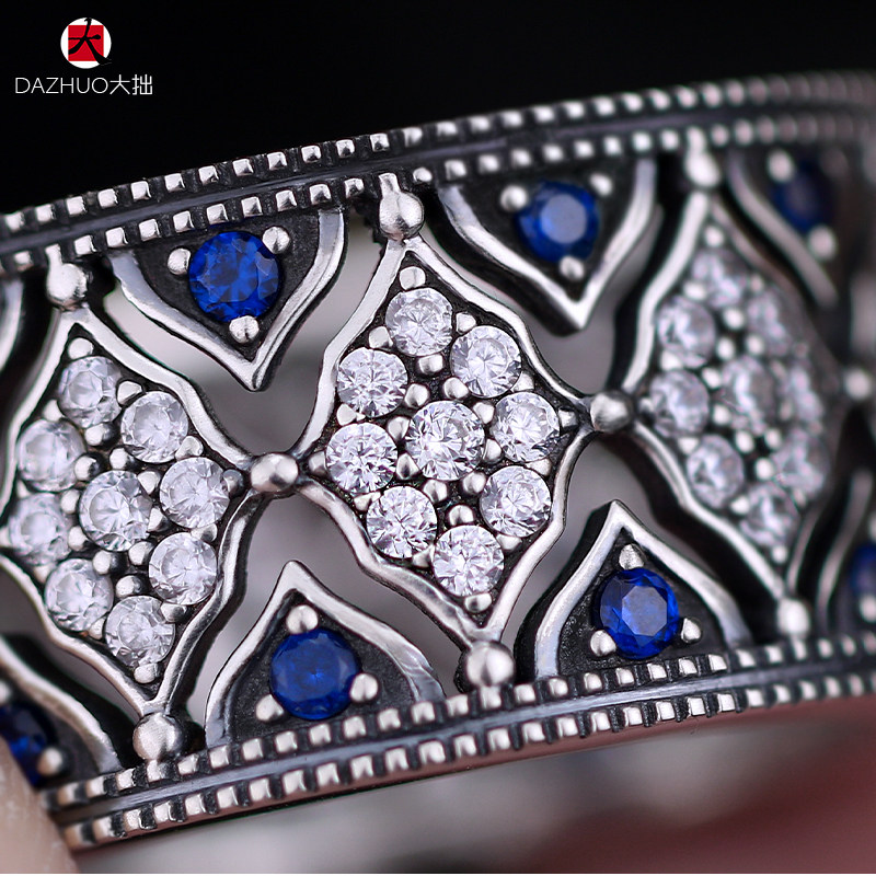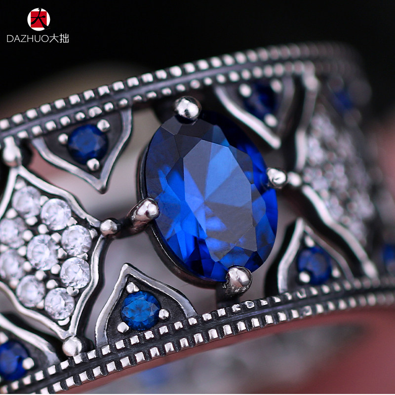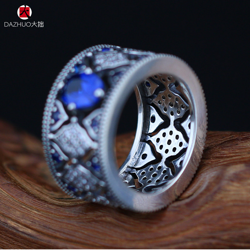 Da Zhuo Sapphire Full Diamond Ring for Men, Vintage 925 Sterling Silver, Trendy Style for Middle Finger, Single, Closed, Luxurious Silver Jewelry