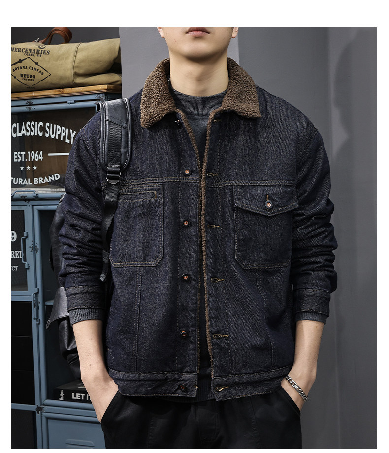 2026 Spring Fleece-Lined Warm Lambswool Denim Jacket for Men, American Retro Washed Workwear Jacket with Turn-Down Collar Cotton Coat