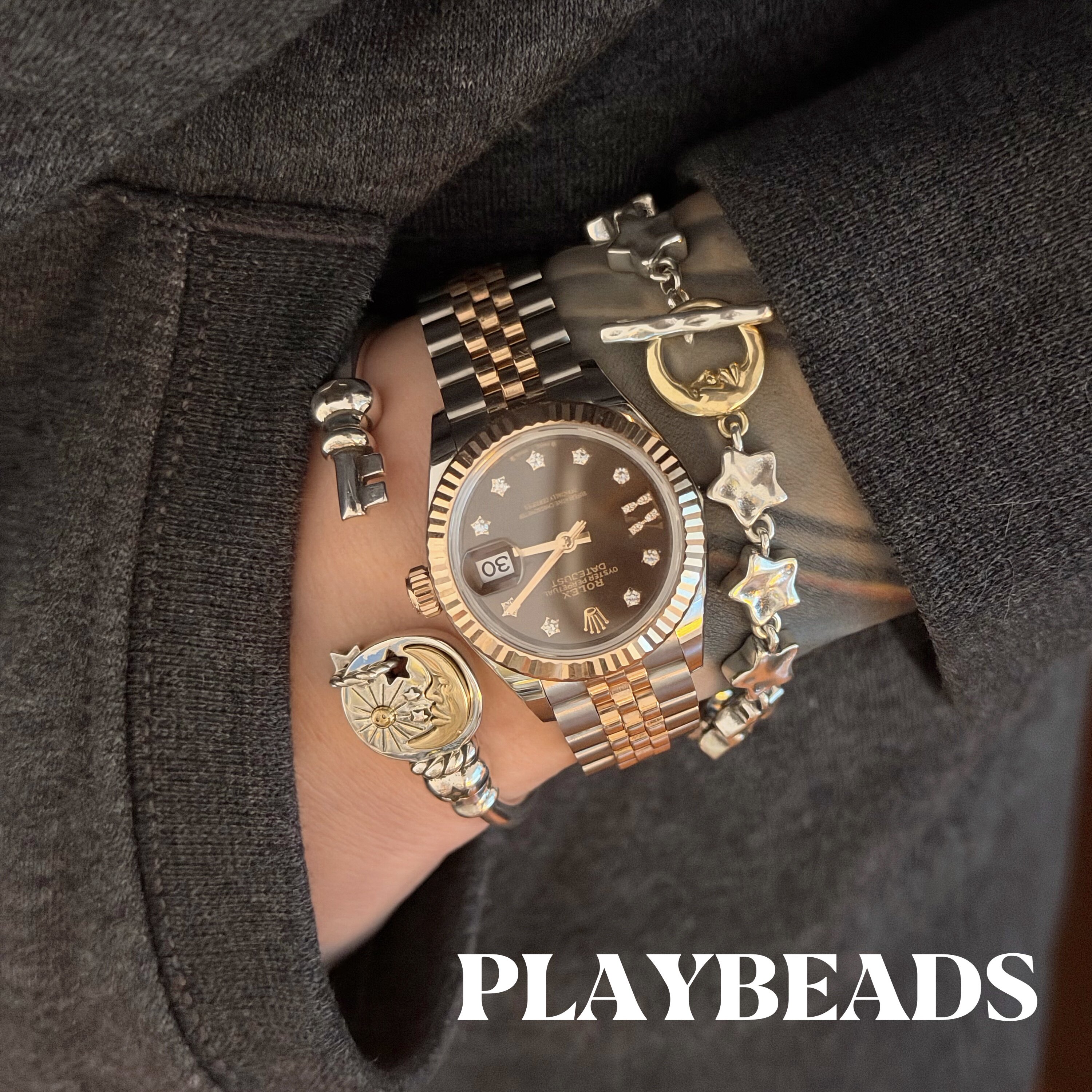Playbeads Original Design S925 Sterling Silver Vintage Texture Distressed Solid Star and Moon Ot Clasp Bracelet