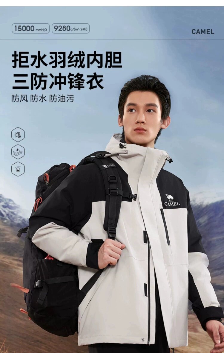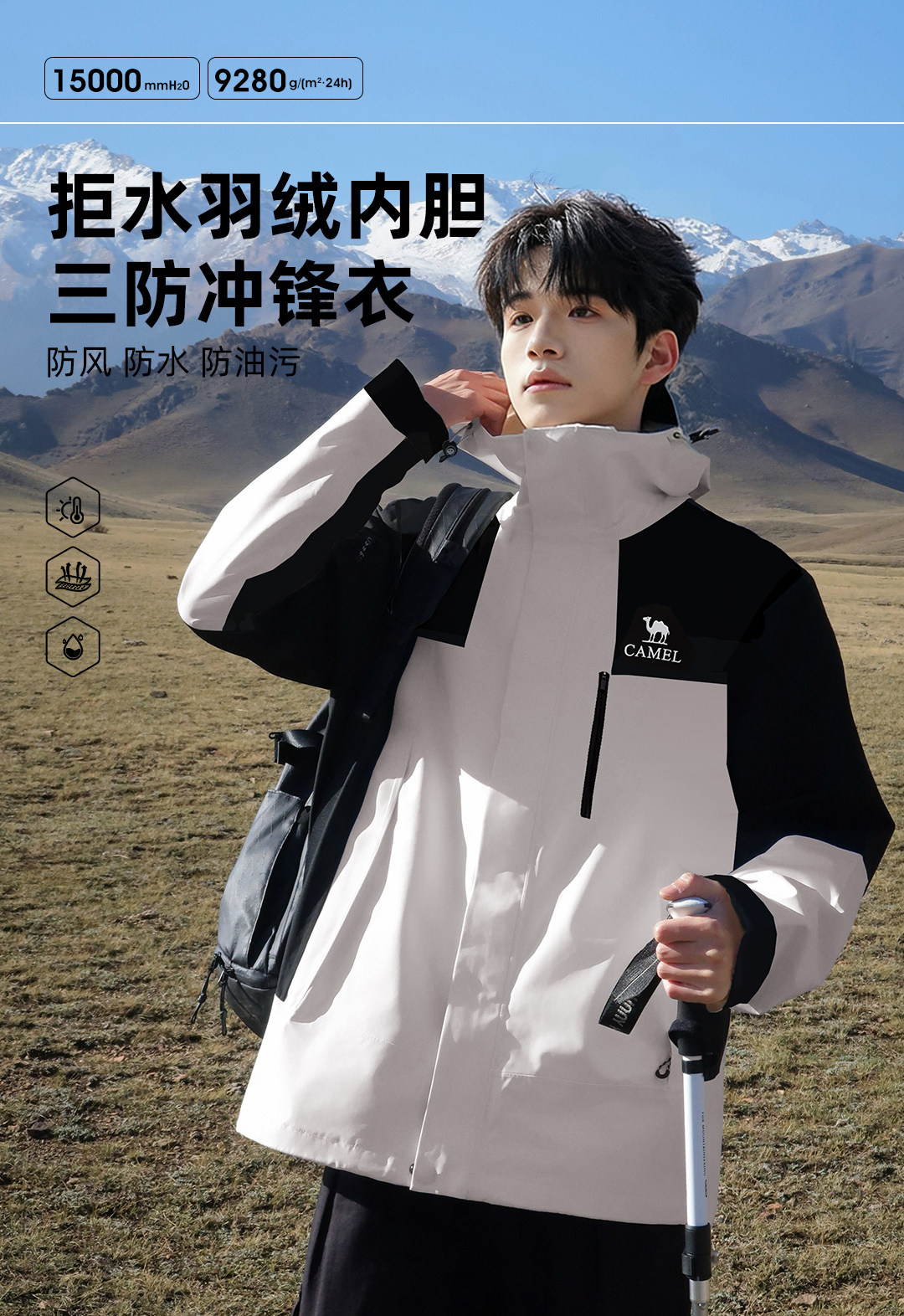 Camel Outdoor Jacket Men's 3-in-1 2026 Spring and Summer Windproof Waterproof Hiking and Mountaineering Jacket Women's