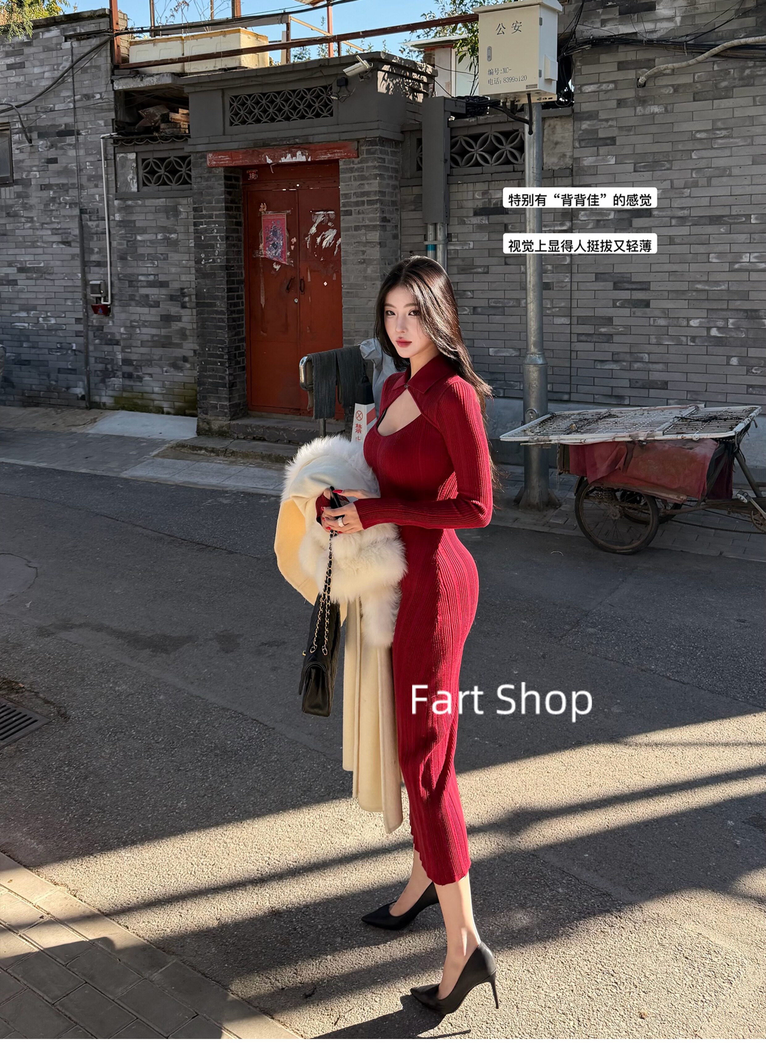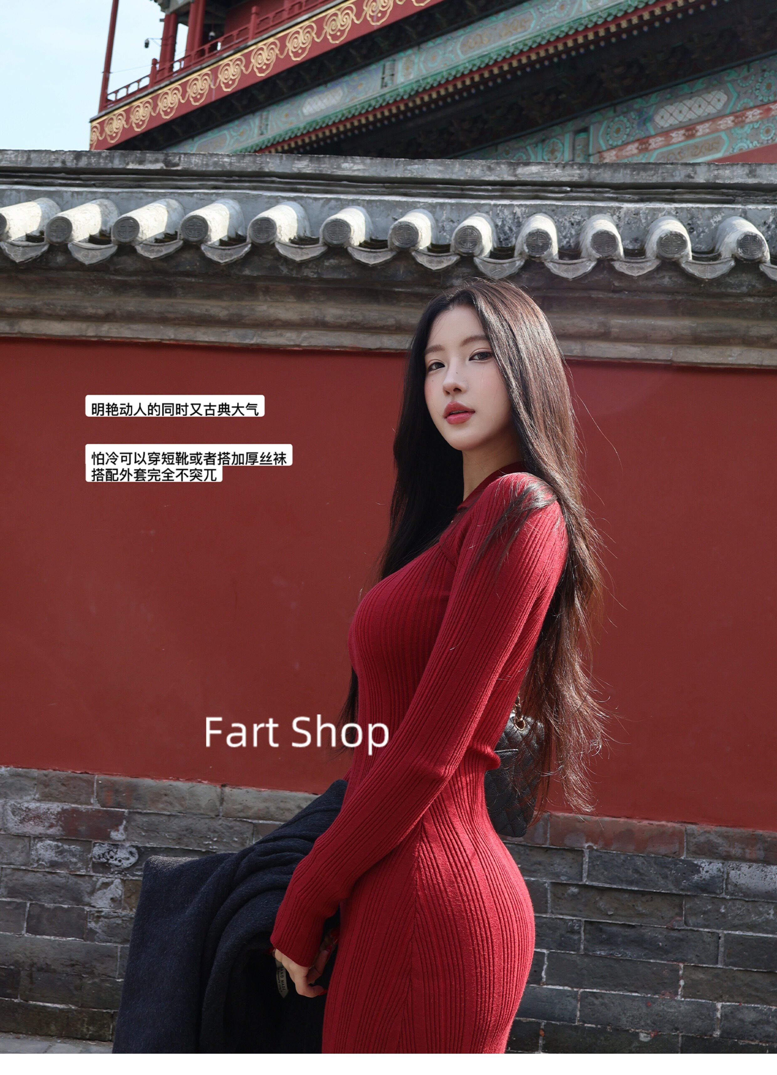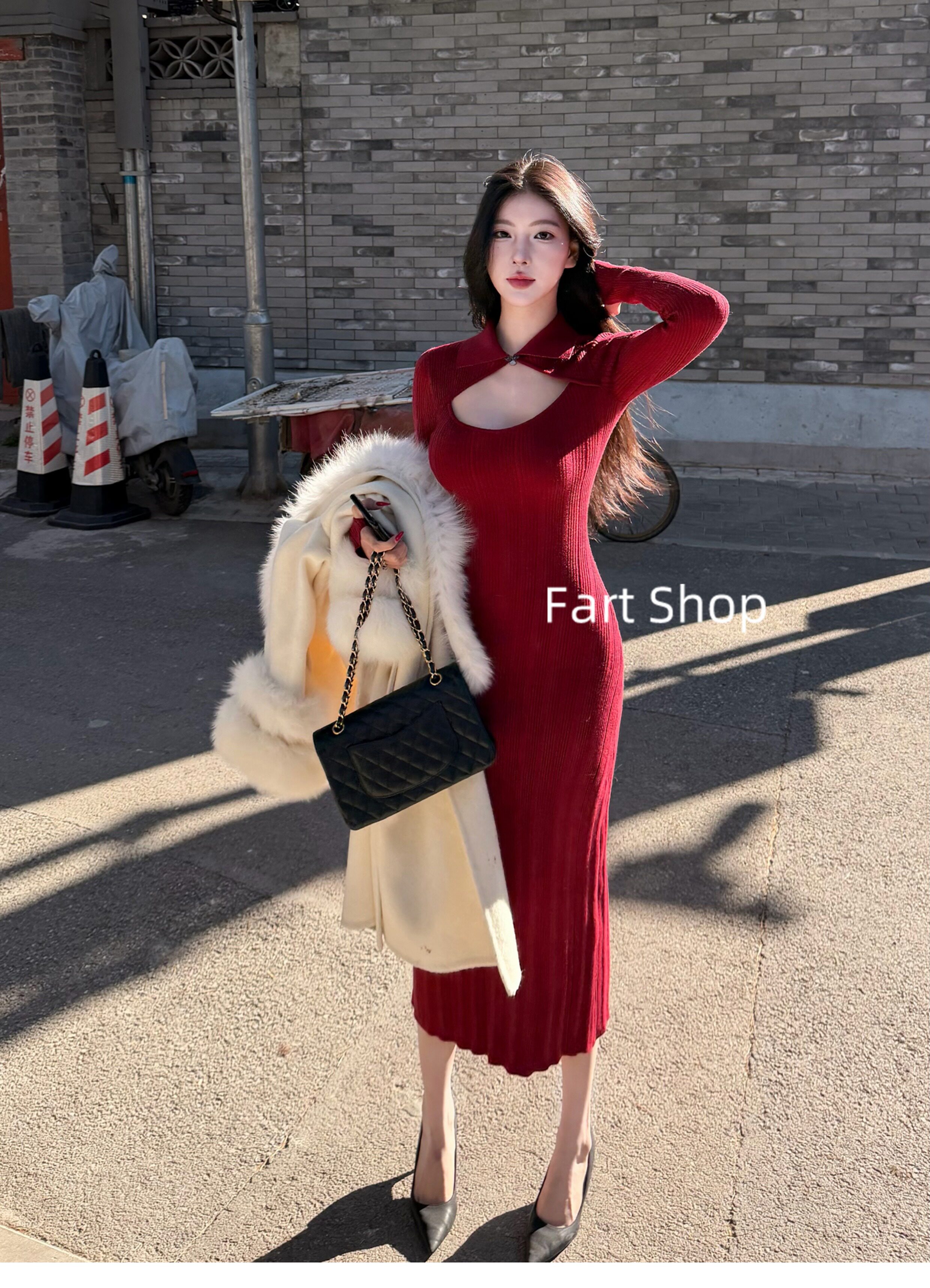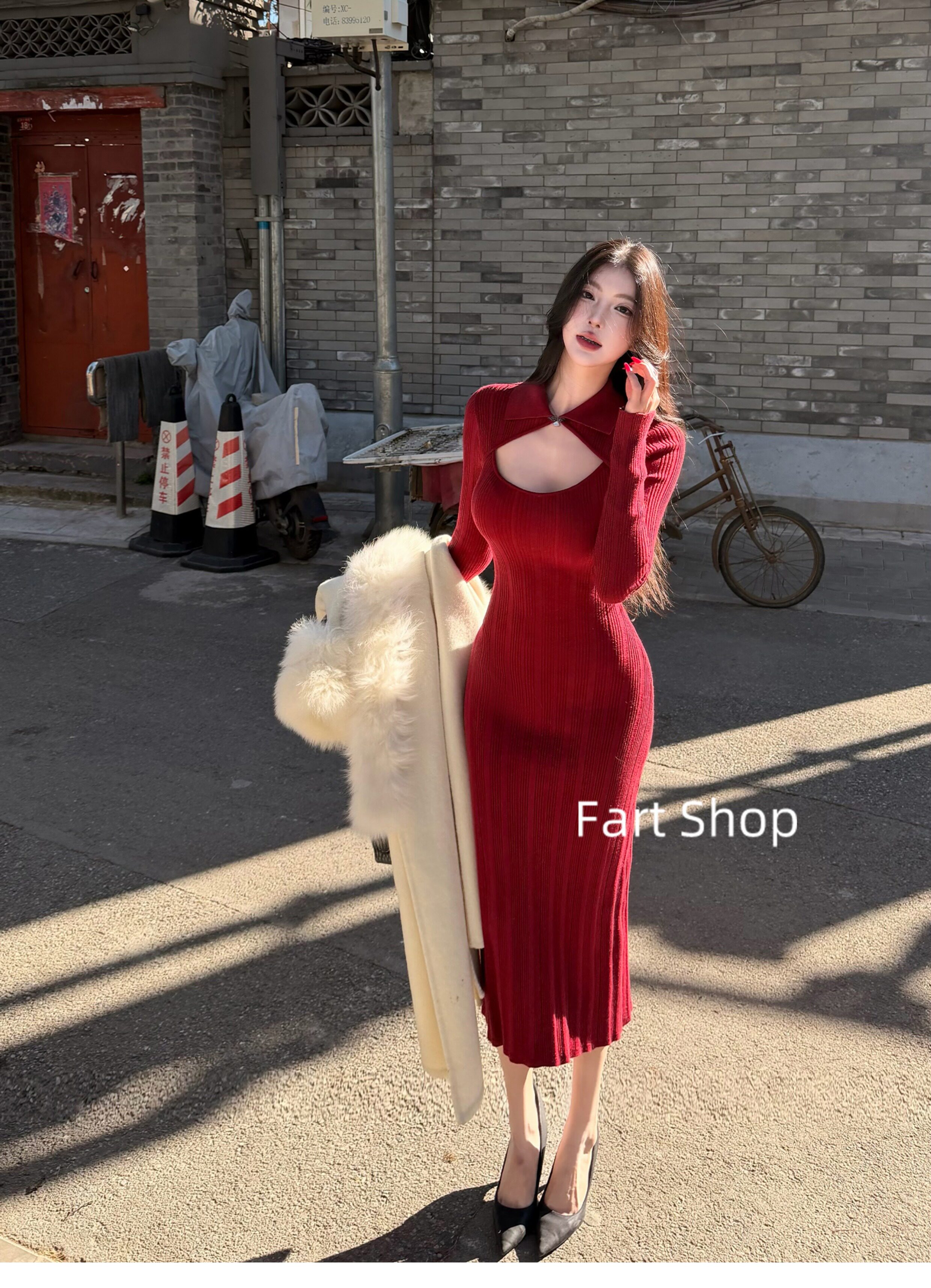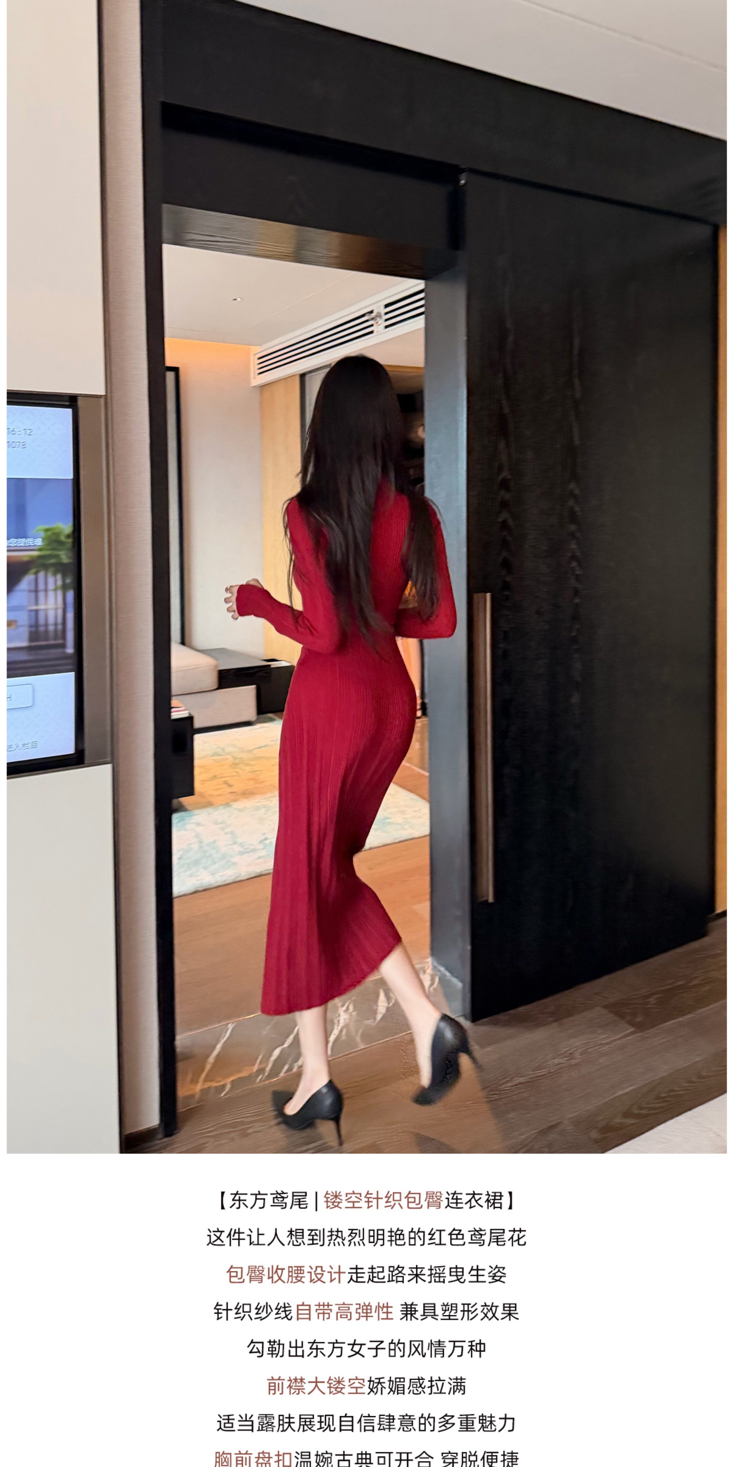 【Fart Shop】Oriental Iris Textured Hollow Slim Fit Autumn and Winter Christmas Red Bodycon Dress