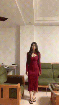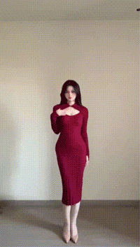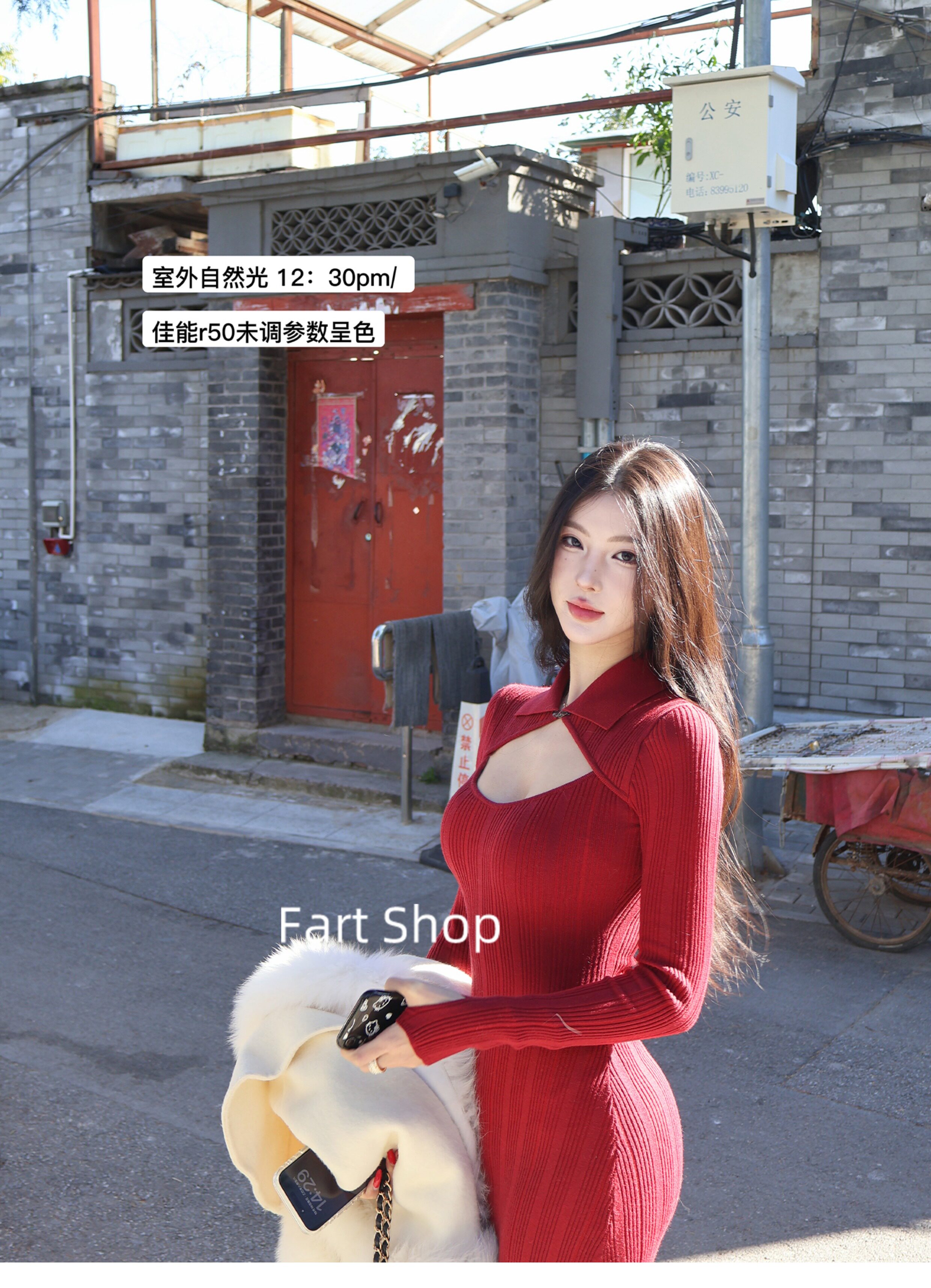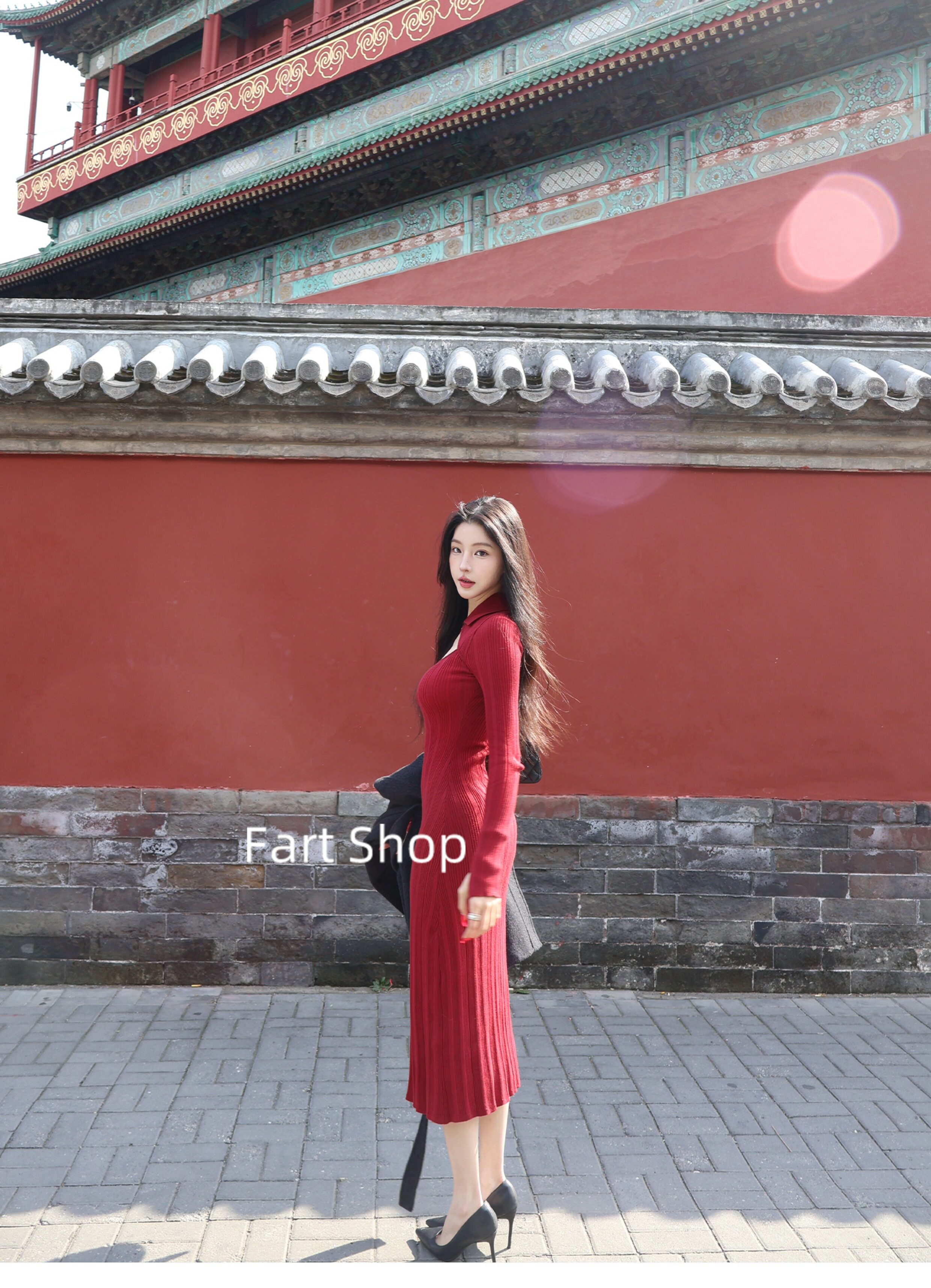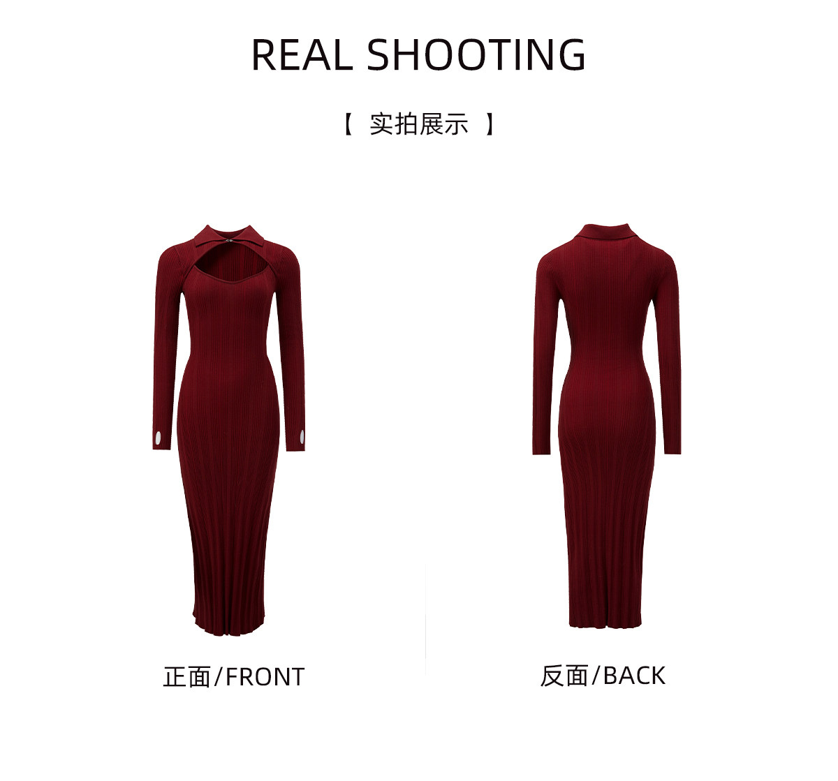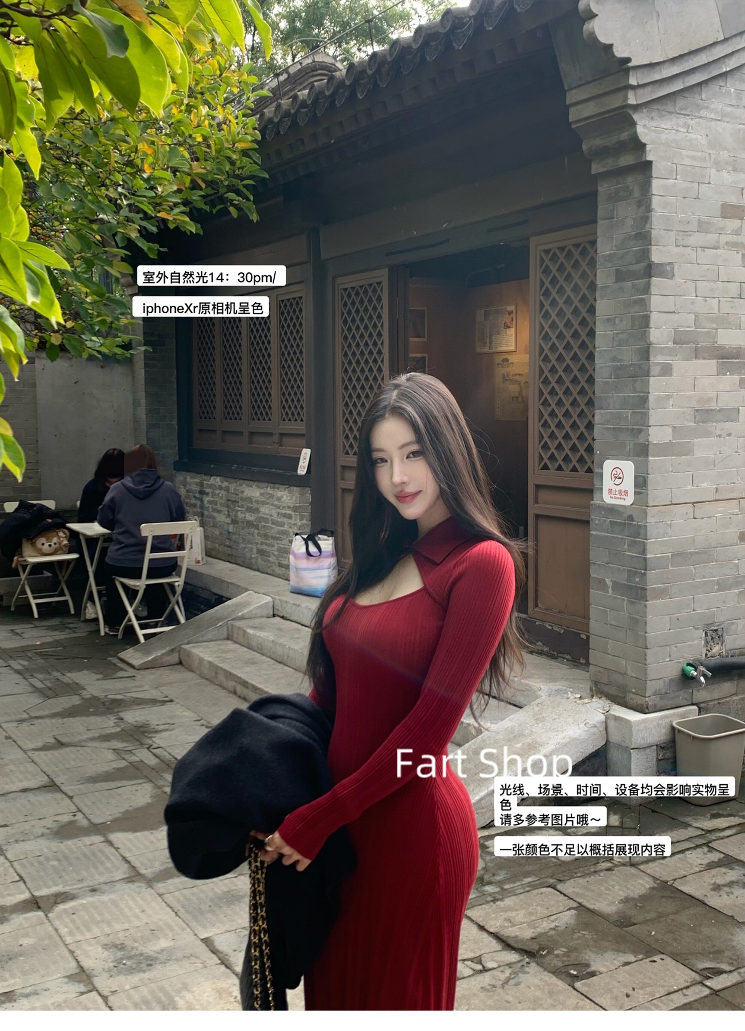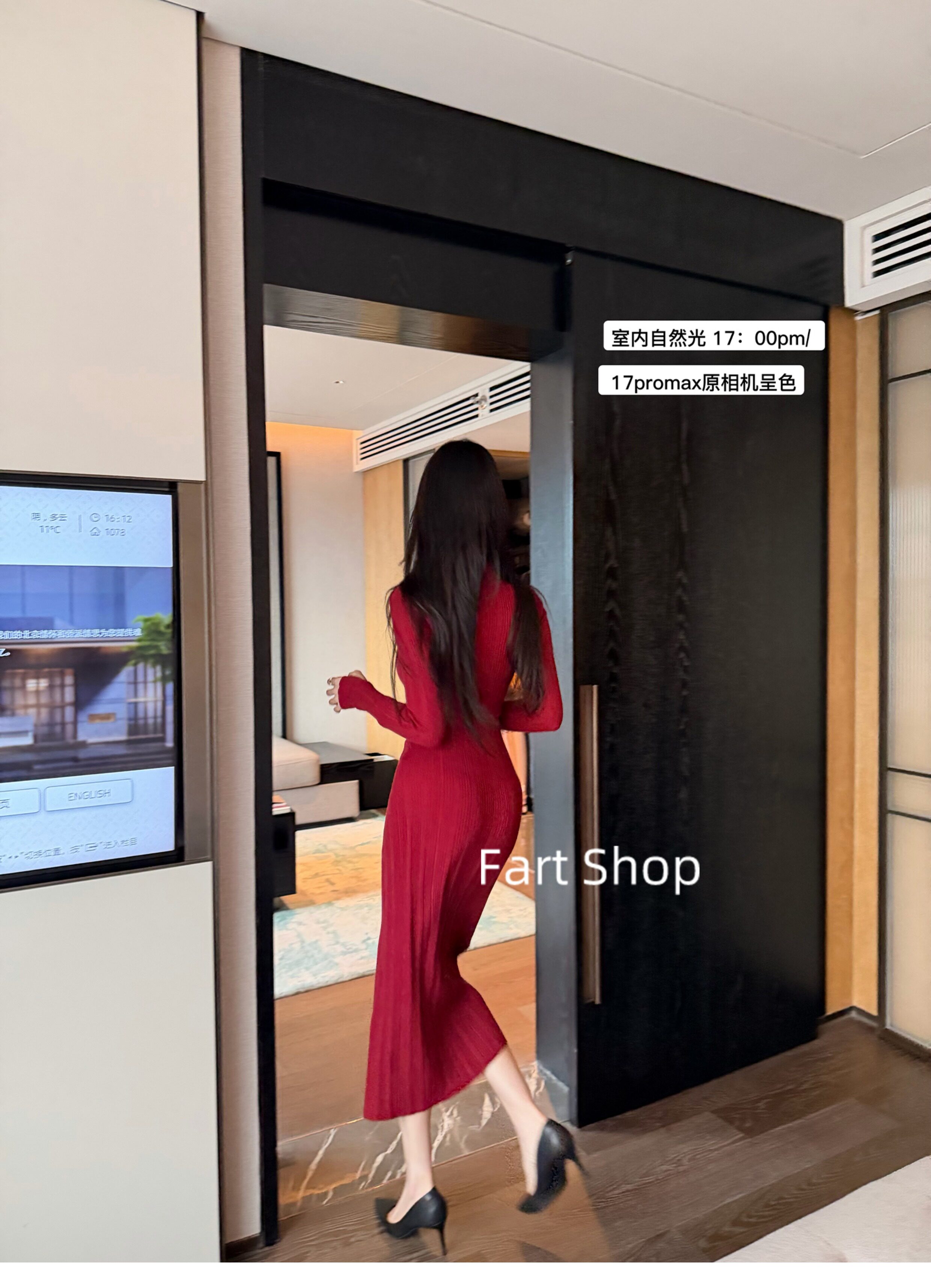 【Fart Shop】Oriental Iris Textured Hollow Slim Fit Autumn and Winter Christmas Red Bodycon Dress