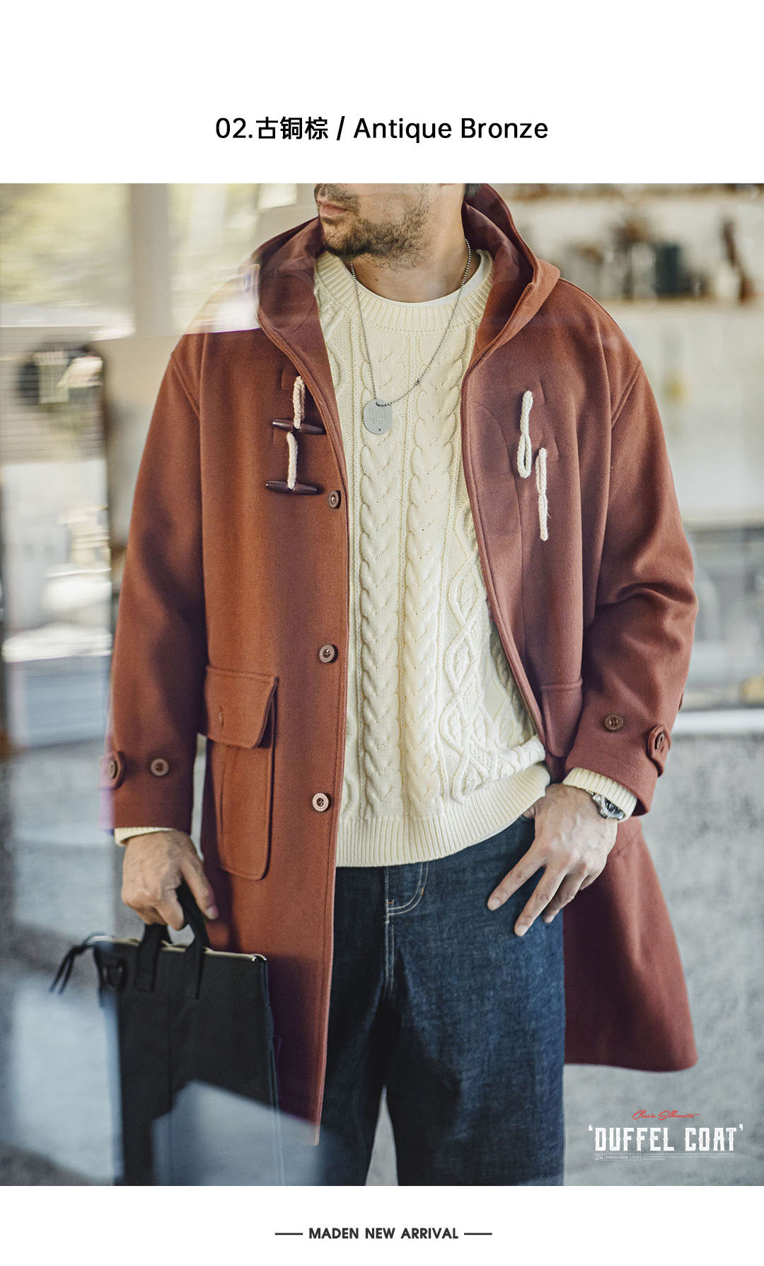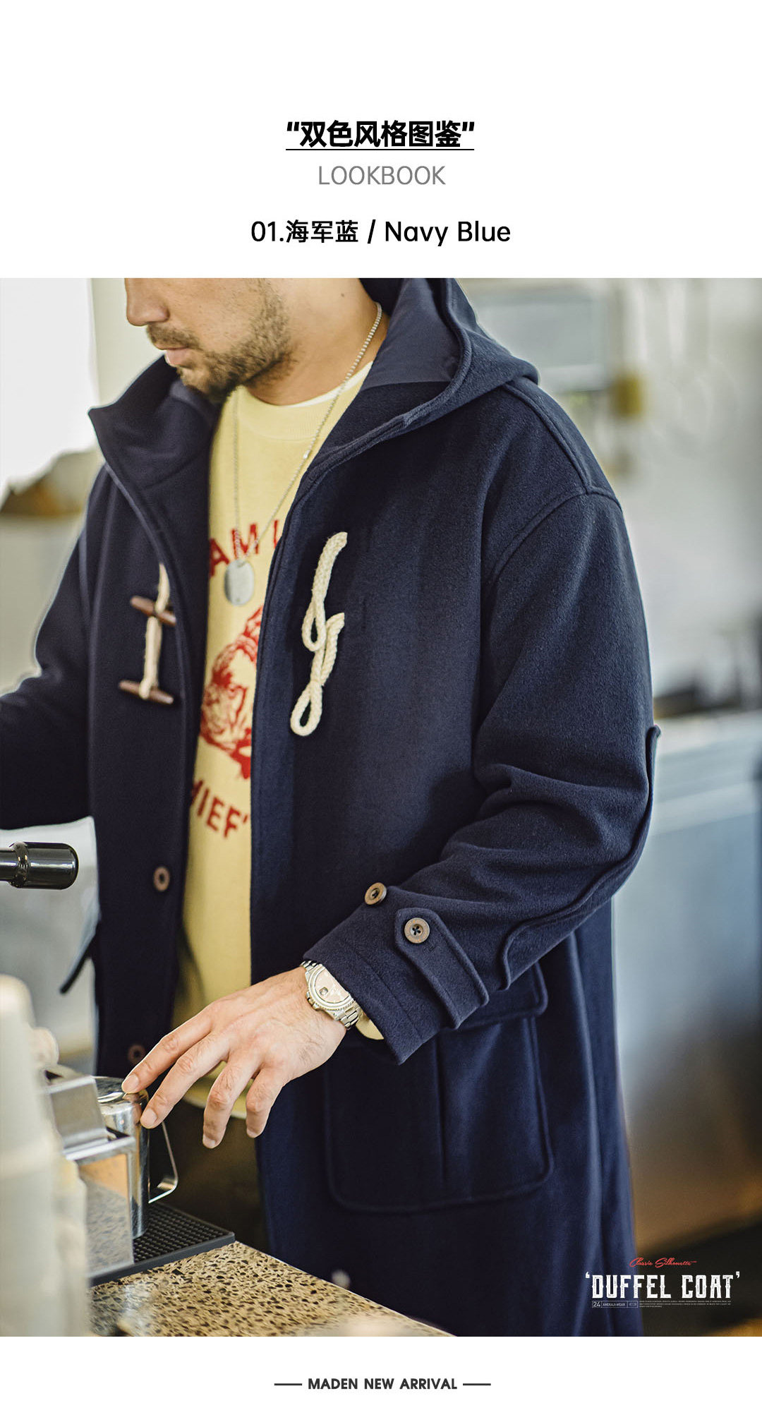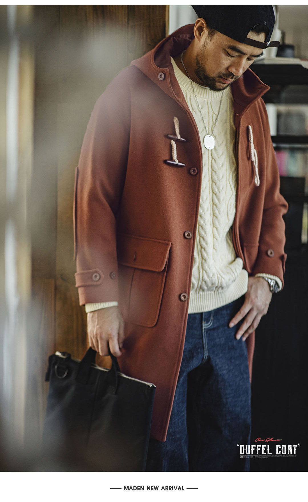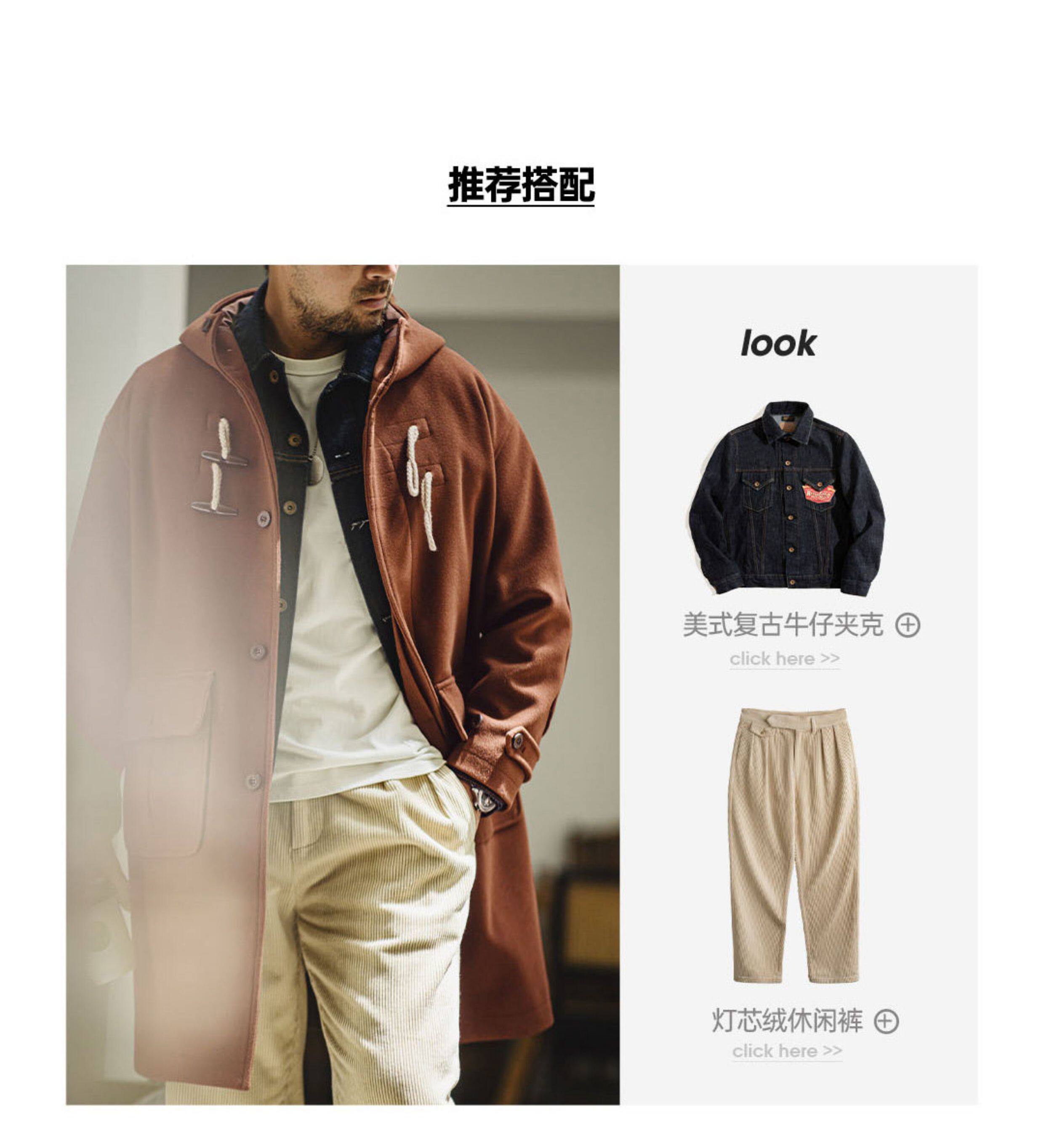 Madden Workwear American Retro Toggle Button Hooded Woolen Coat, Preppy Style Loose Long Coat for Men and Women, Spring and Winter