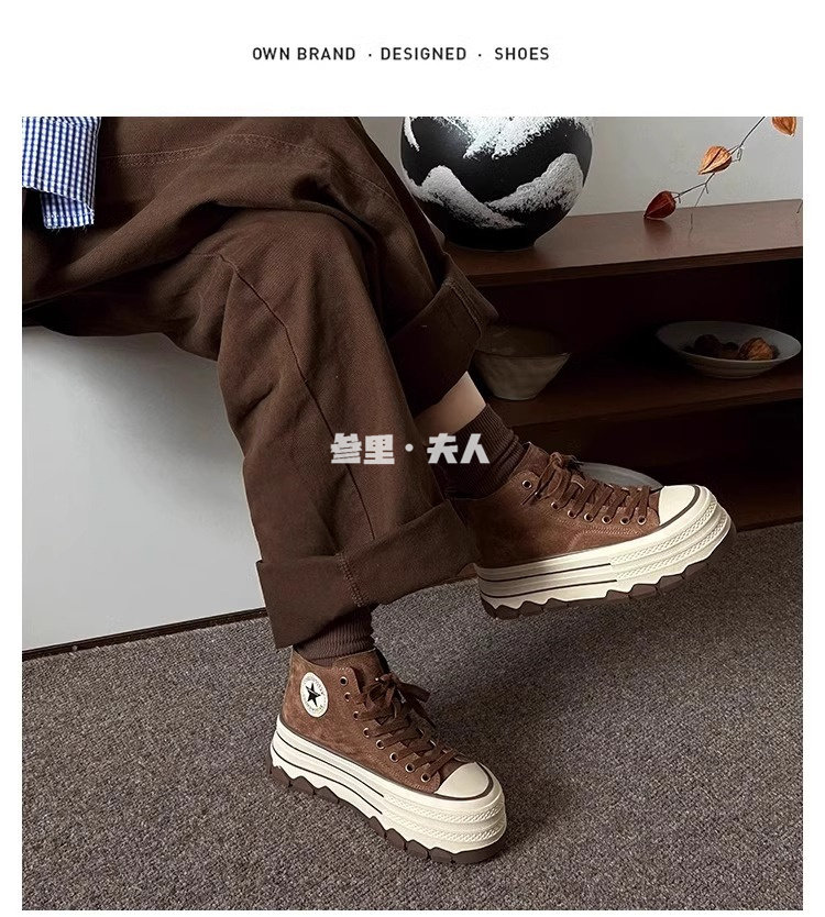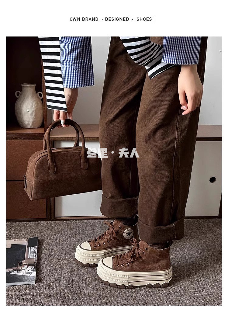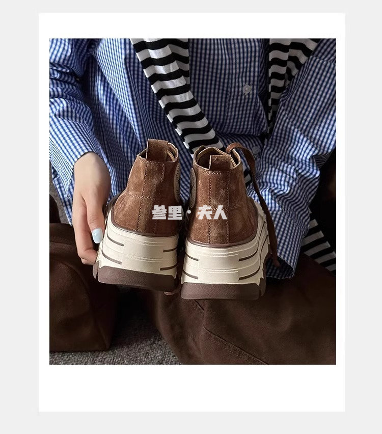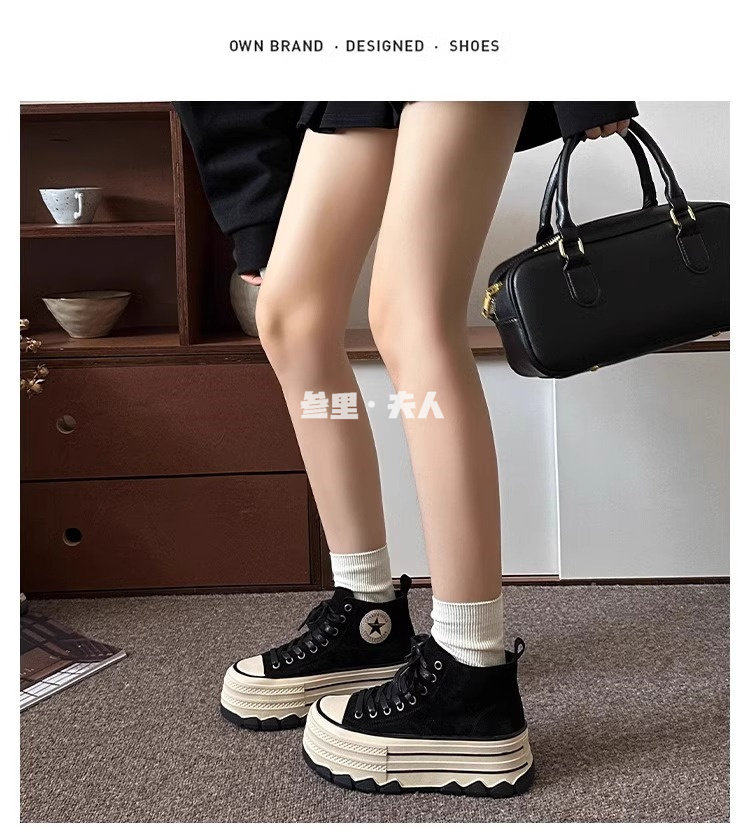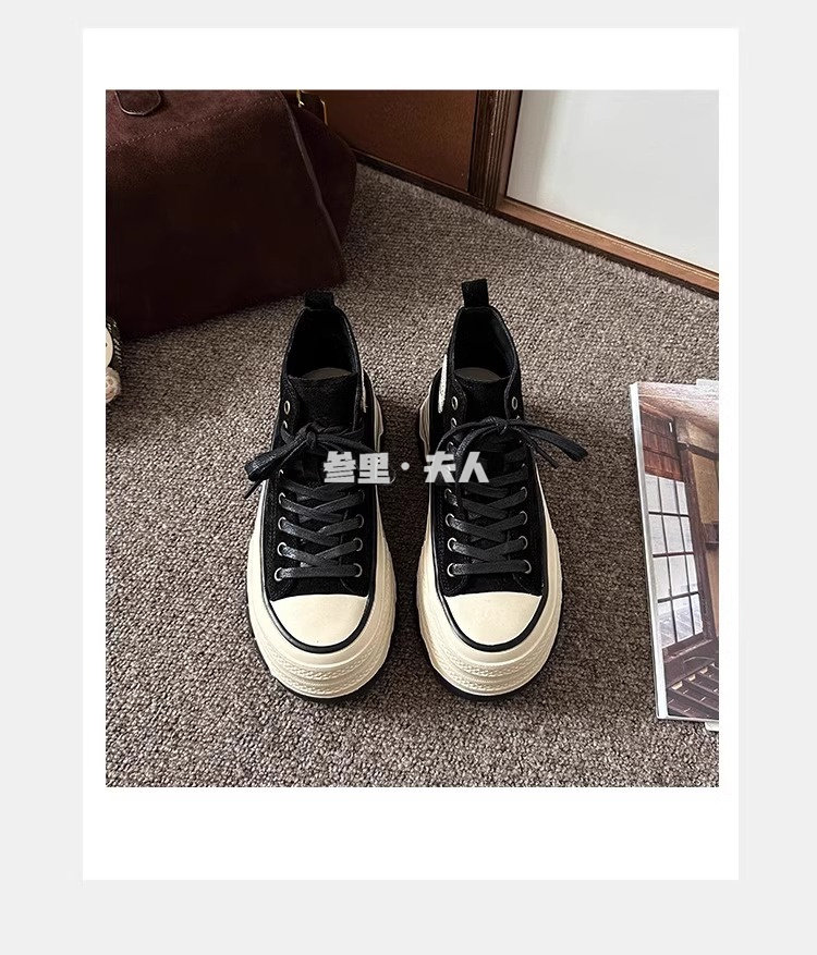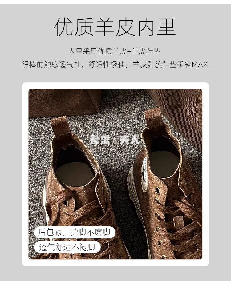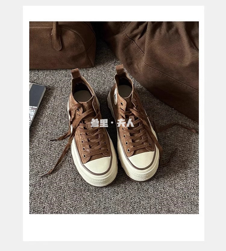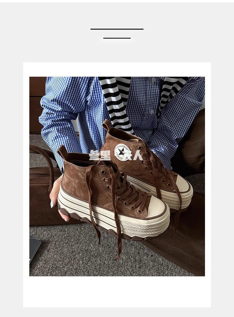 Italy Sanli~ Fashionable High-Top Thick-Soled Round-Toe Canvas Shoes for Women, Retro Style Versatile Suede Lace-Up Casual Shoes