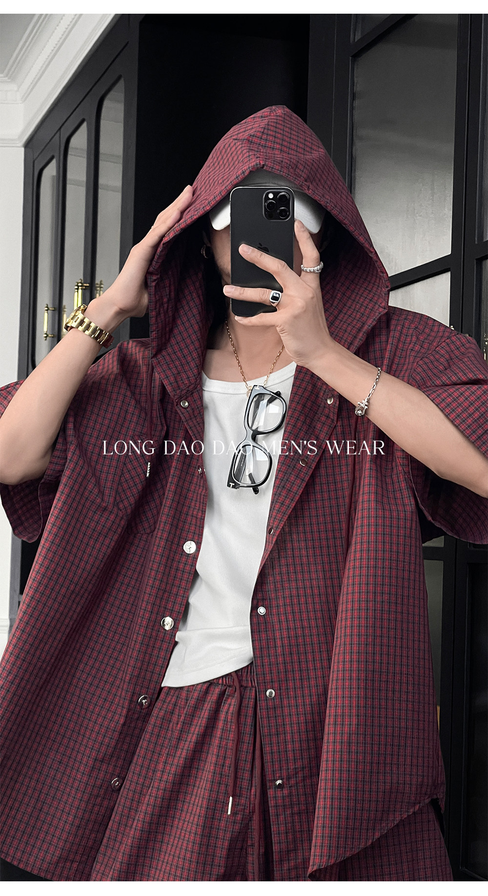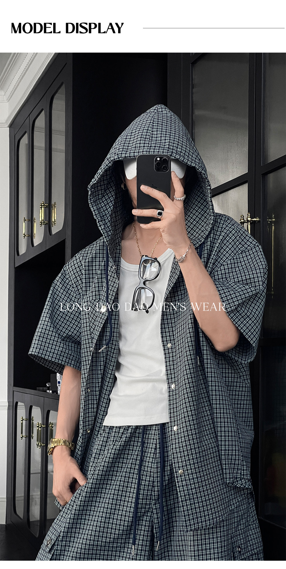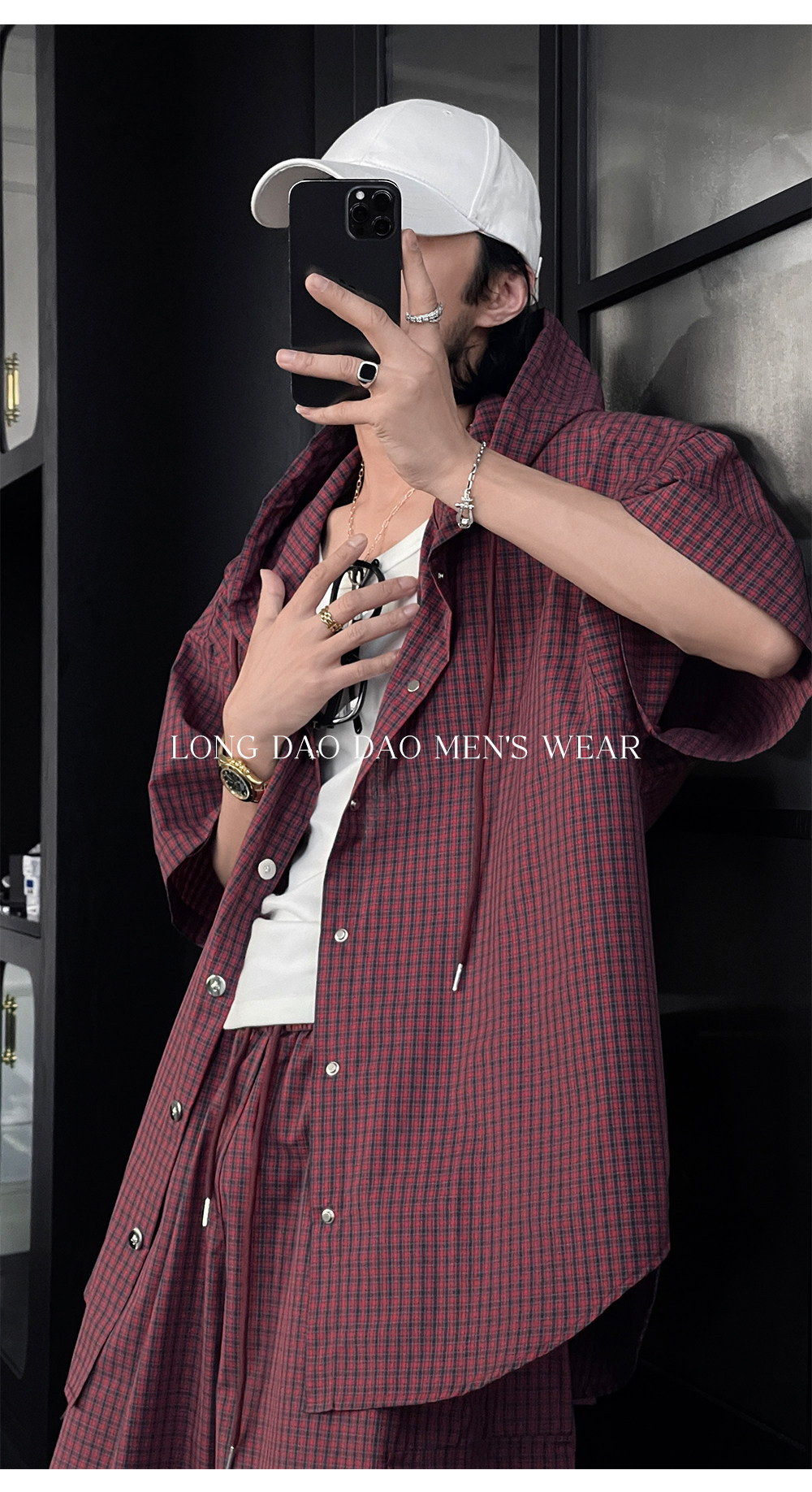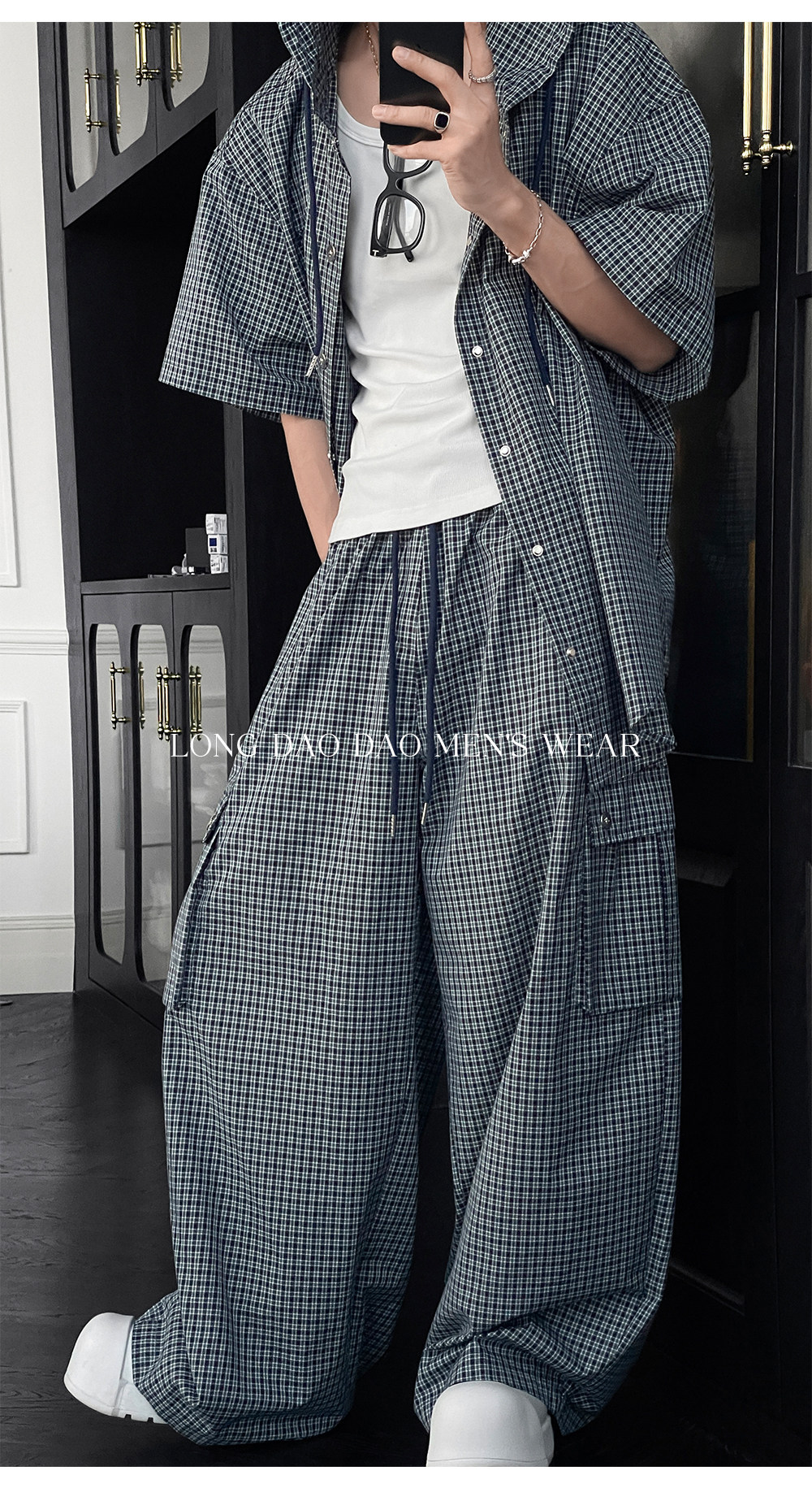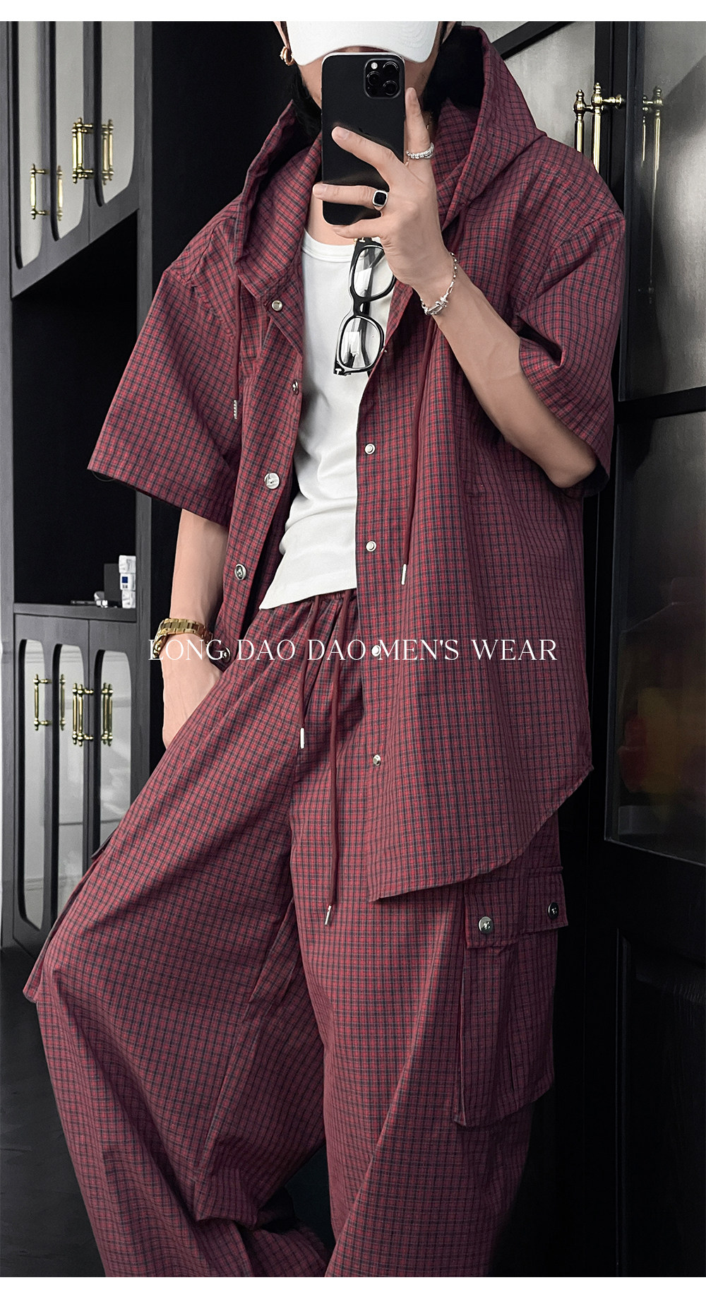 Longtao Summer American Casual Plaid Hooded Shirt Set Trendy Brand Loose Short-Sleeved Shirt Cargo Pants for Men