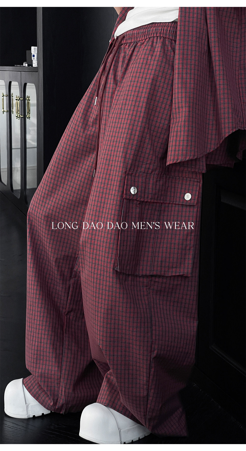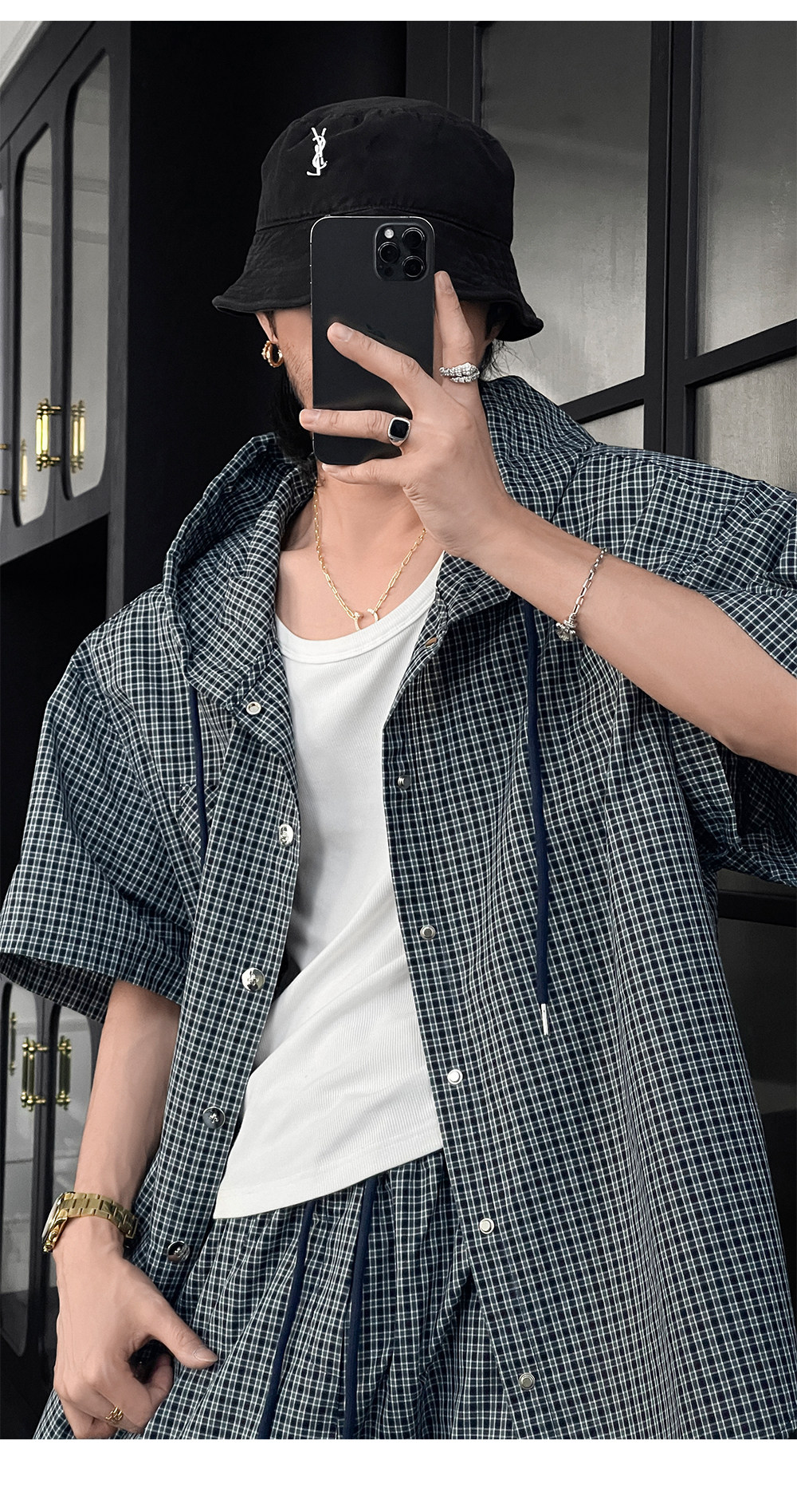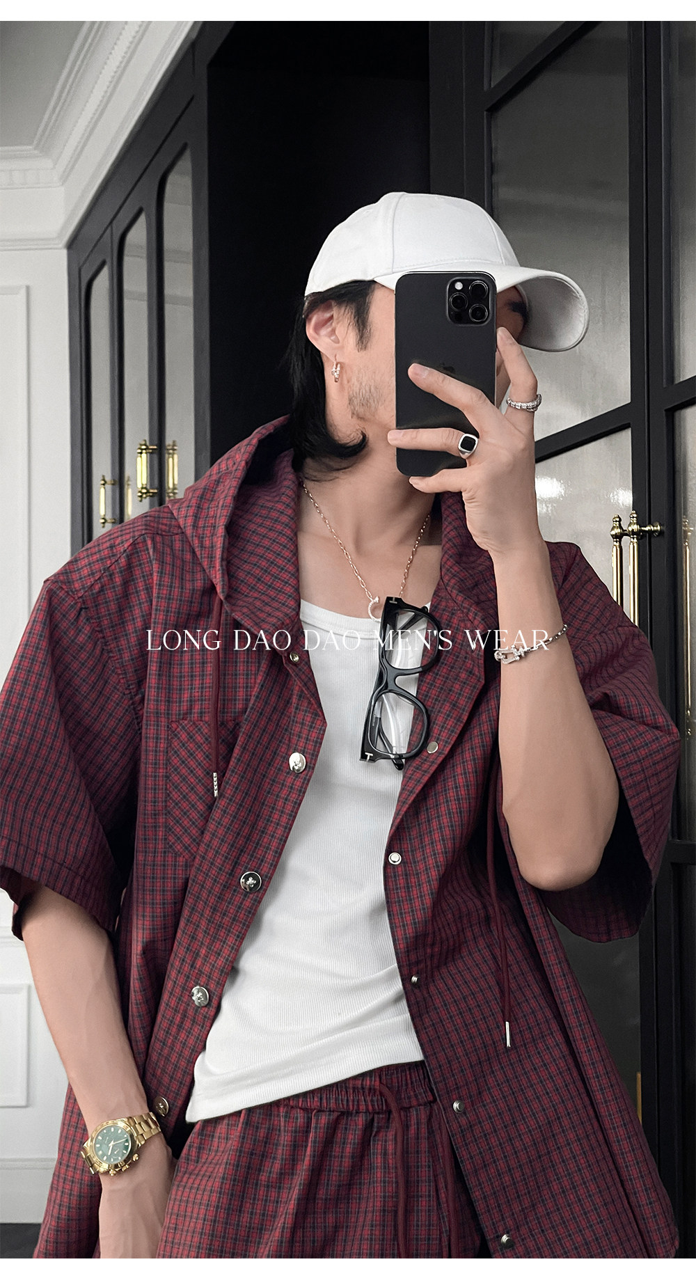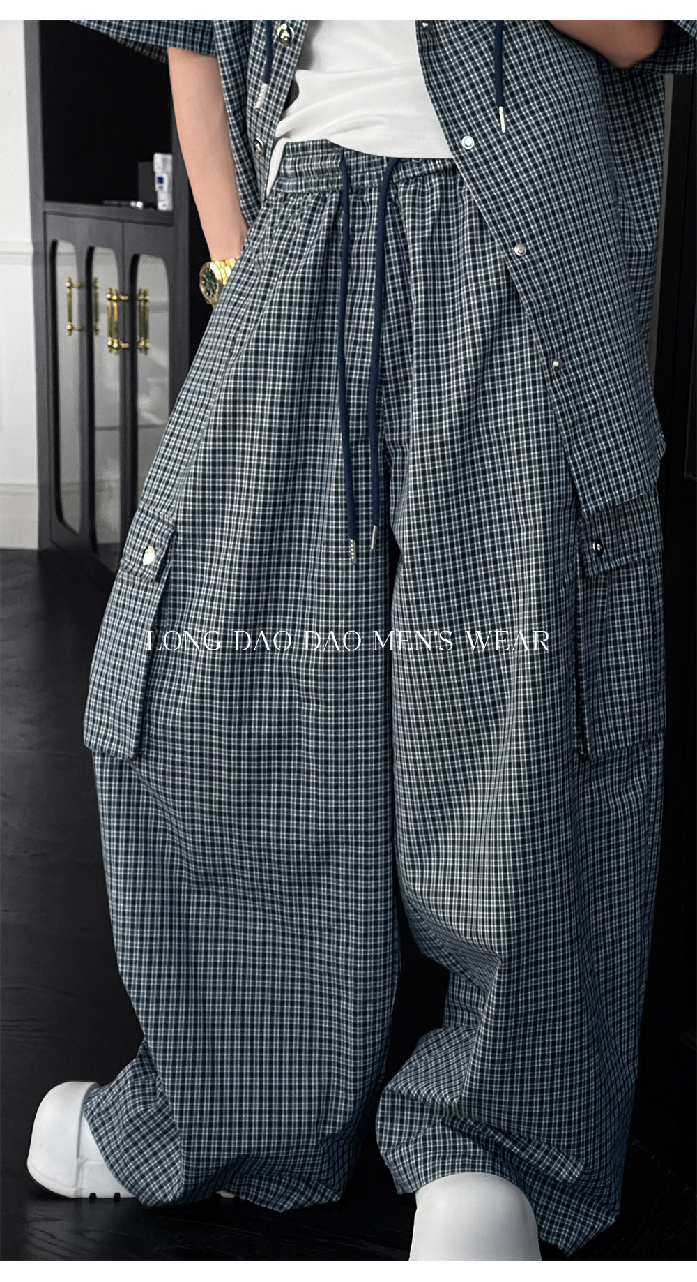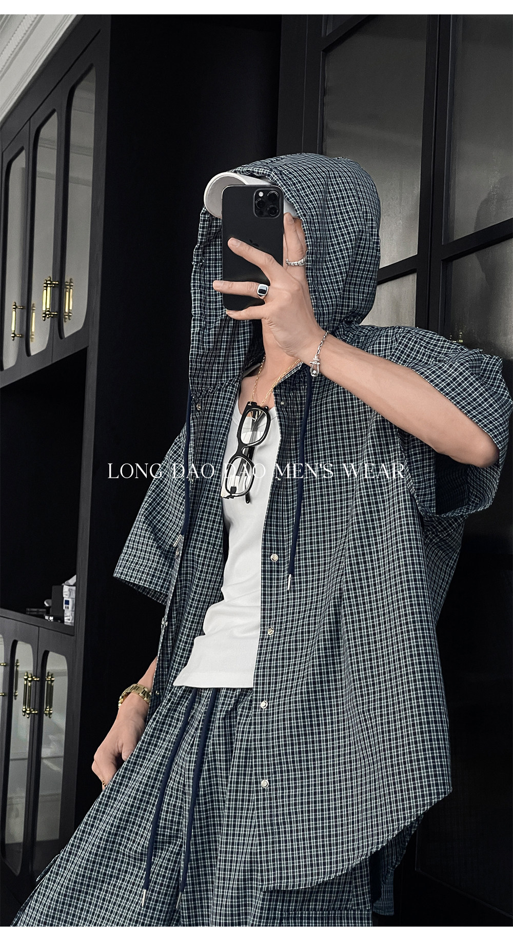 Longtao Summer American Casual Plaid Hooded Shirt Set Trendy Brand Loose Short-Sleeved Shirt Cargo Pants for Men