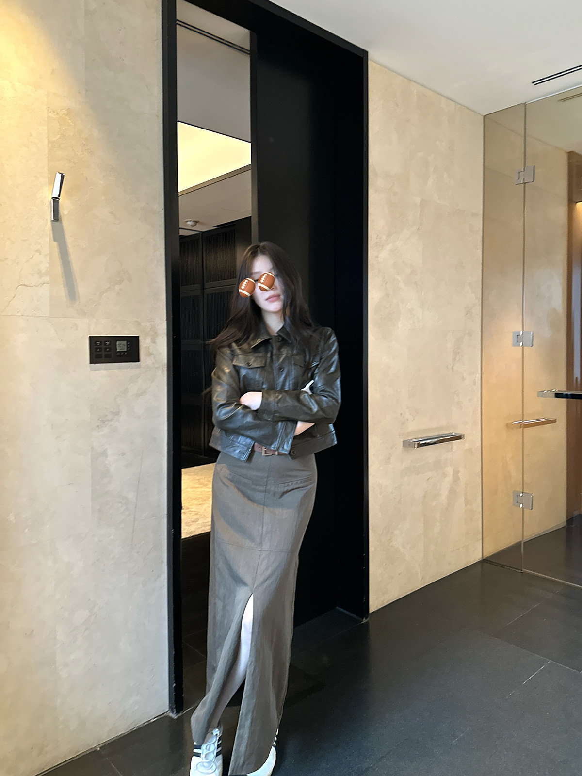 正肩小翻领上身很有精气神,衣长刚好到胯