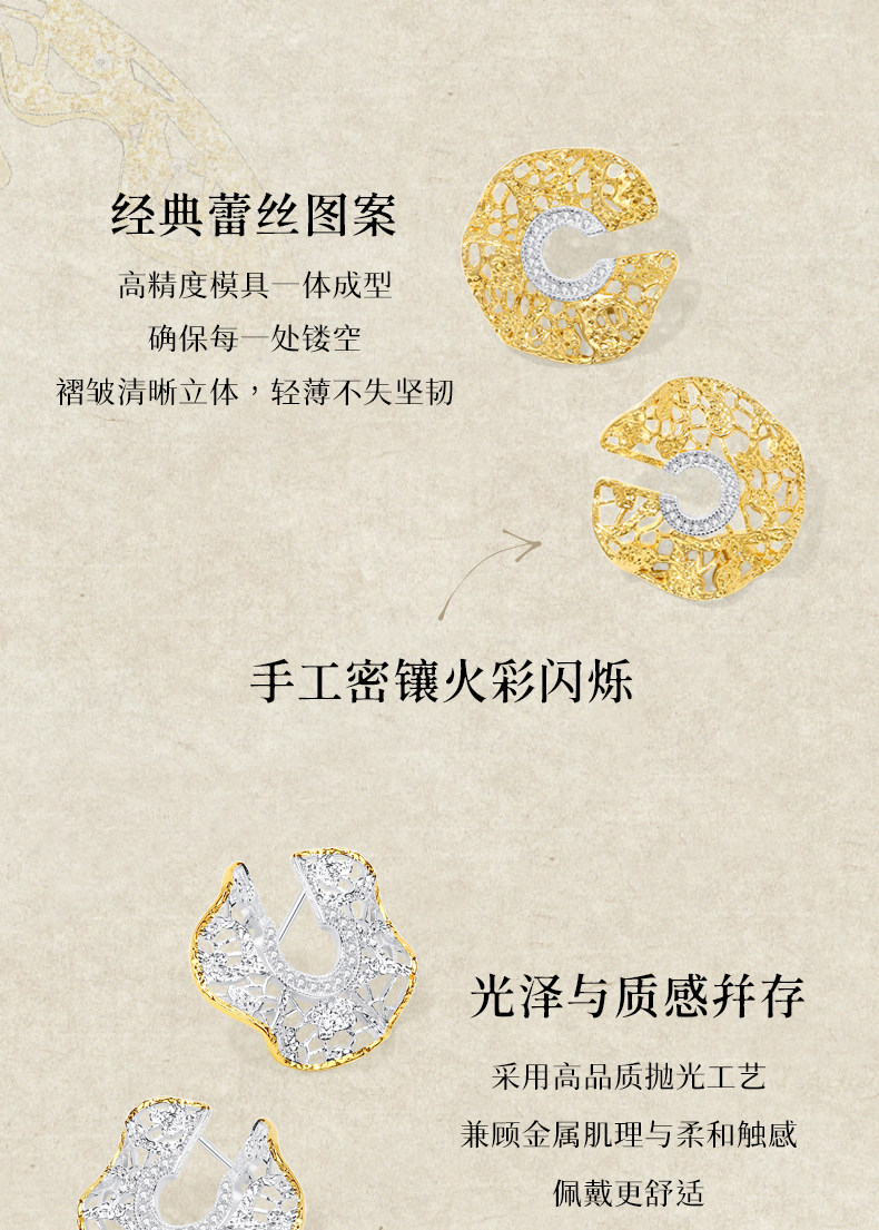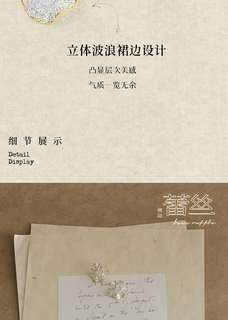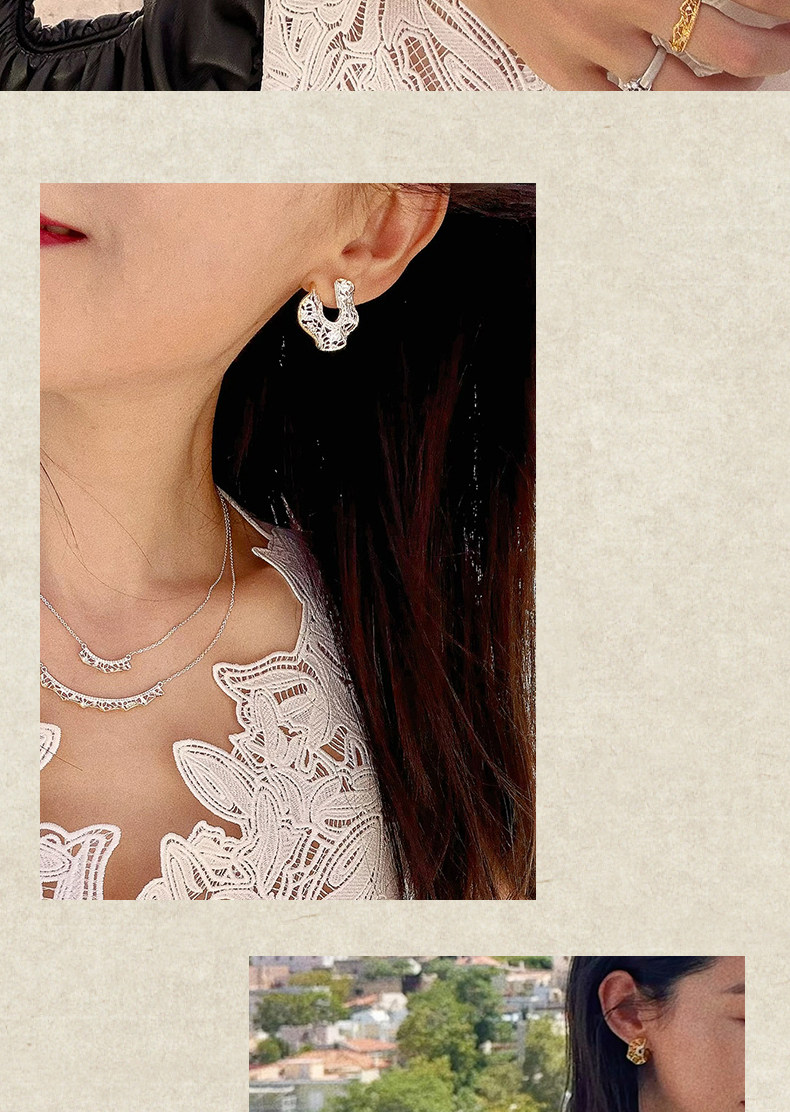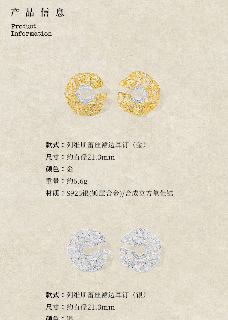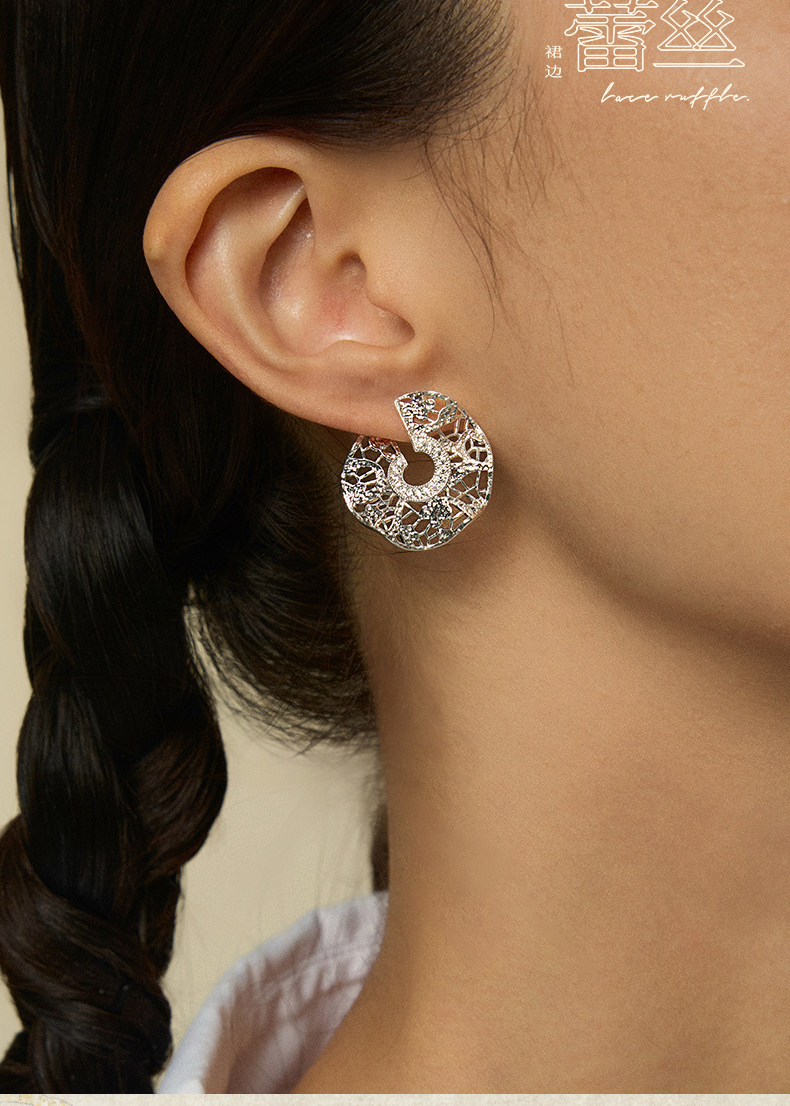 Ooak Levi's Lace Trim Series High-End Niche Lace Earrings Hollow Vintage S925 Silver Plated with Gold