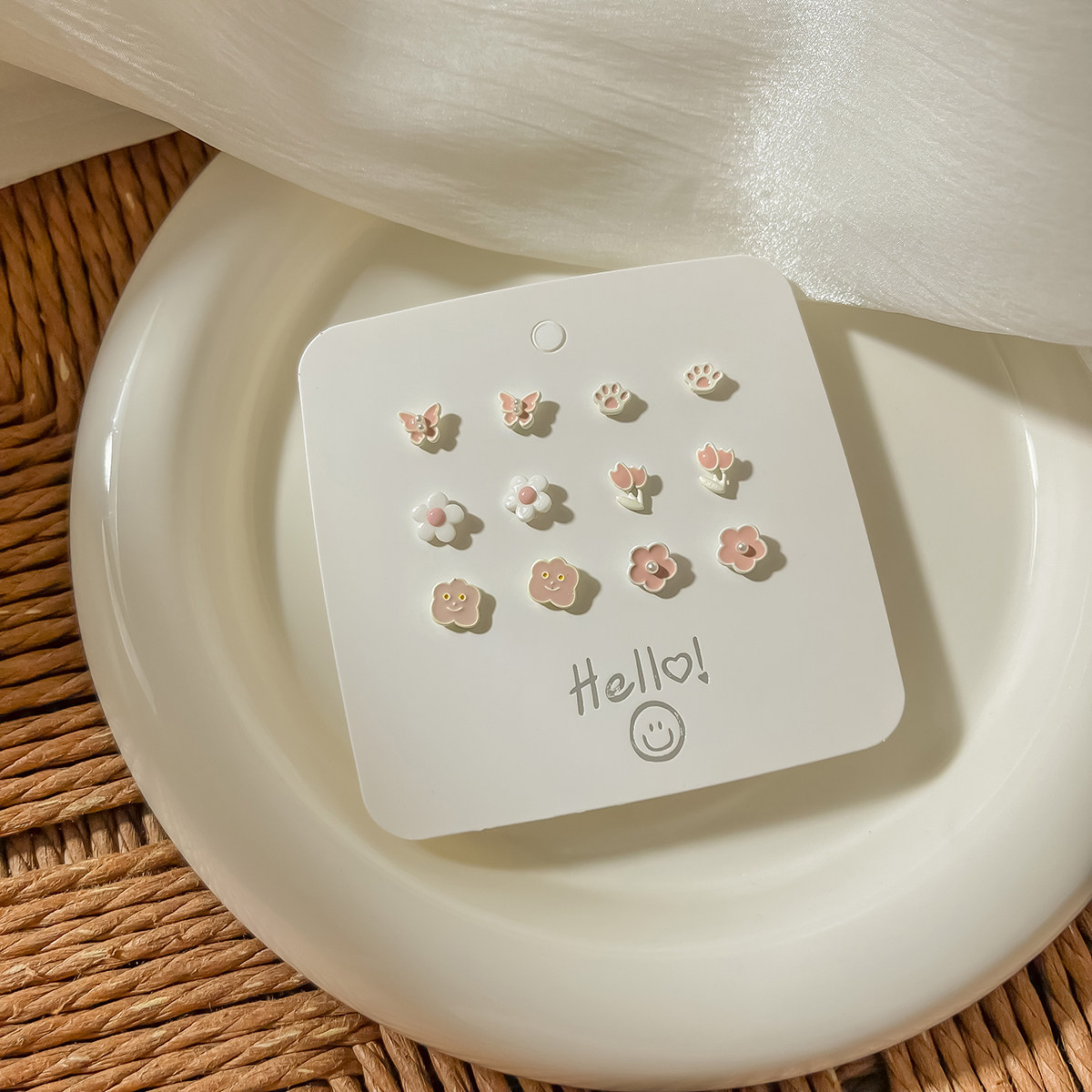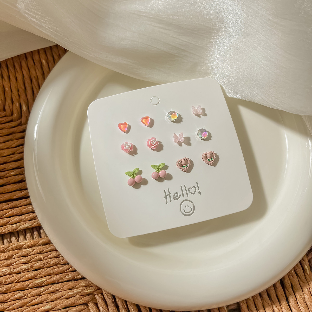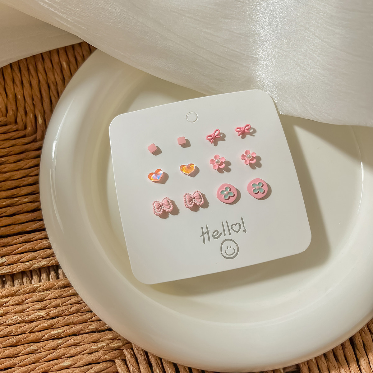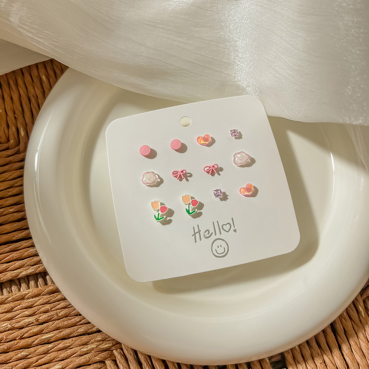 New Cute Pink Series Silver Needle One-Week Set Earrings, Simple and Versatile Small Earrings for Students, Sweet Ear Accessories for Women