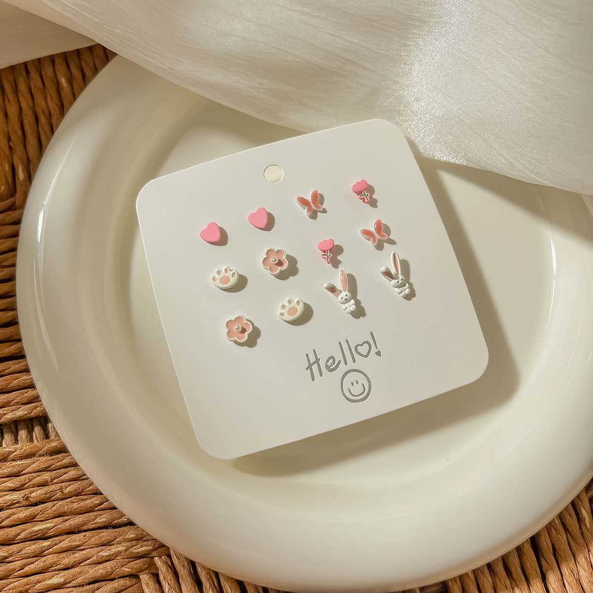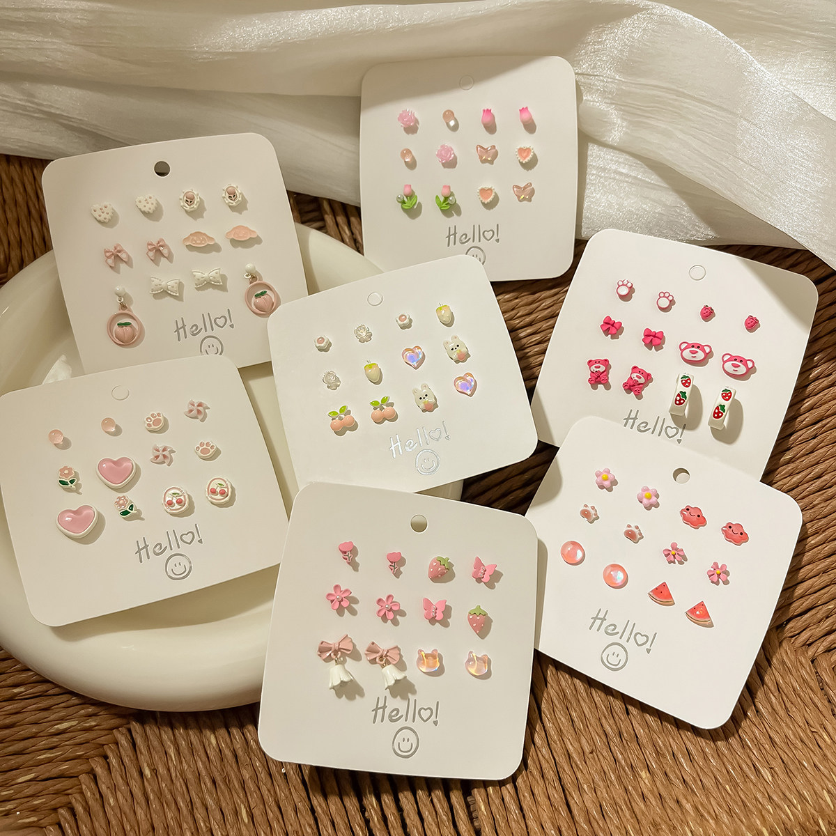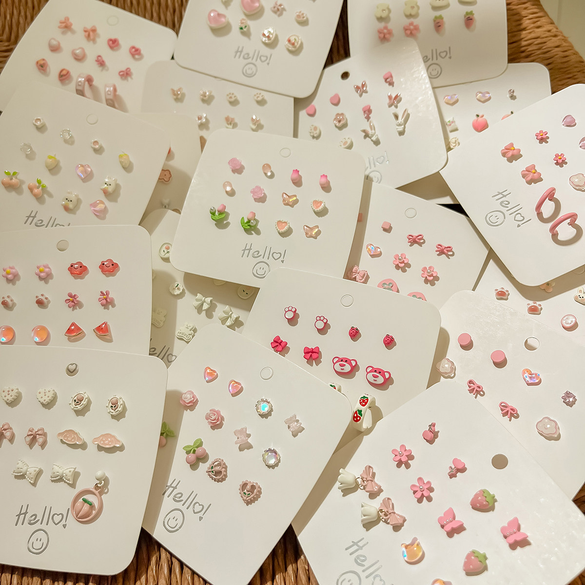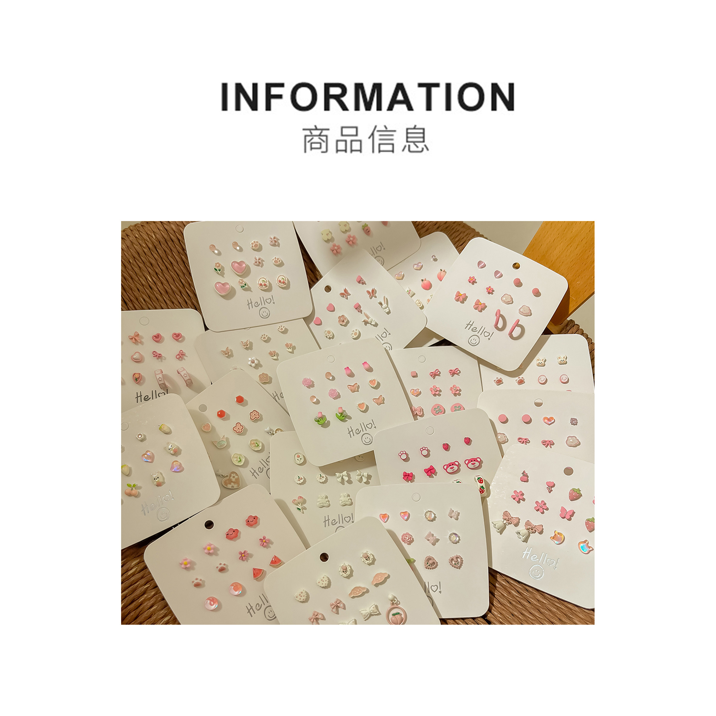 New Cute Pink Series Silver Needle One-Week Set Earrings, Simple and Versatile Small Earrings for Students, Sweet Ear Accessories for Women