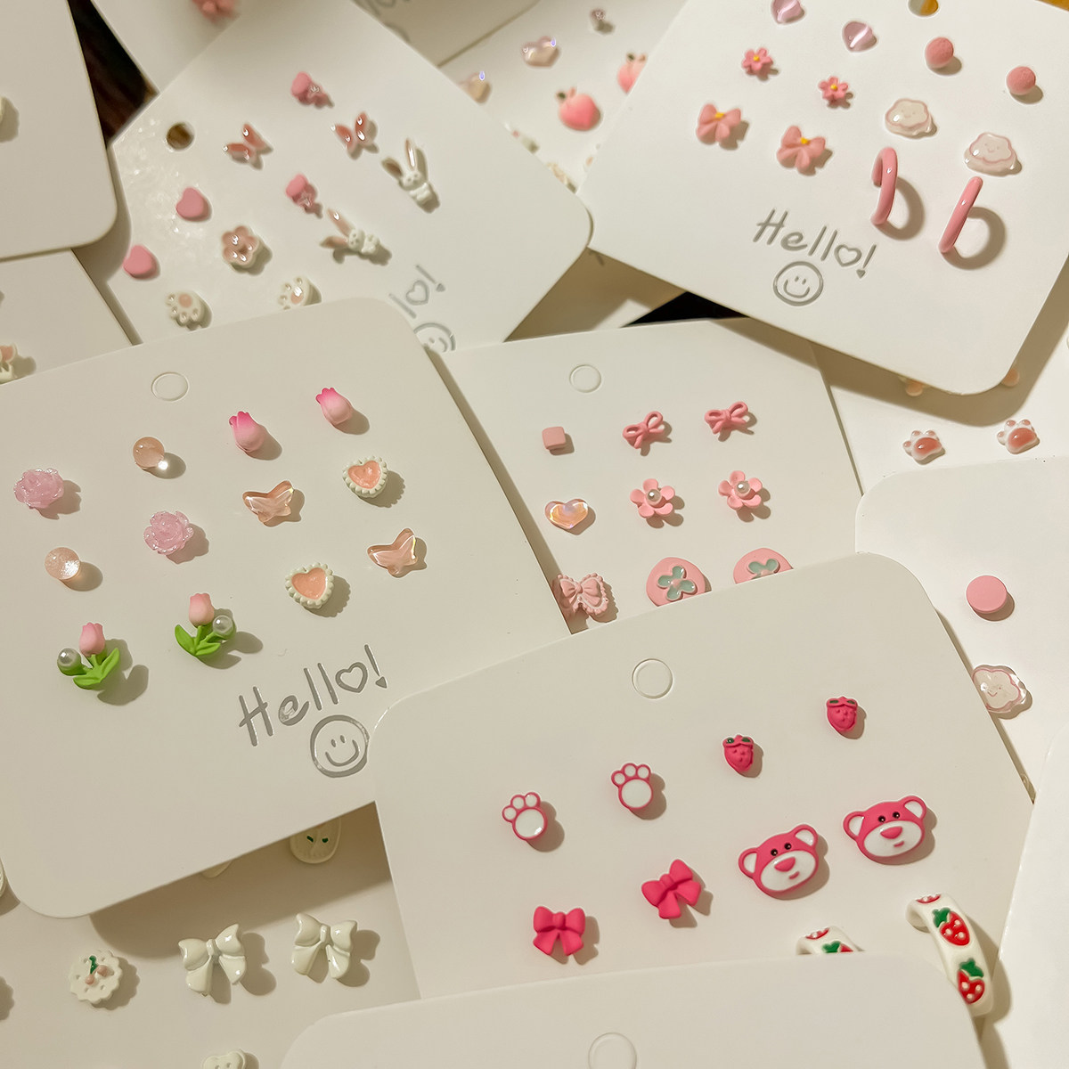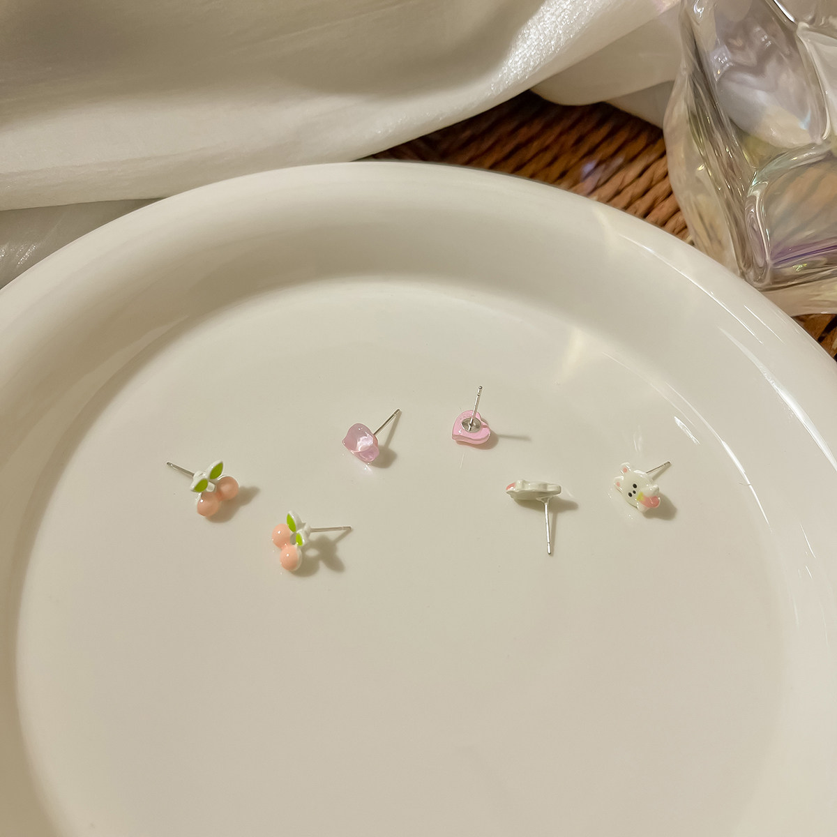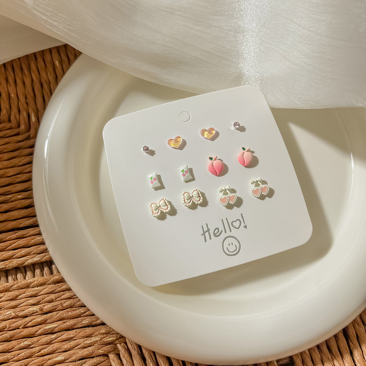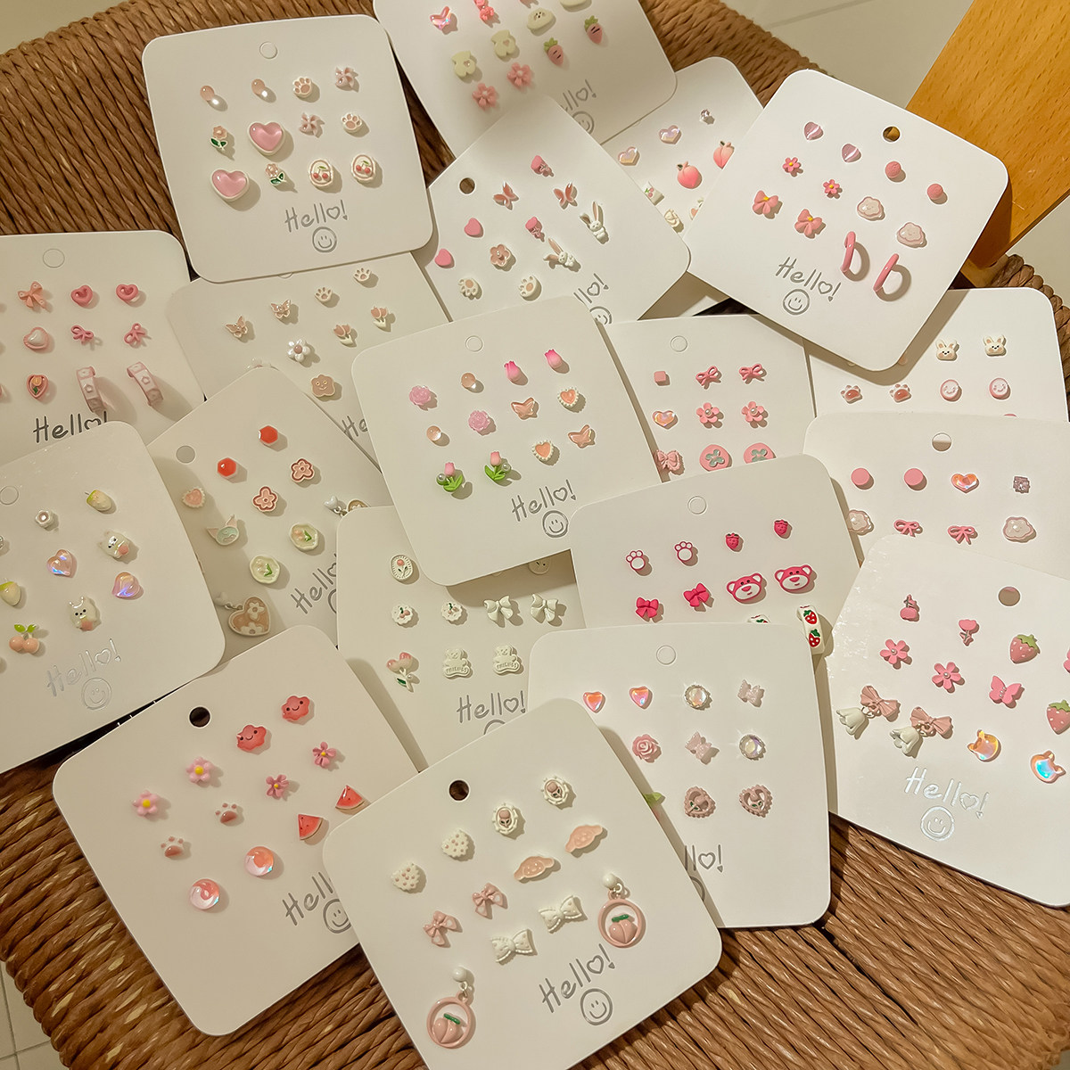 New Cute Pink Series Silver Needle One-Week Set Earrings, Simple and Versatile Small Earrings for Students, Sweet Ear Accessories for Women