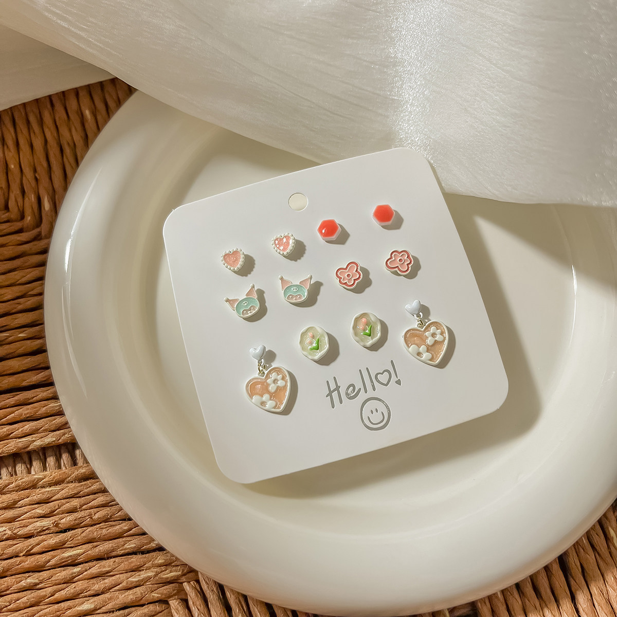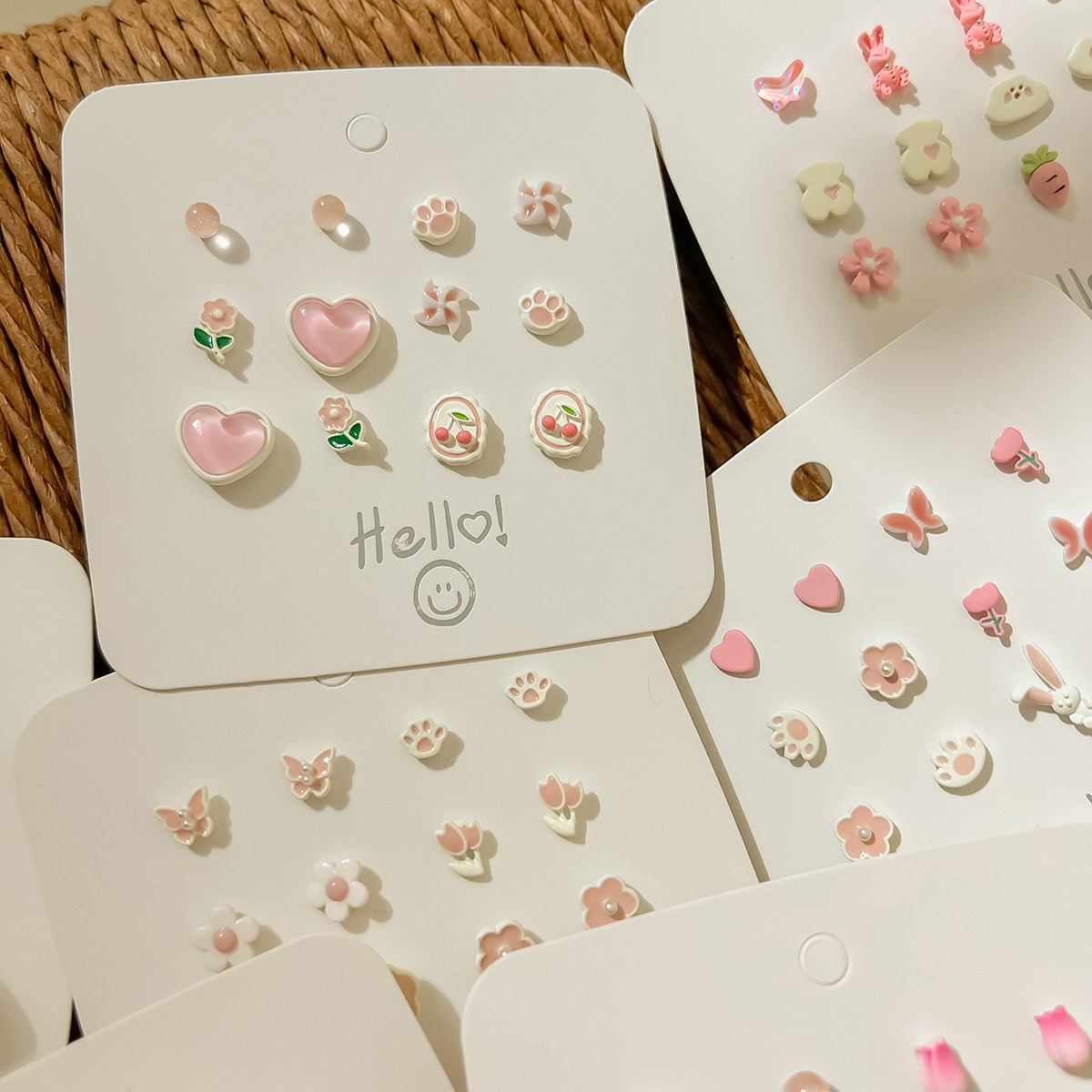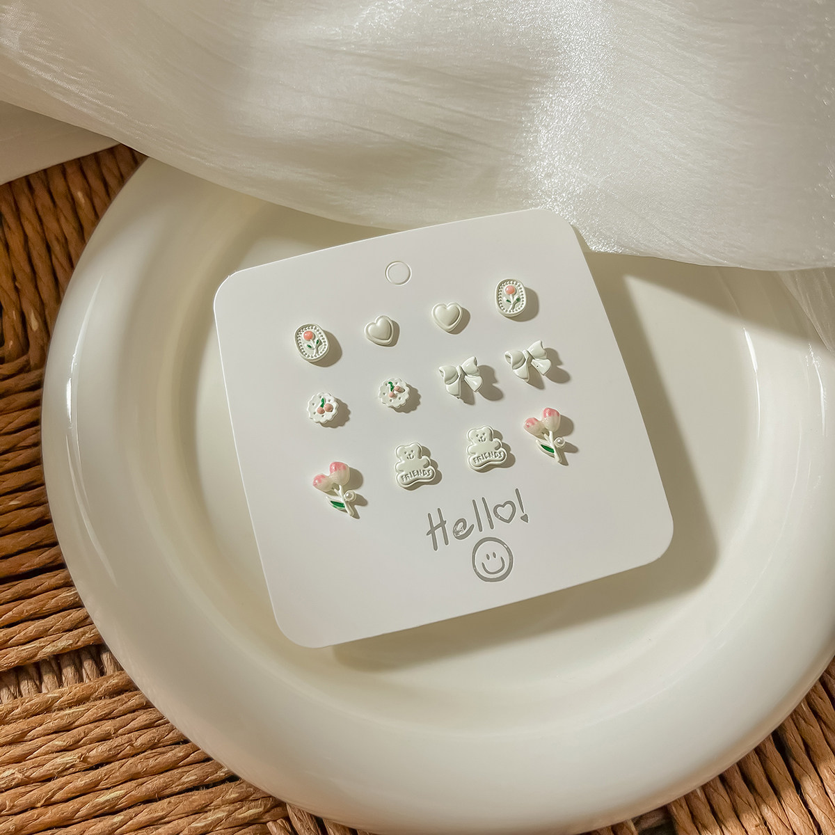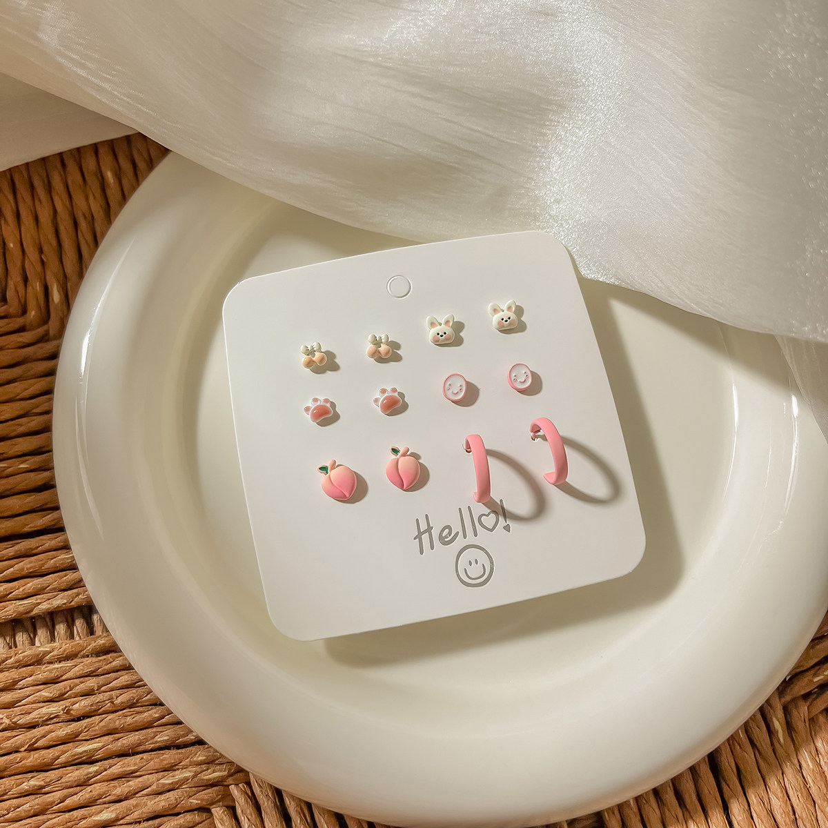 New Cute Pink Series Silver Needle One-Week Set Earrings, Simple and Versatile Small Earrings for Students, Sweet Ear Accessories for Women
