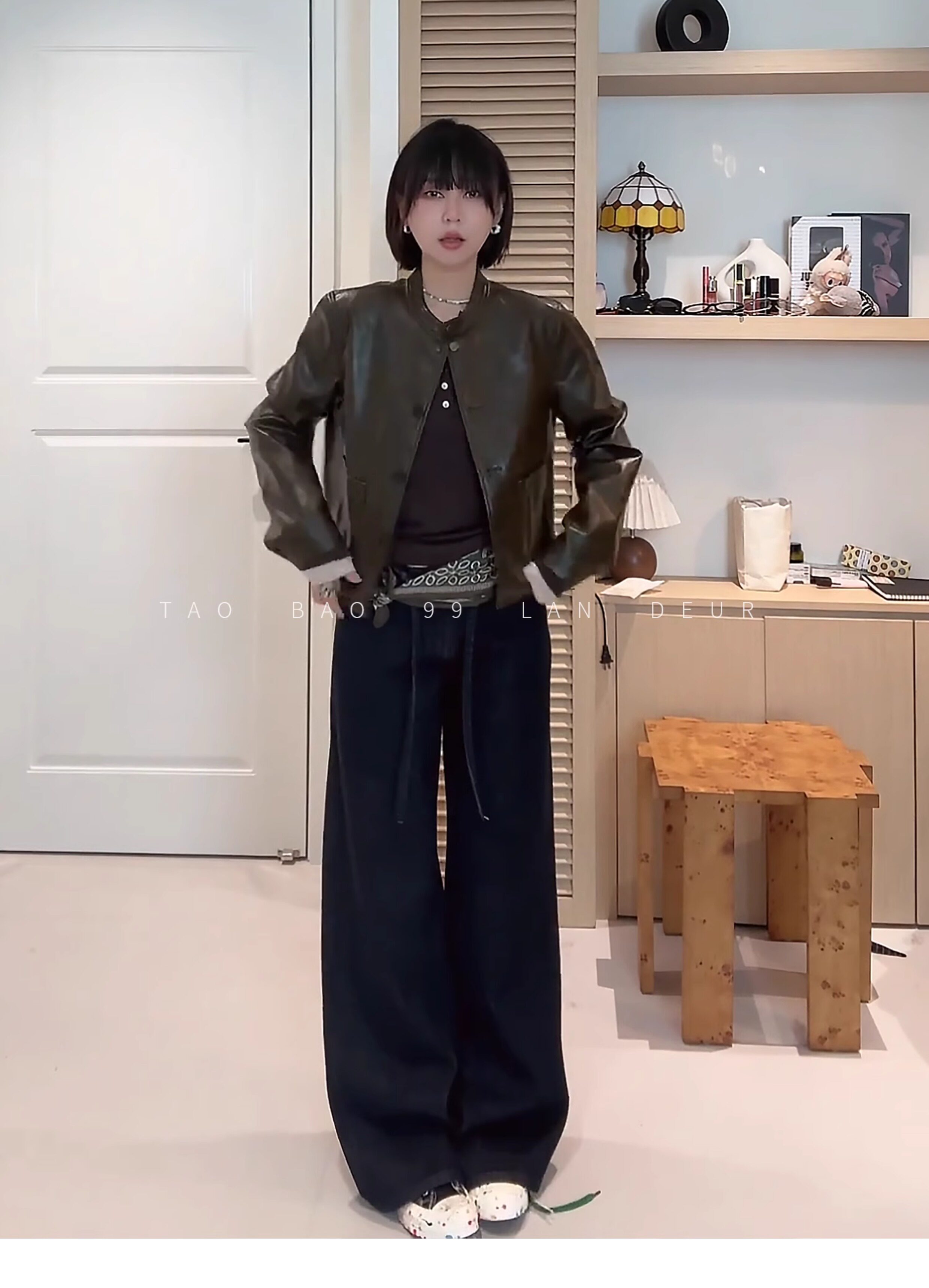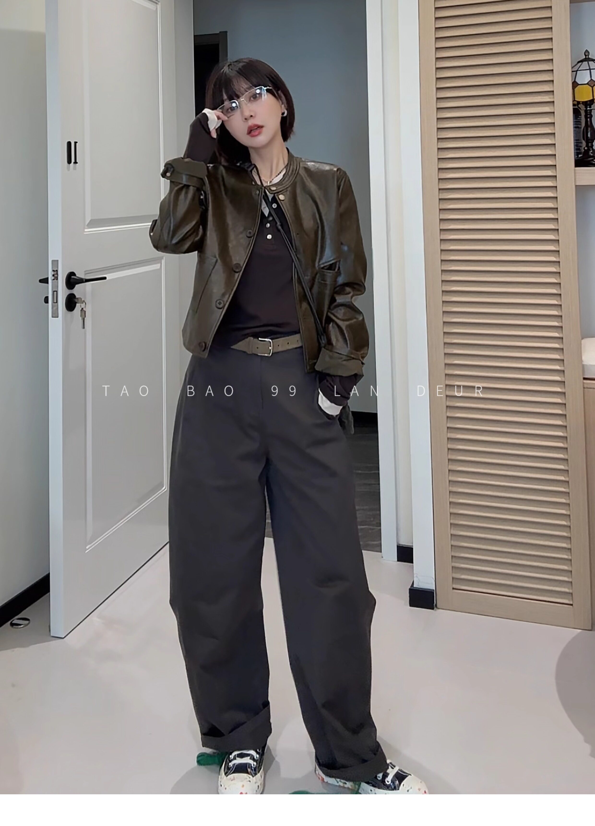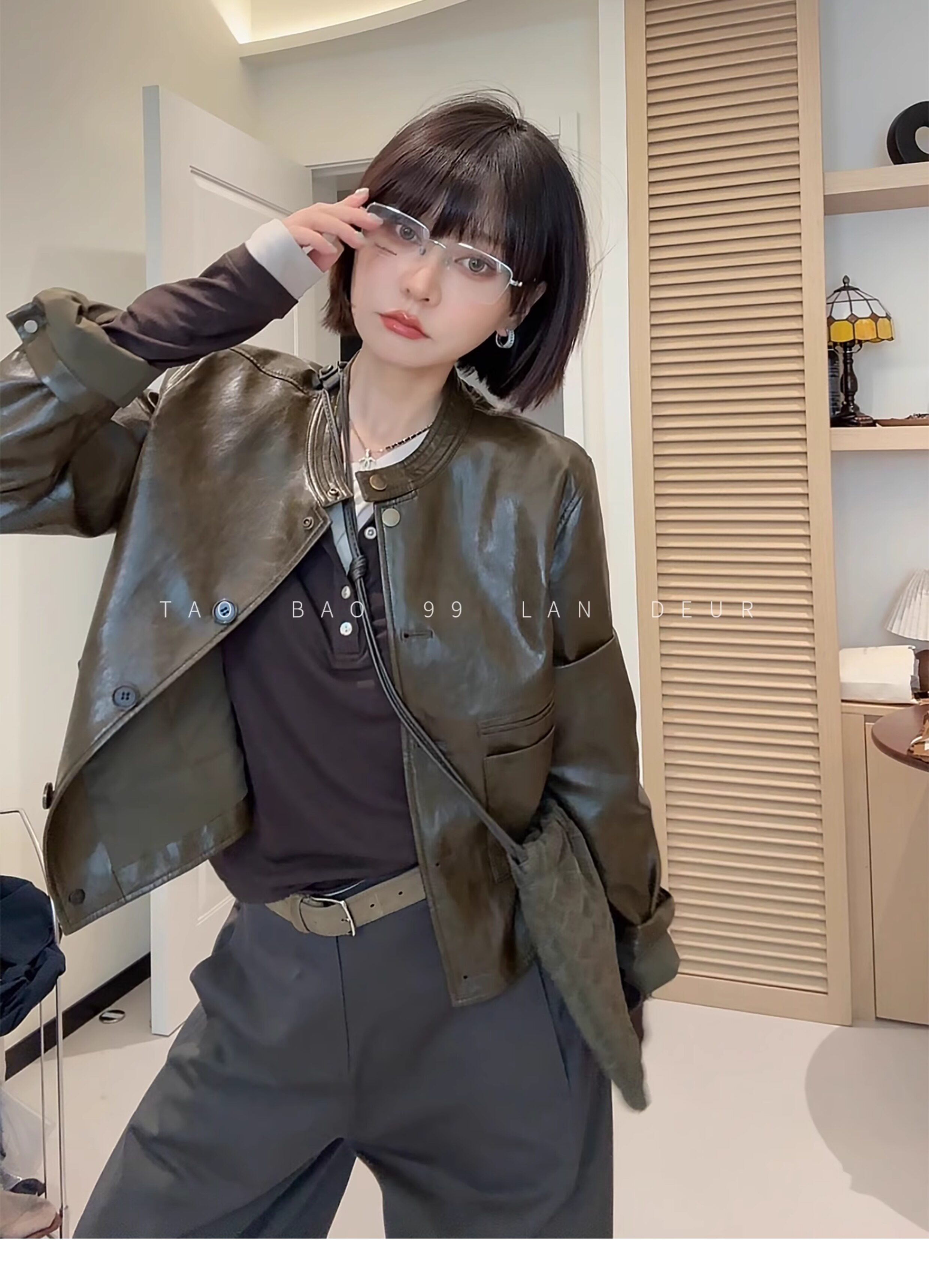 Lan Deur【Hutong Fallen Leaves】Round-Neck Short Fashion Niche Style Loose Retro Leather Jacket for Women in Autumn