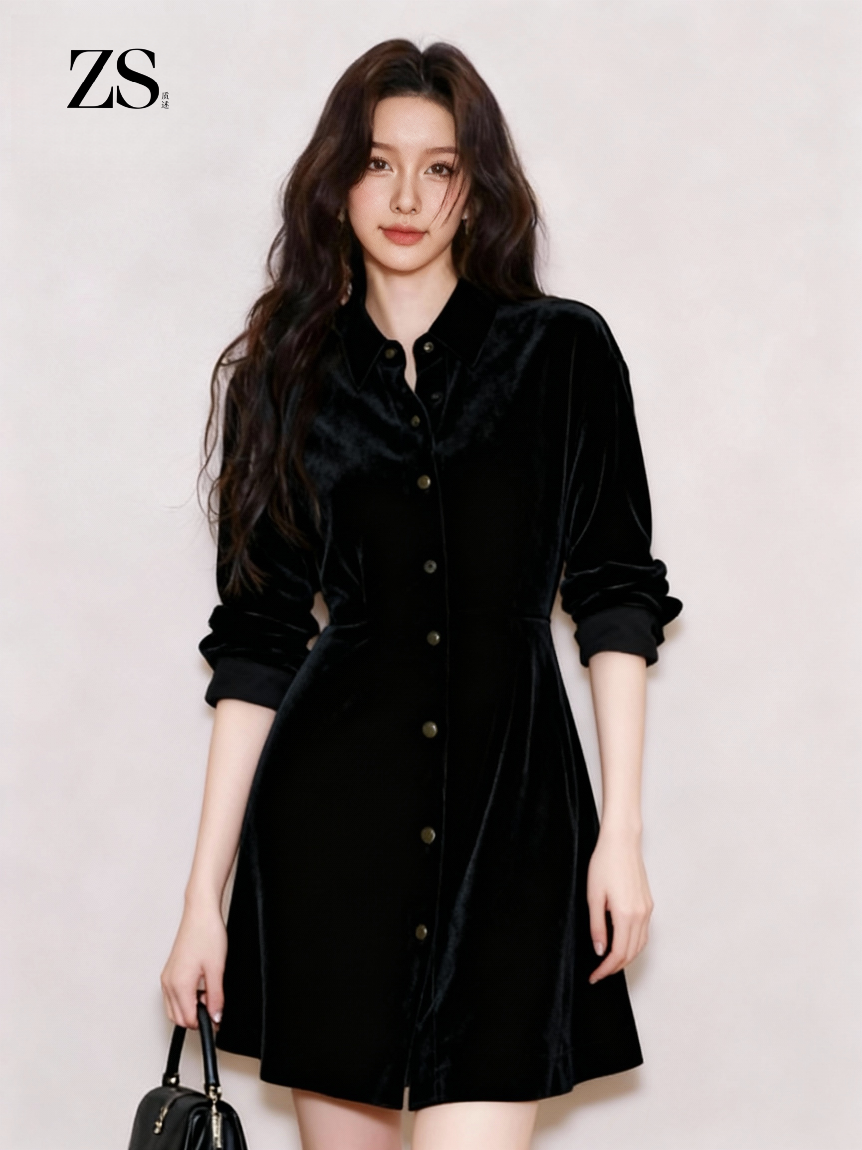Zs Presents a Stunning Spring Party Dress, a Beautiful Black Velvet Shirt Dress for Women for Important Occasions