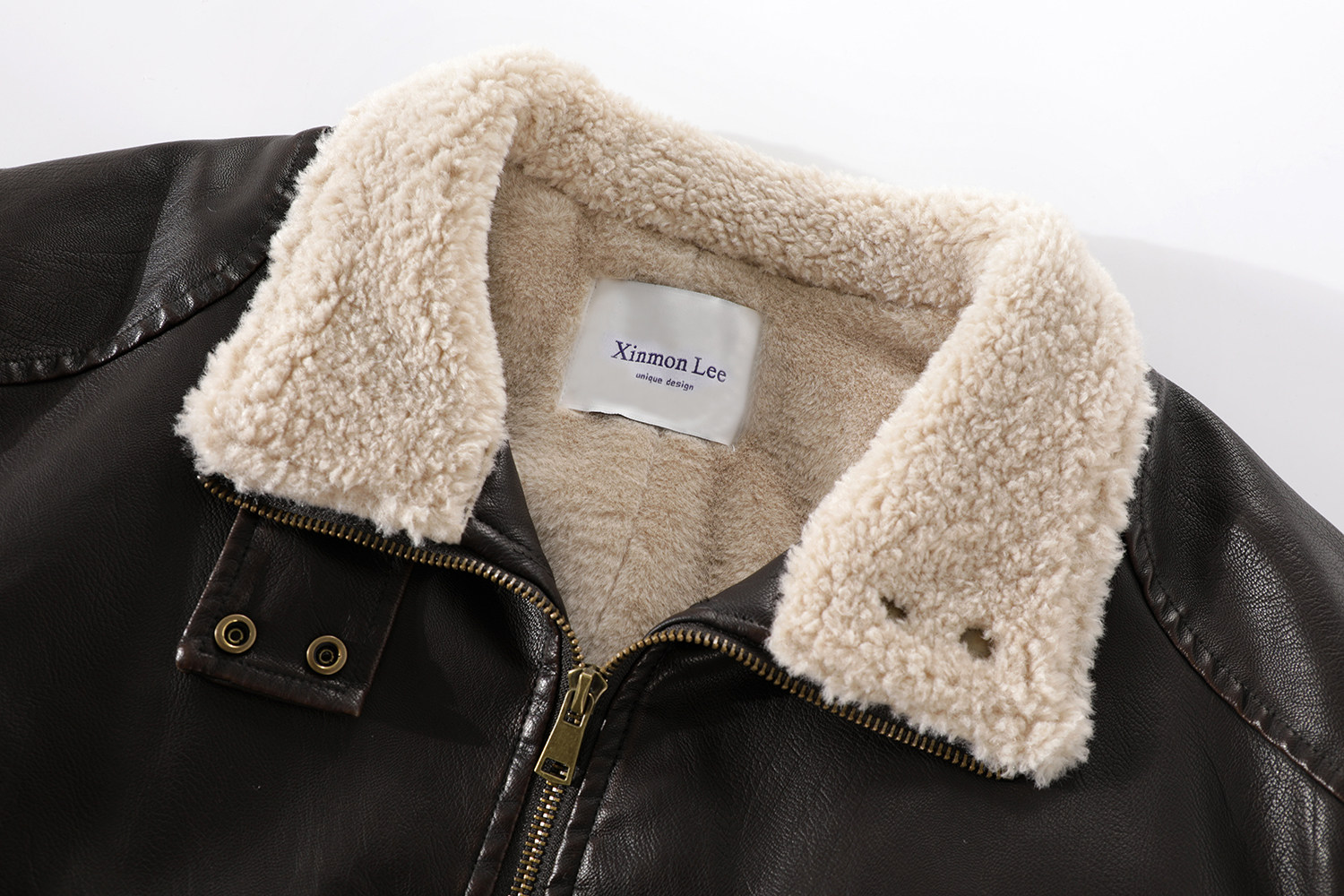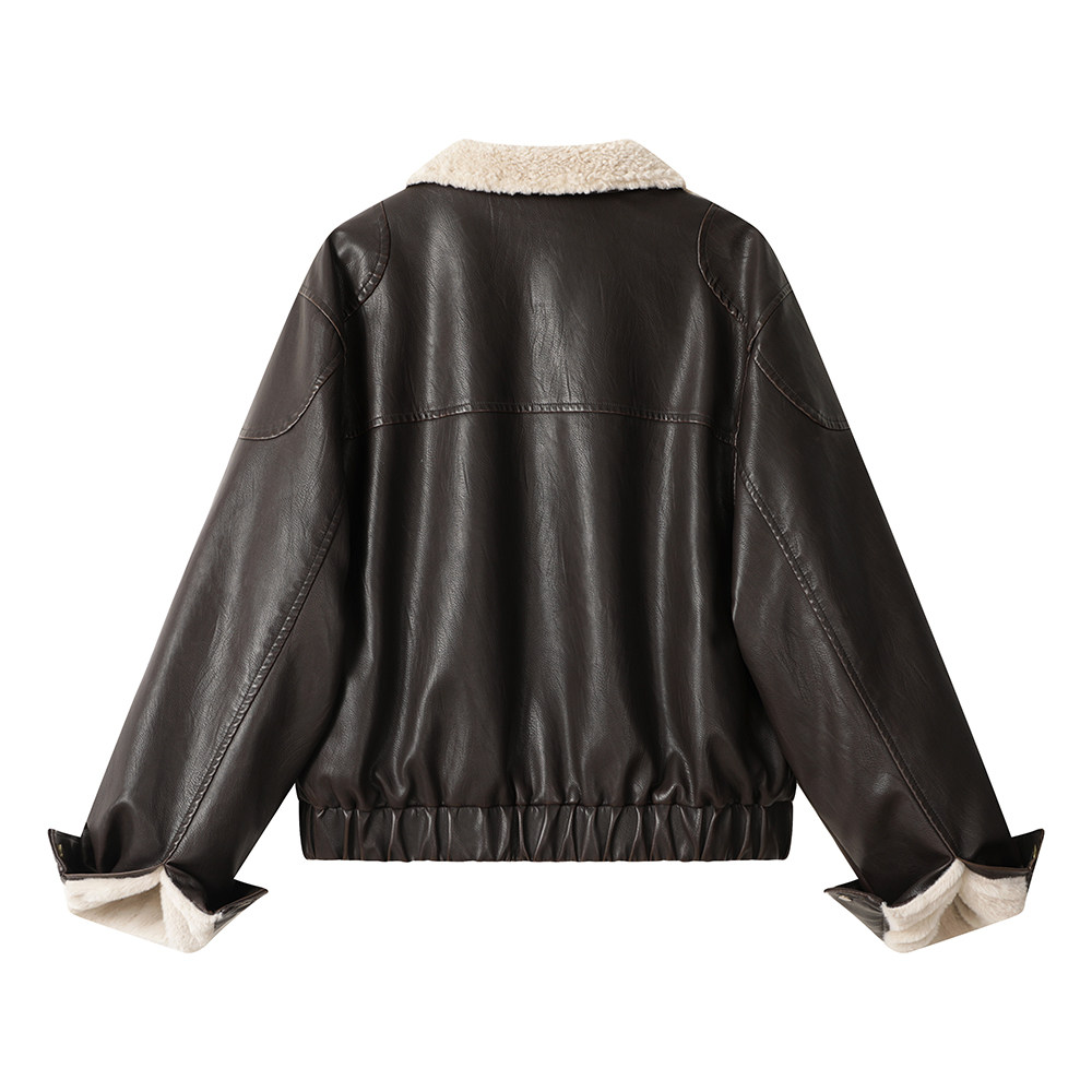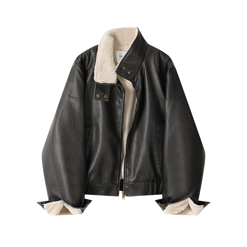 Xinmonlee Black Long-Sleeved Leather Jacket Women's Coat Winter Fleece-Lined Super Stylish Loose and Trendy Top