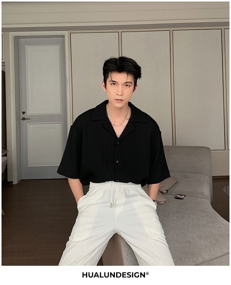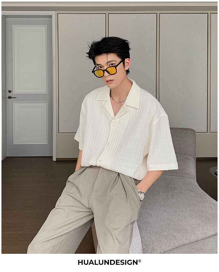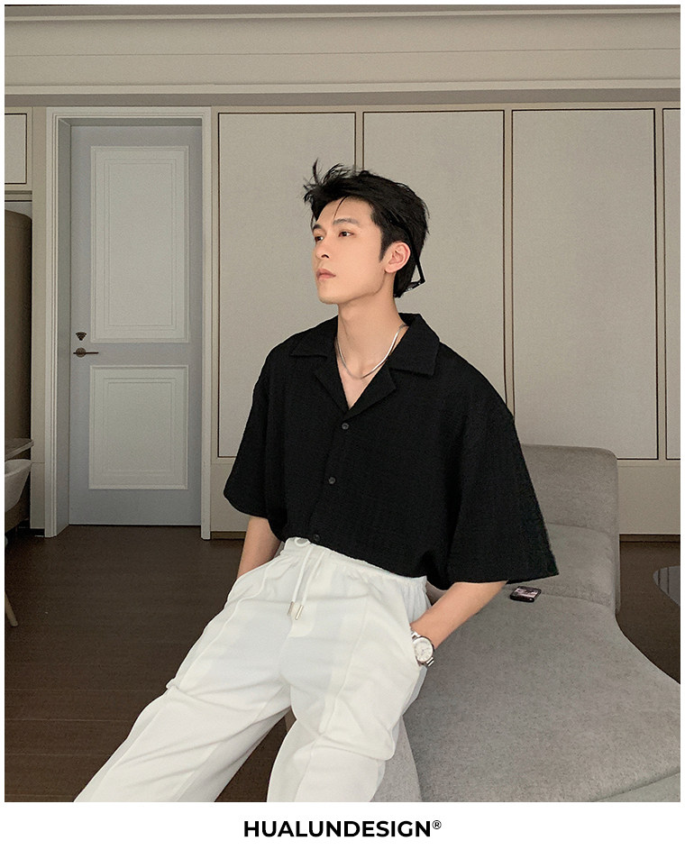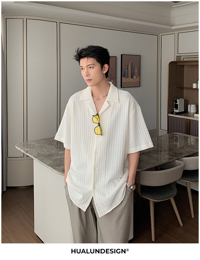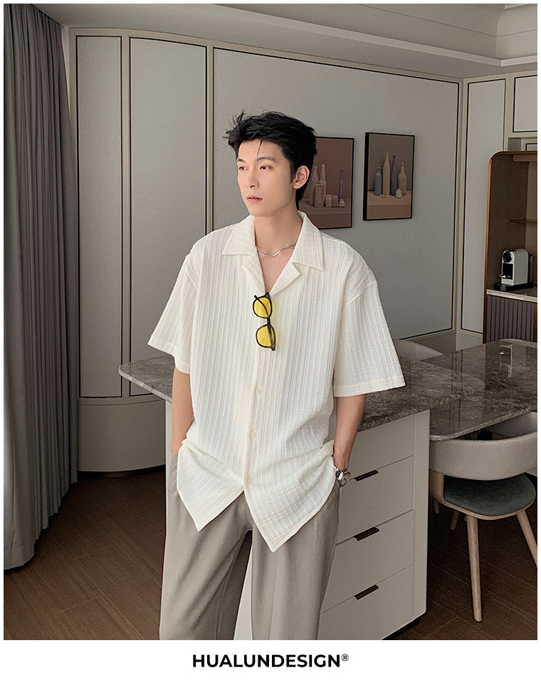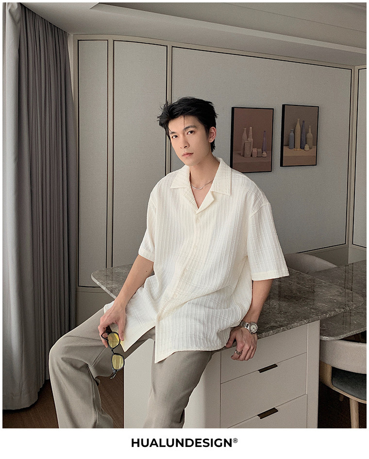 Hualun Men's Cuban Collar Shirt Short-Sleeved Shirt Men's Summer Design Loose Trendy Brand Simple Casual Top