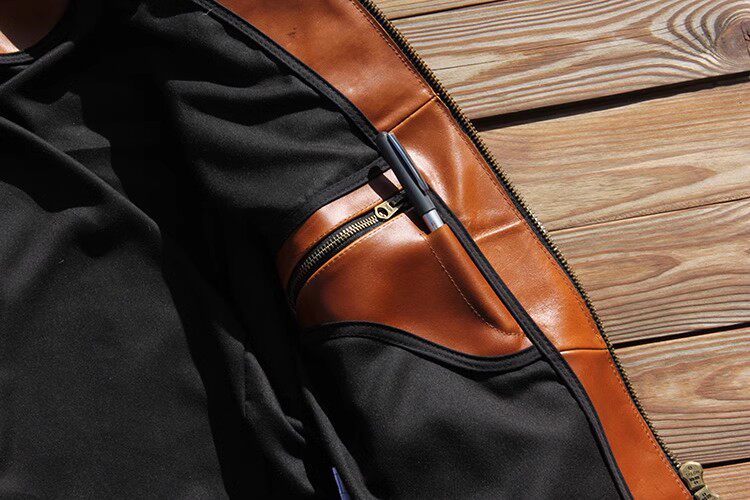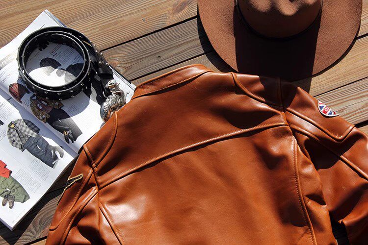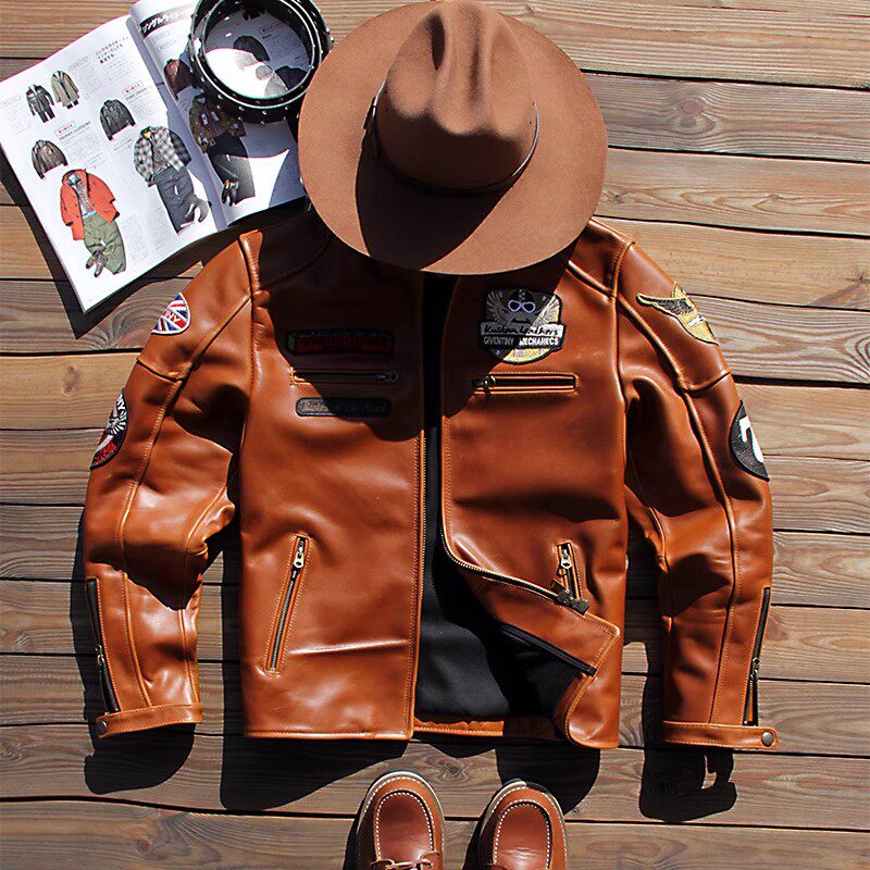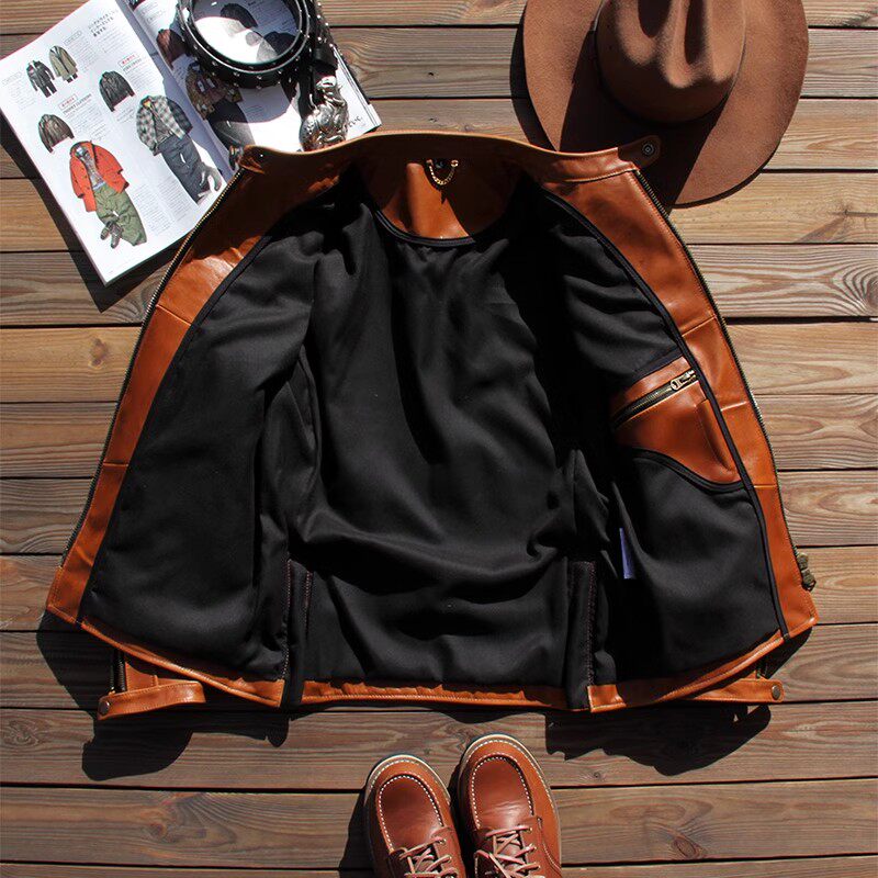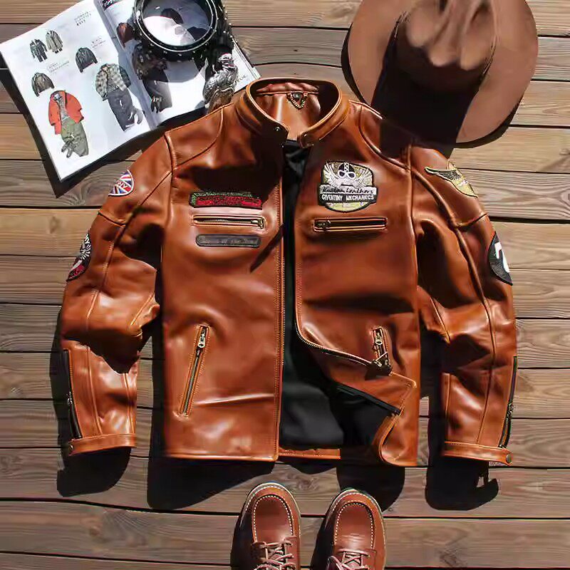 Amejaji Genuine Leather Jacket for Men, Vintage Distressed Cowhide, Stand Collar, Slim Fit, Multi-Label J100 Motorcycle Leather Jacket
