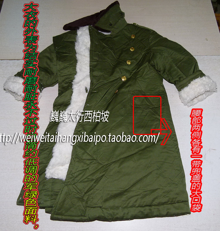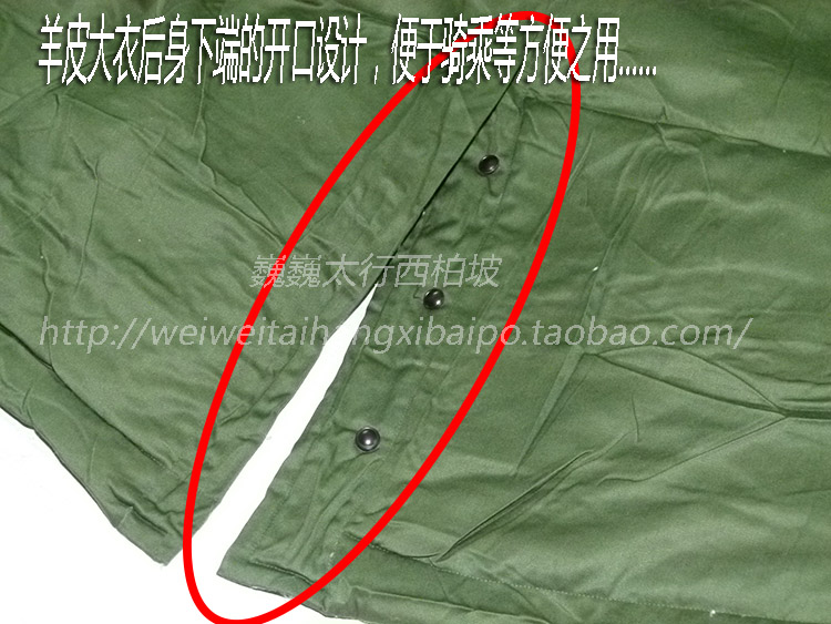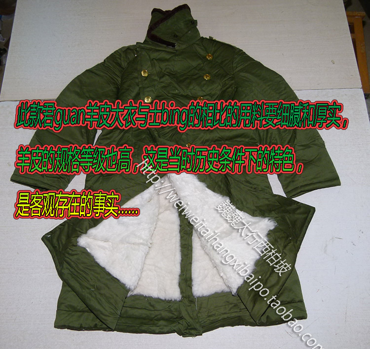 店主点评:遮盖面积大,抗击户外严寒的好装备,3512工厂制造,真皮毛一体的 羊皮大衣,规范的正品(在企鹅空间里有从整包打开之图片)。用料实在,当年,可谓不惜成本!一件皮大衣至少要整张羊皮3-4张,想象一下当今的物价,实在是享受了,~适合寒冬户外作业人士,巡逻人员,以及开长途车以备应对冰雪堵车抛锚类,不能长时间着车的情形的不时之需,并可作为睡觉时盖身上保暖,还有哪些热爱户外的夜钓人士,在远离都市的山野,它既是大衣,又可在宿营时加盖在睡袋外御寒,一专多用的羊皮大衣…… 。新到一包女款,型号相对男款版型要小。,具体的到货为准,仅供参考,谢谢!