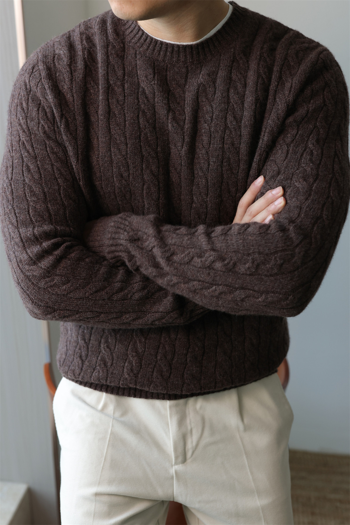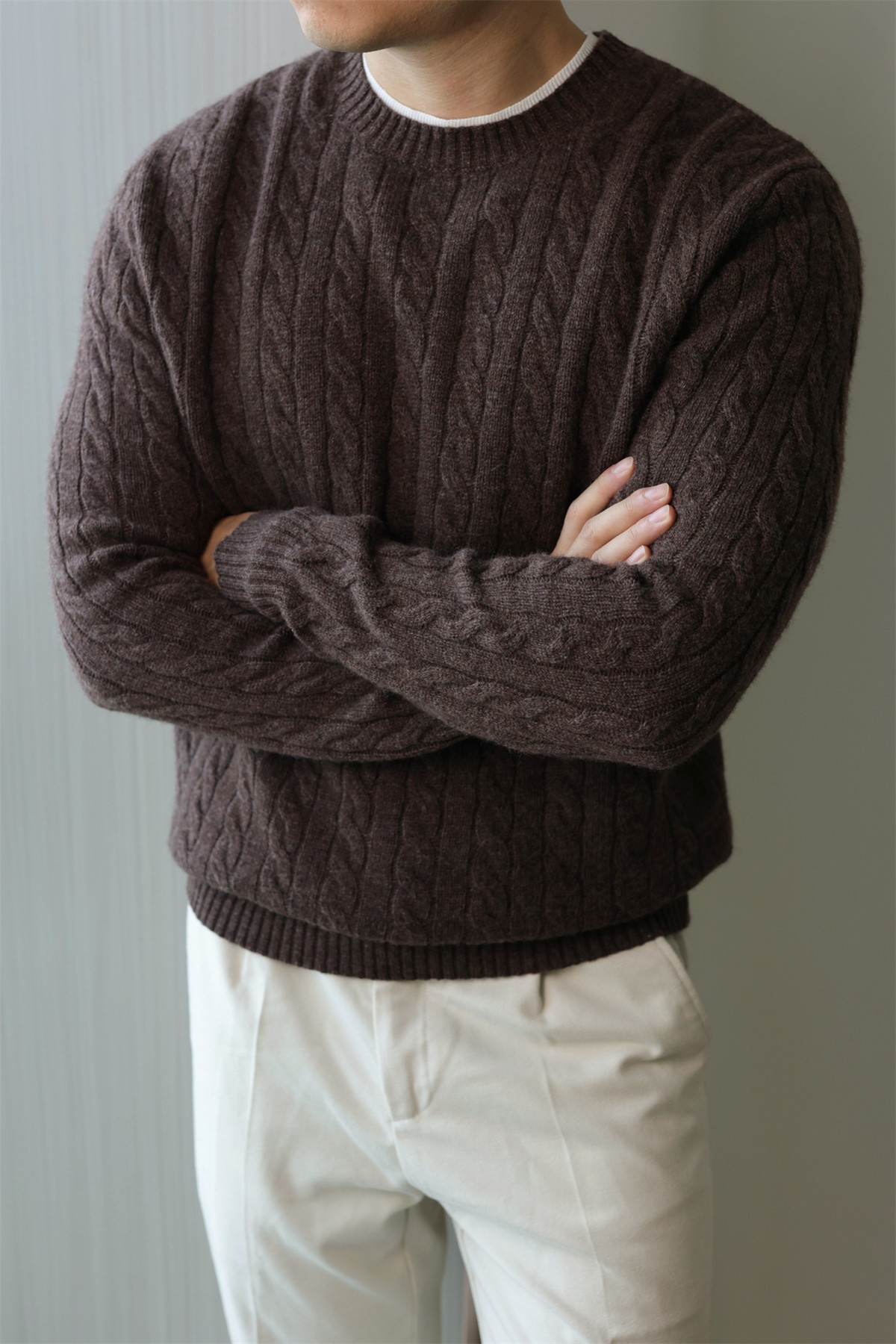 [Merino Wool] Retro Cable Pure Wool Sweater Knitting Round Neck Casual Business Long sleeves Sweater Winter