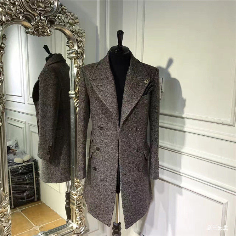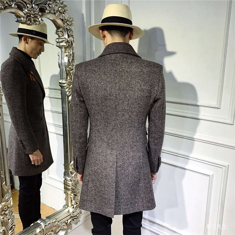 Autumn and Winter British Style Men's Herringbone Woolen Coat Korean Style Slim Mid-Length Double-Breasted Woolen Coat