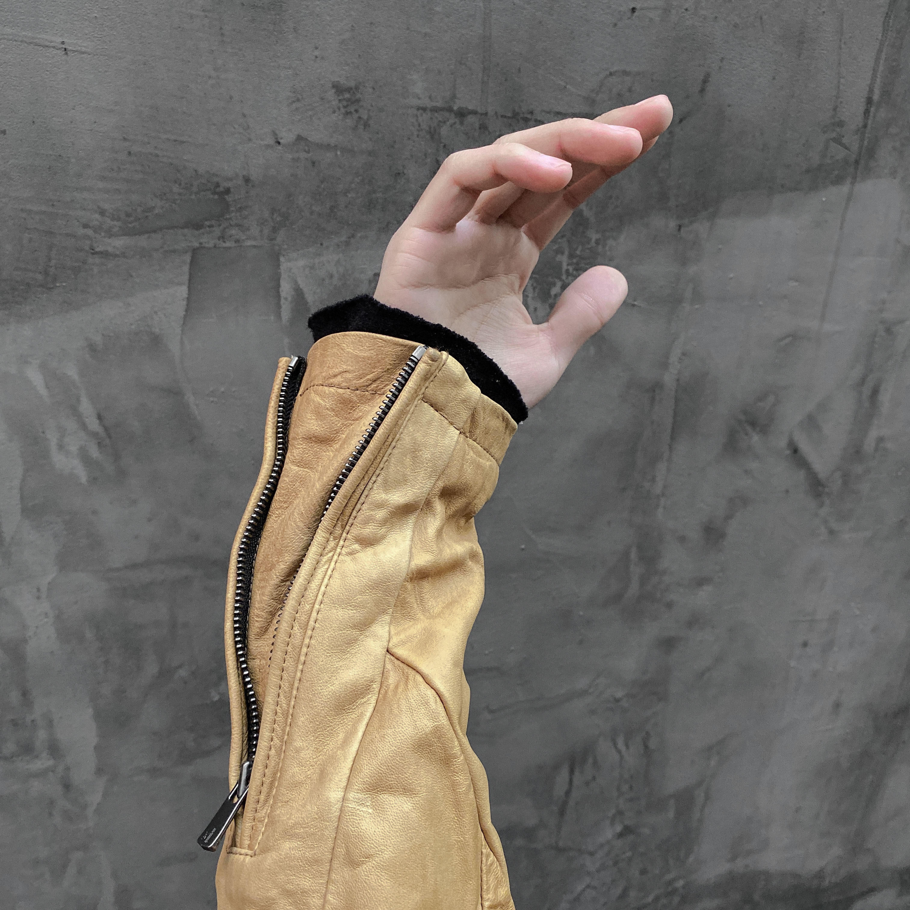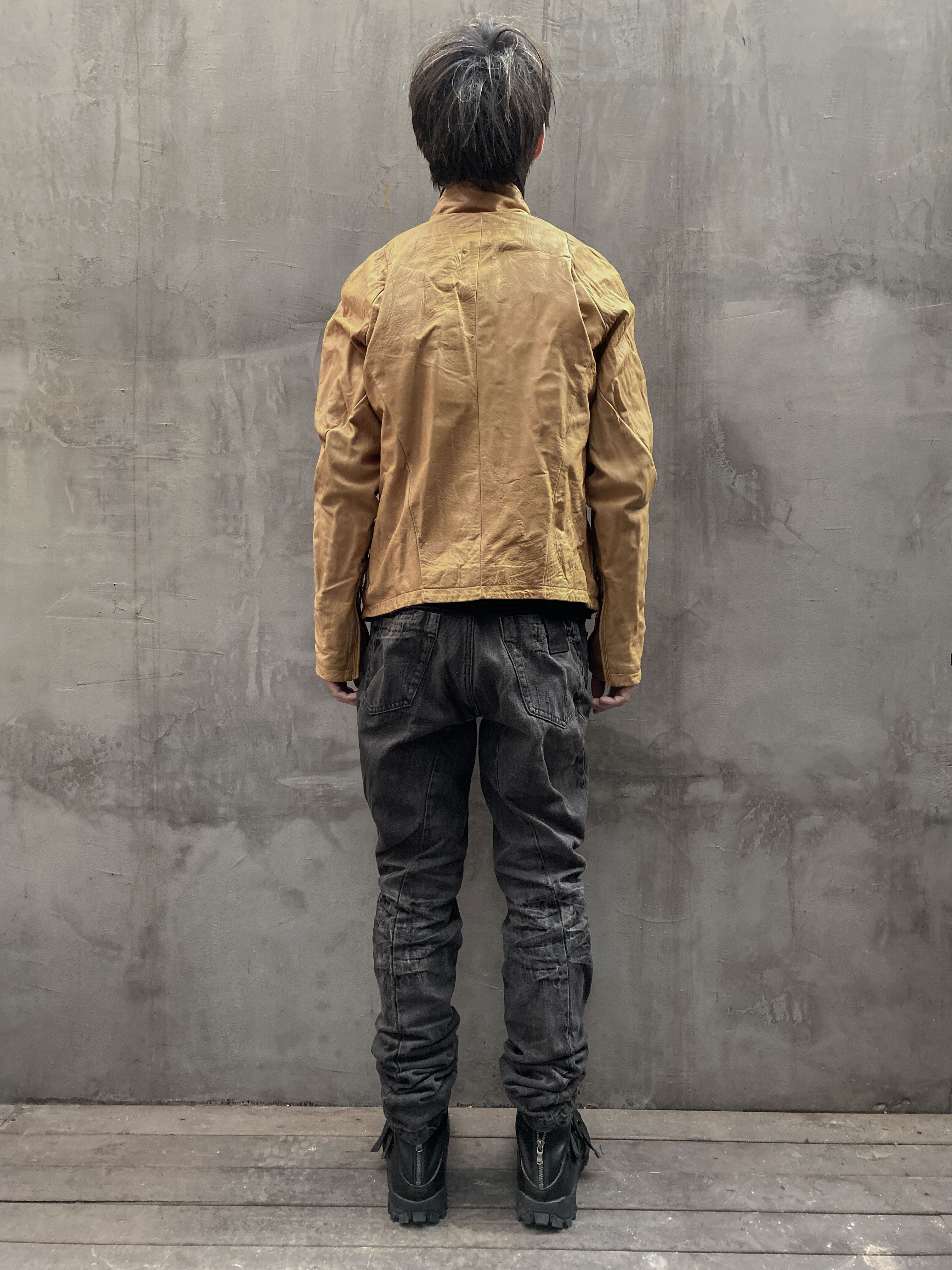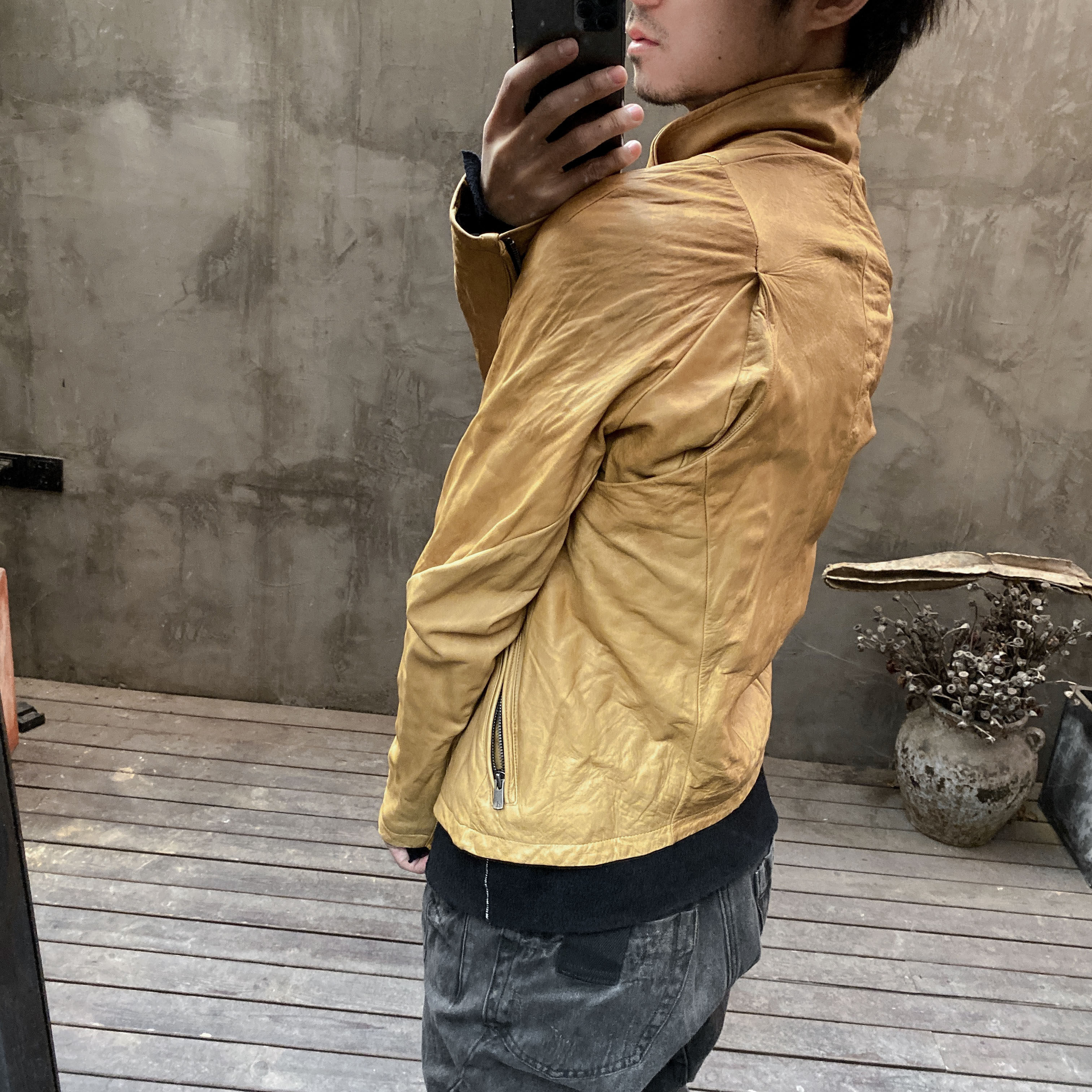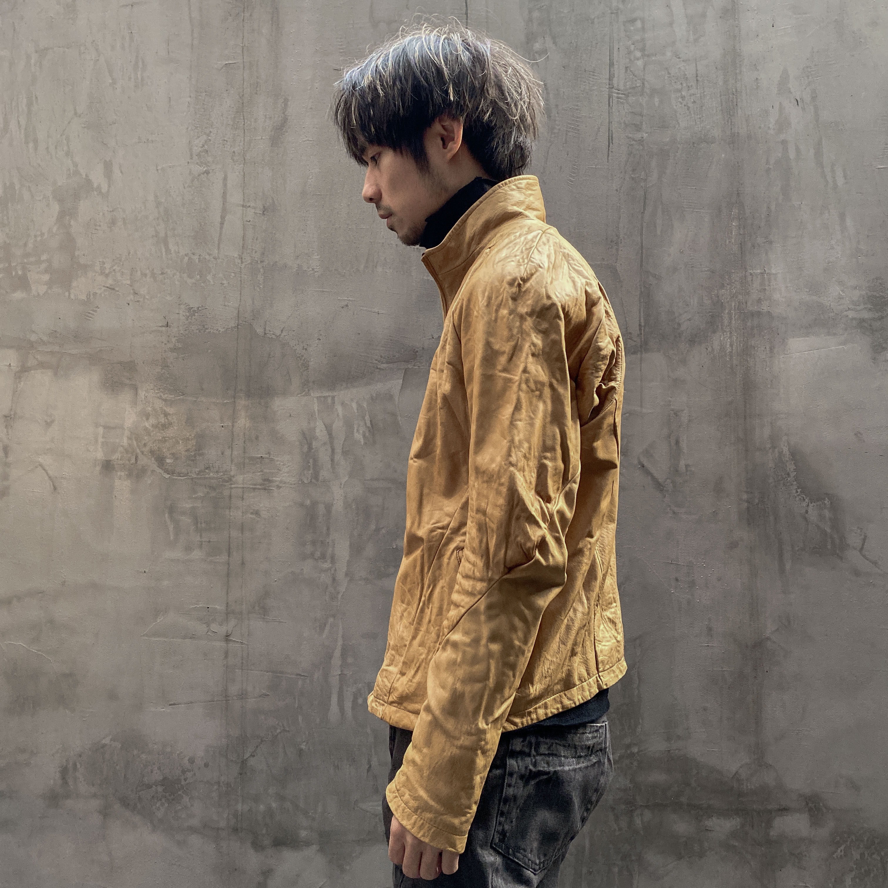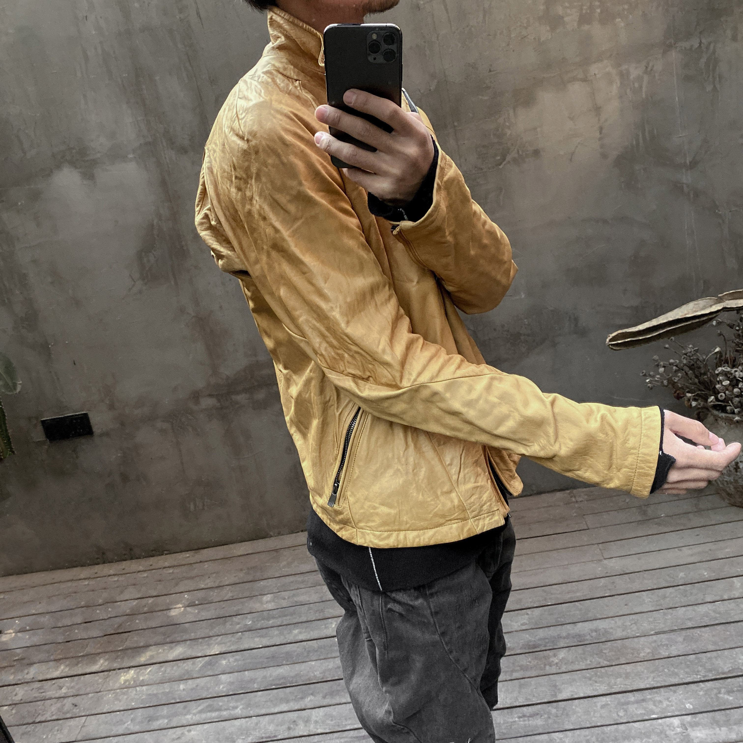 Unnaming Xia Real Shot Original Washed and Distressed Yellow Genuine Sheepskin Men's Short Jacket Stand Collar Biker Jacket