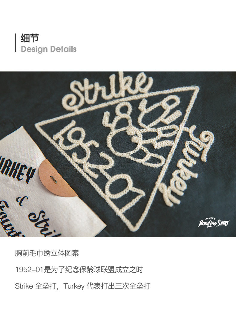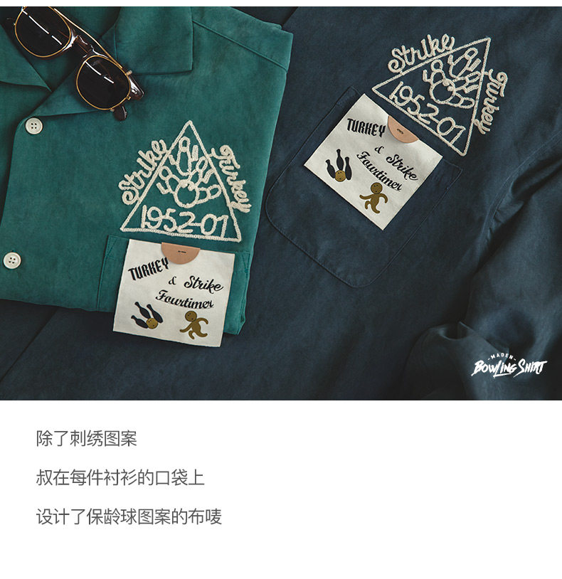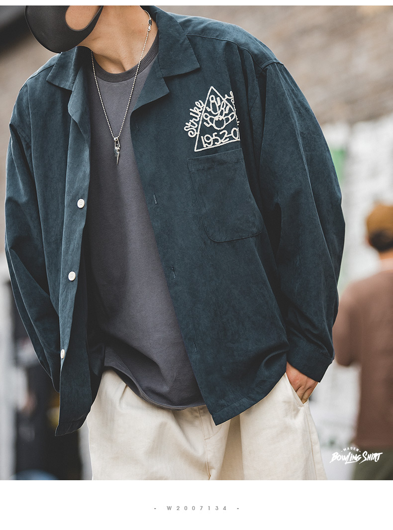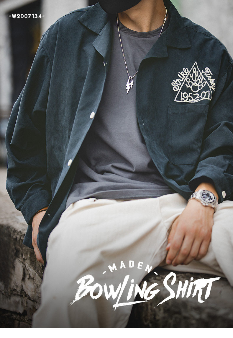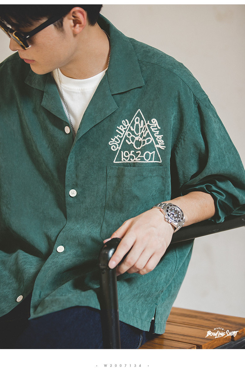Madden Workwear American Retro Dark Green Shirt Peach Skin Brushed Embroidery Loose Lapel Bowling Shirt Men's Spring