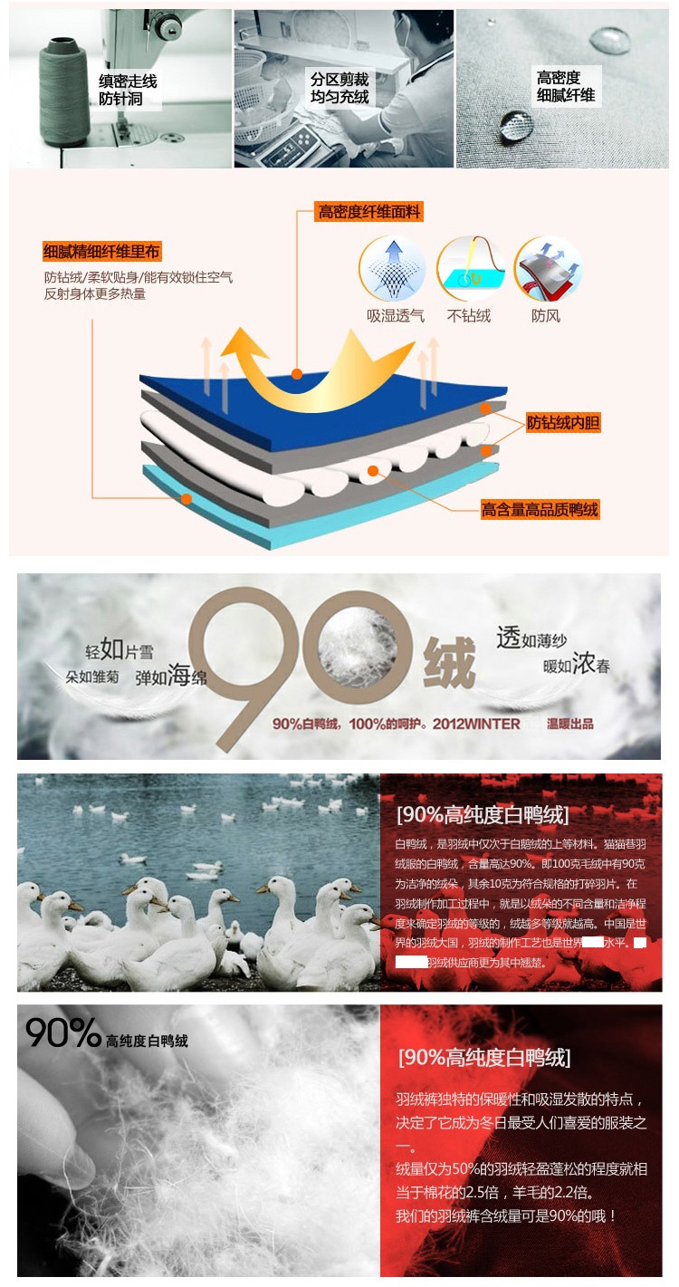 羽绒裤采用90%白鸭绒,均可拆开验绒!