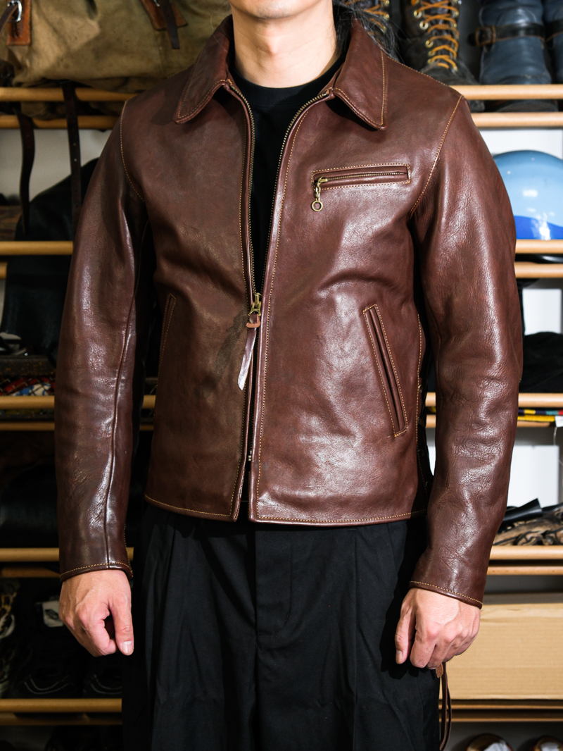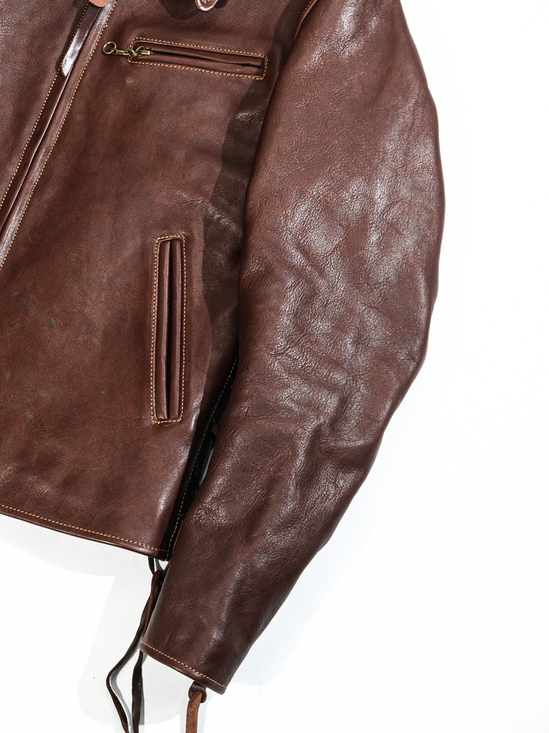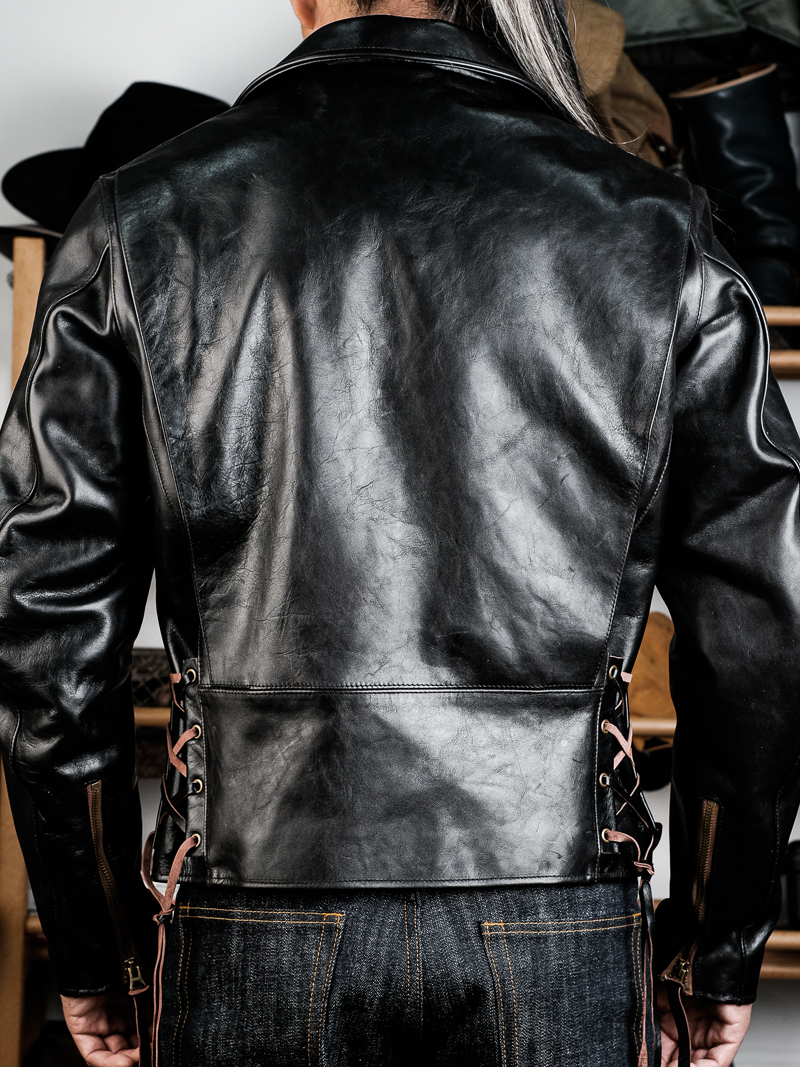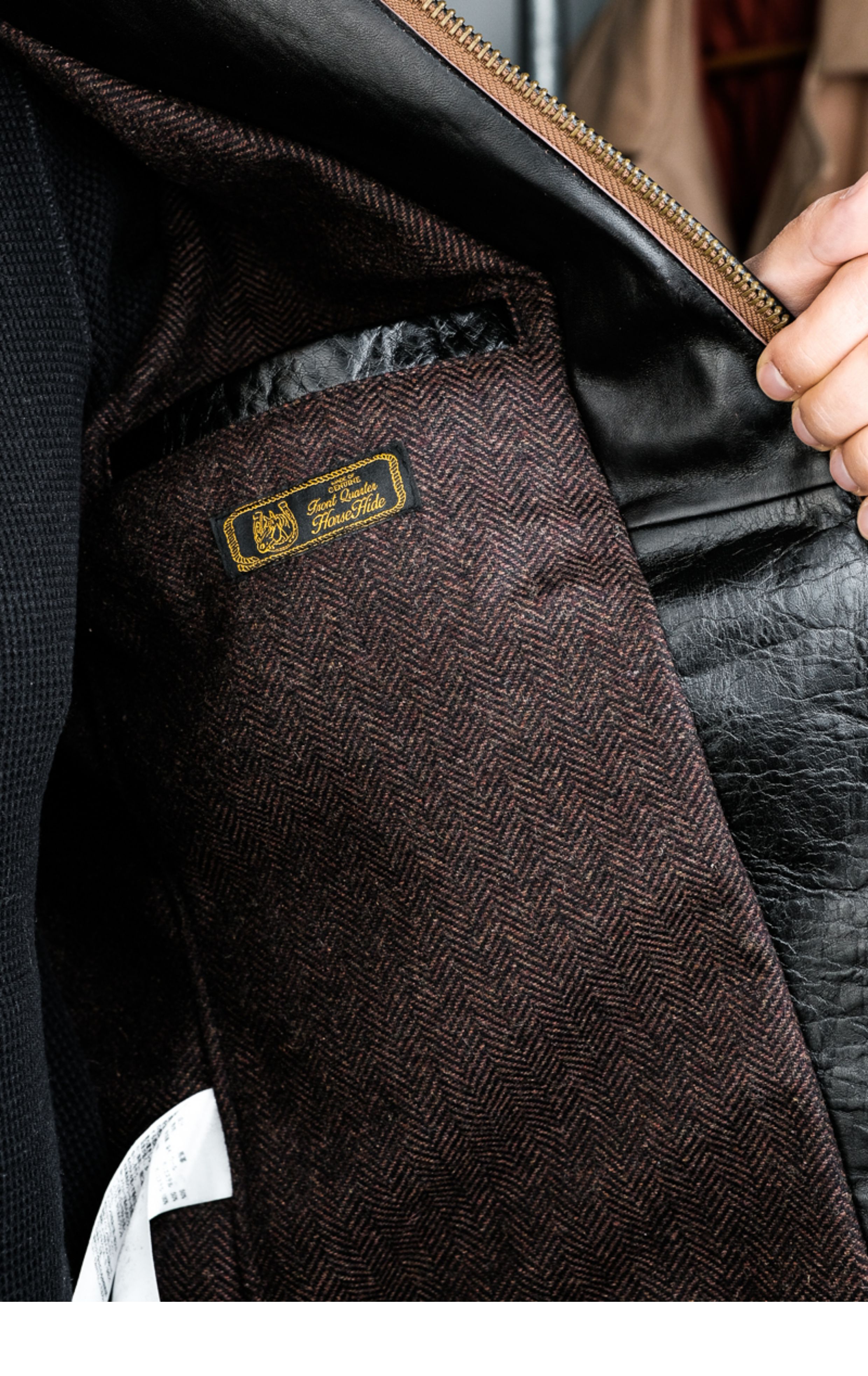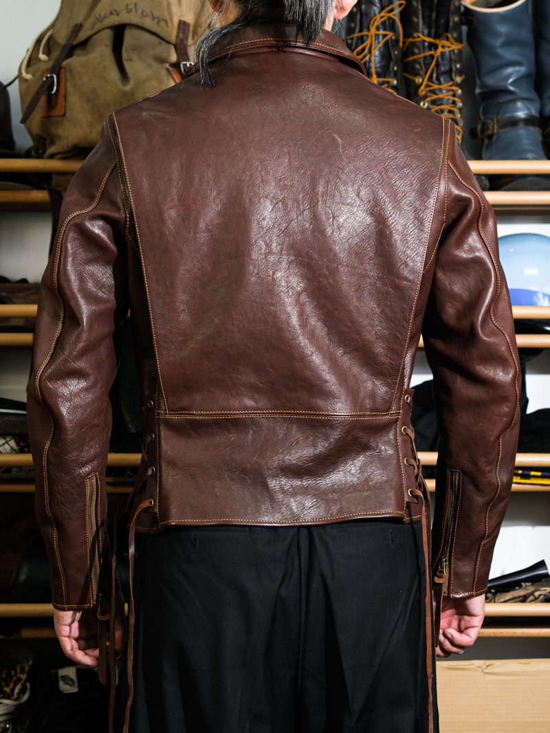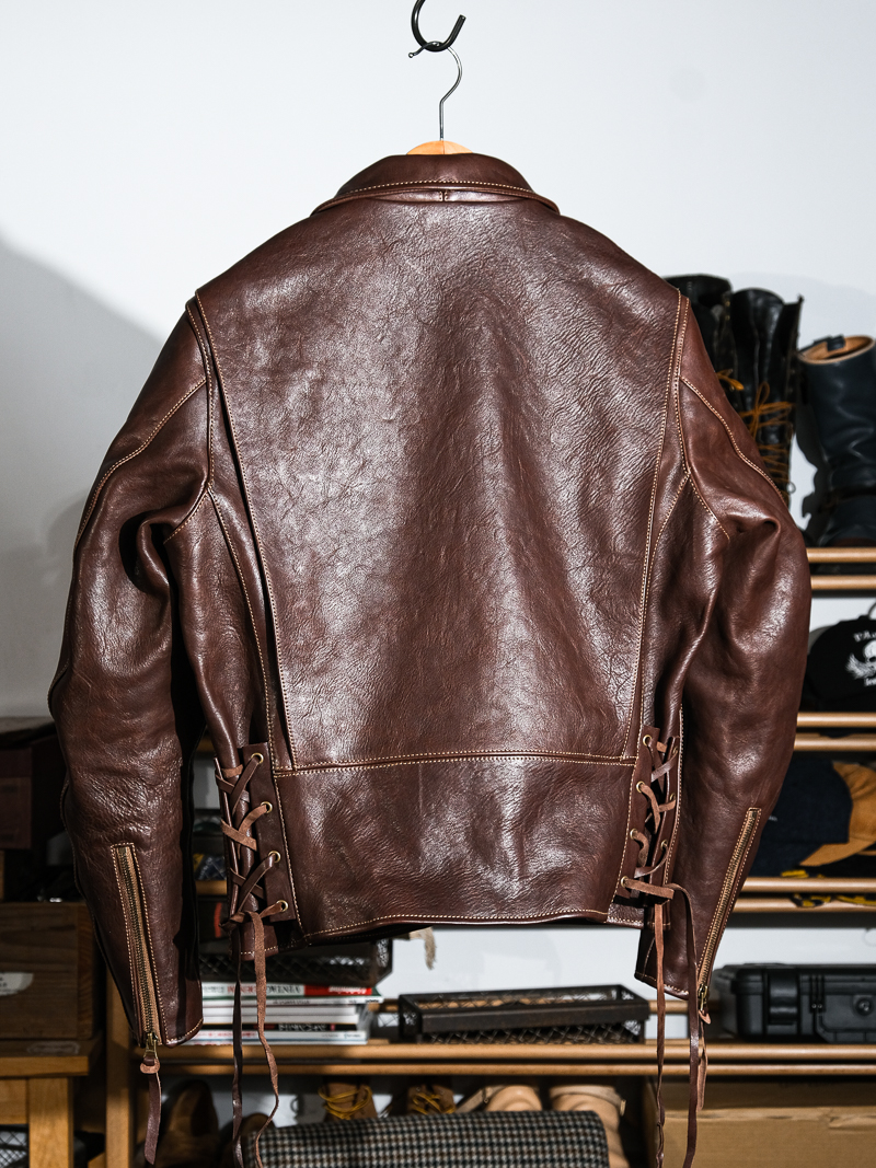 California Mounted Police Jacket, Water-Dyed Brown Horse Leather, Black Padova Tea-Colored Horse Leather, Wool Lining, Full Leather Back