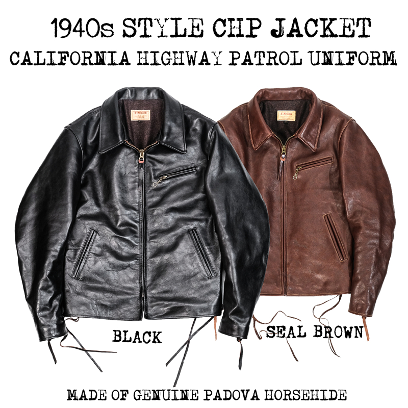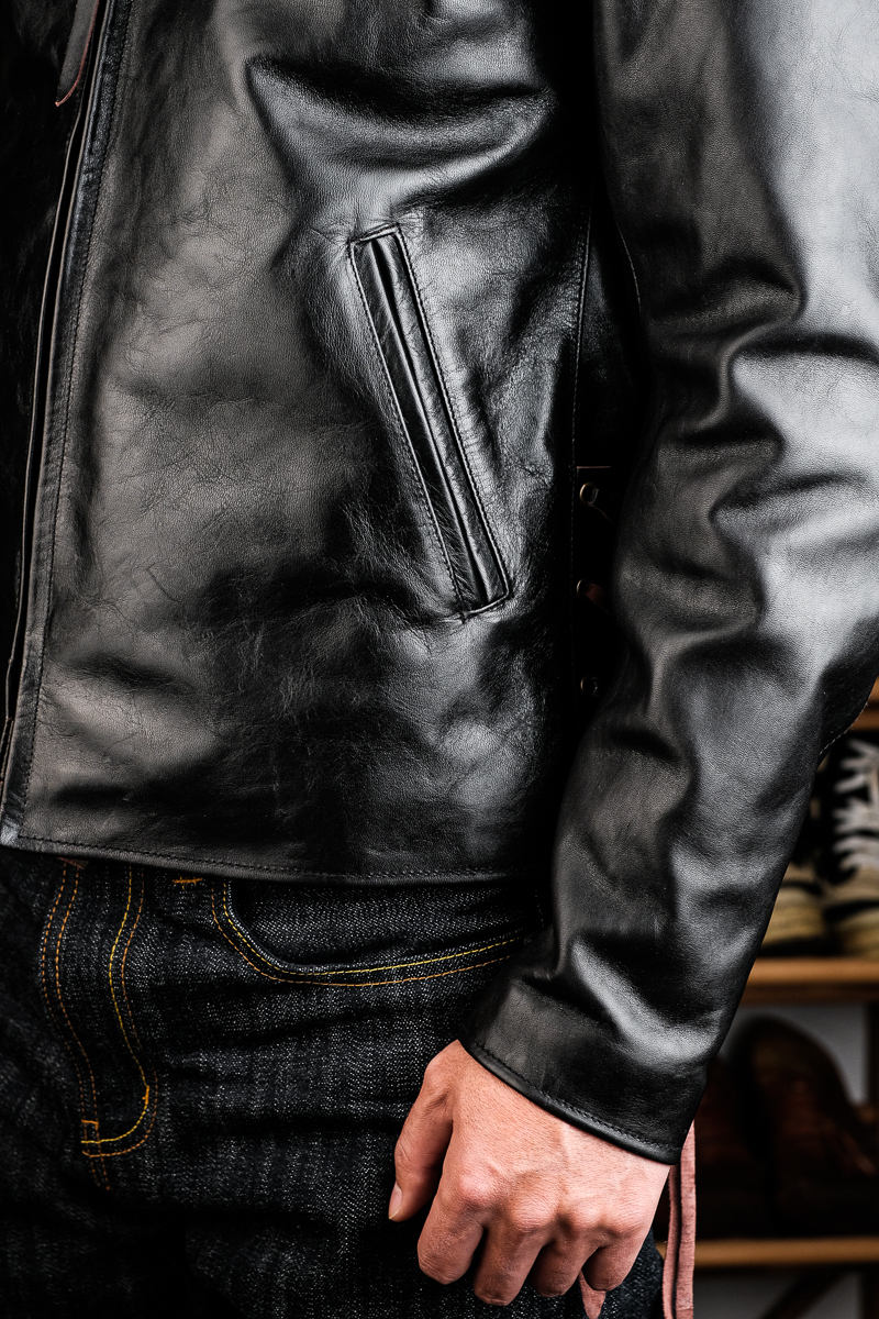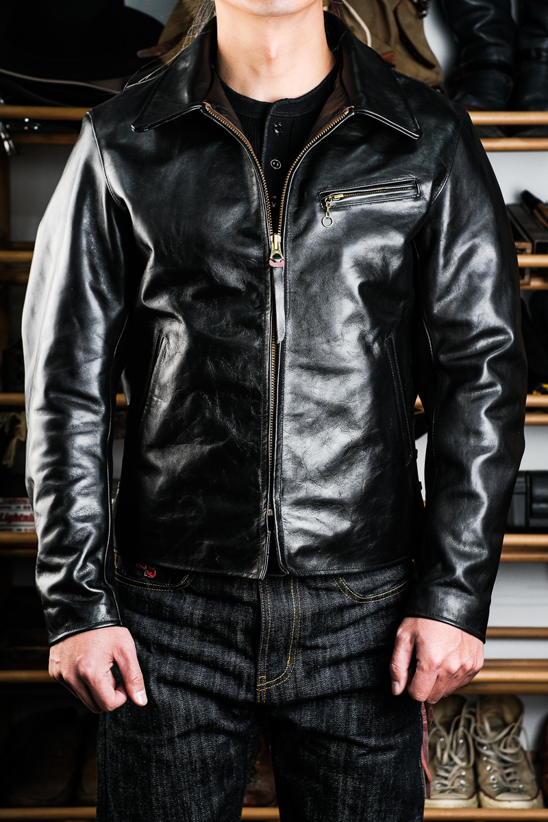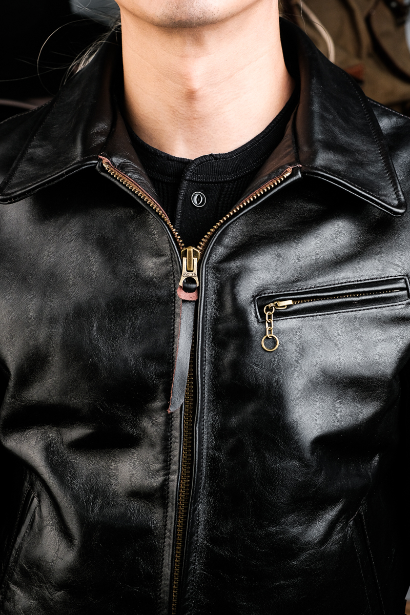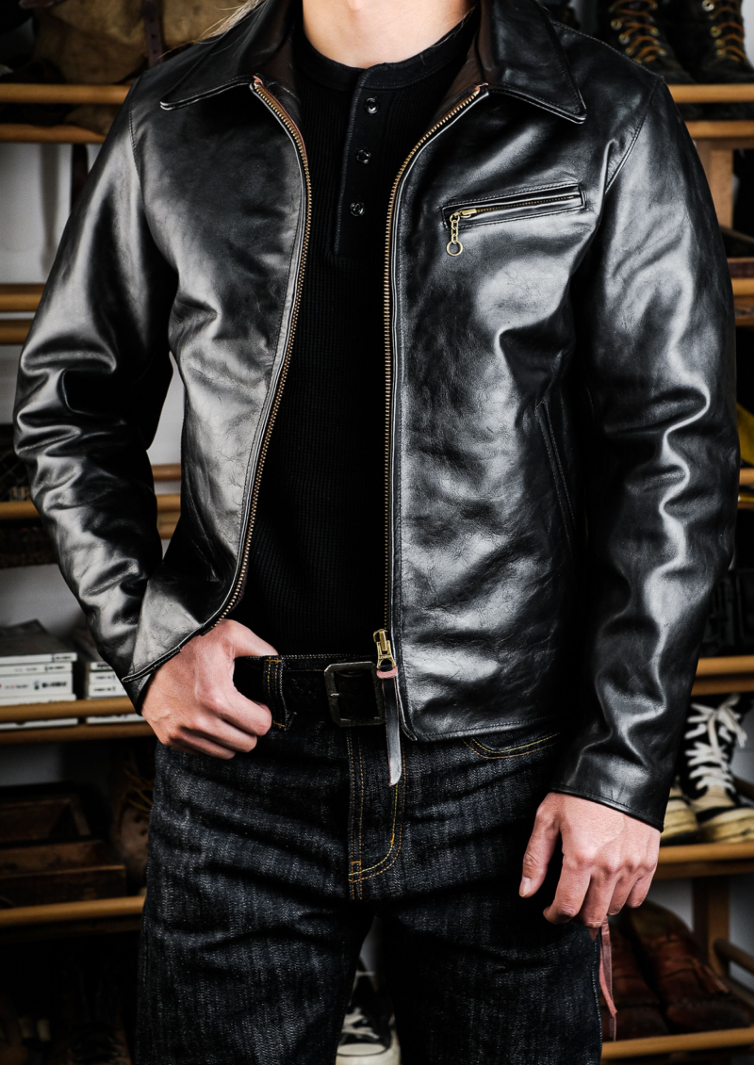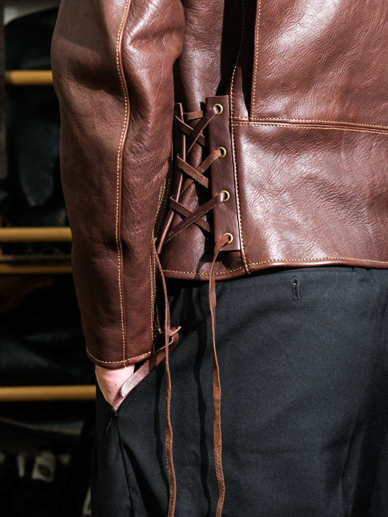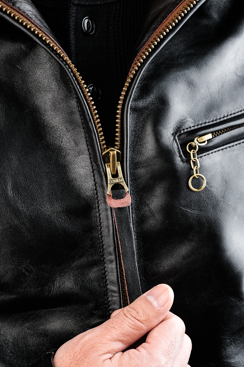 California Mounted Police Jacket, Water-Dyed Brown Horse Leather, Black Padova Tea-Colored Horse Leather, Wool Lining, Full Leather Back