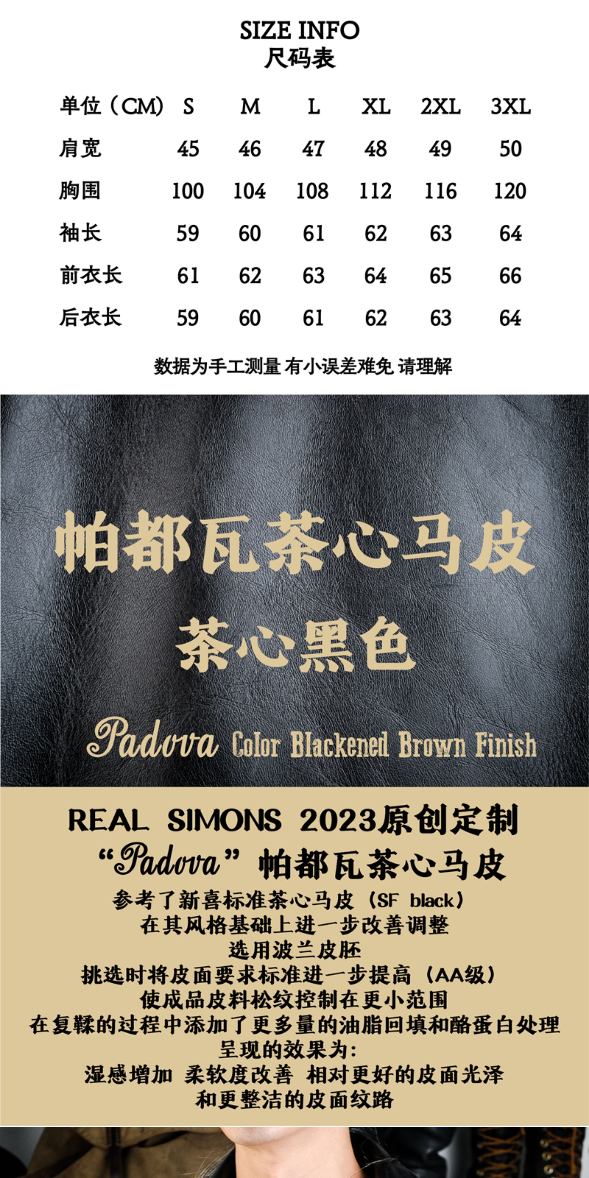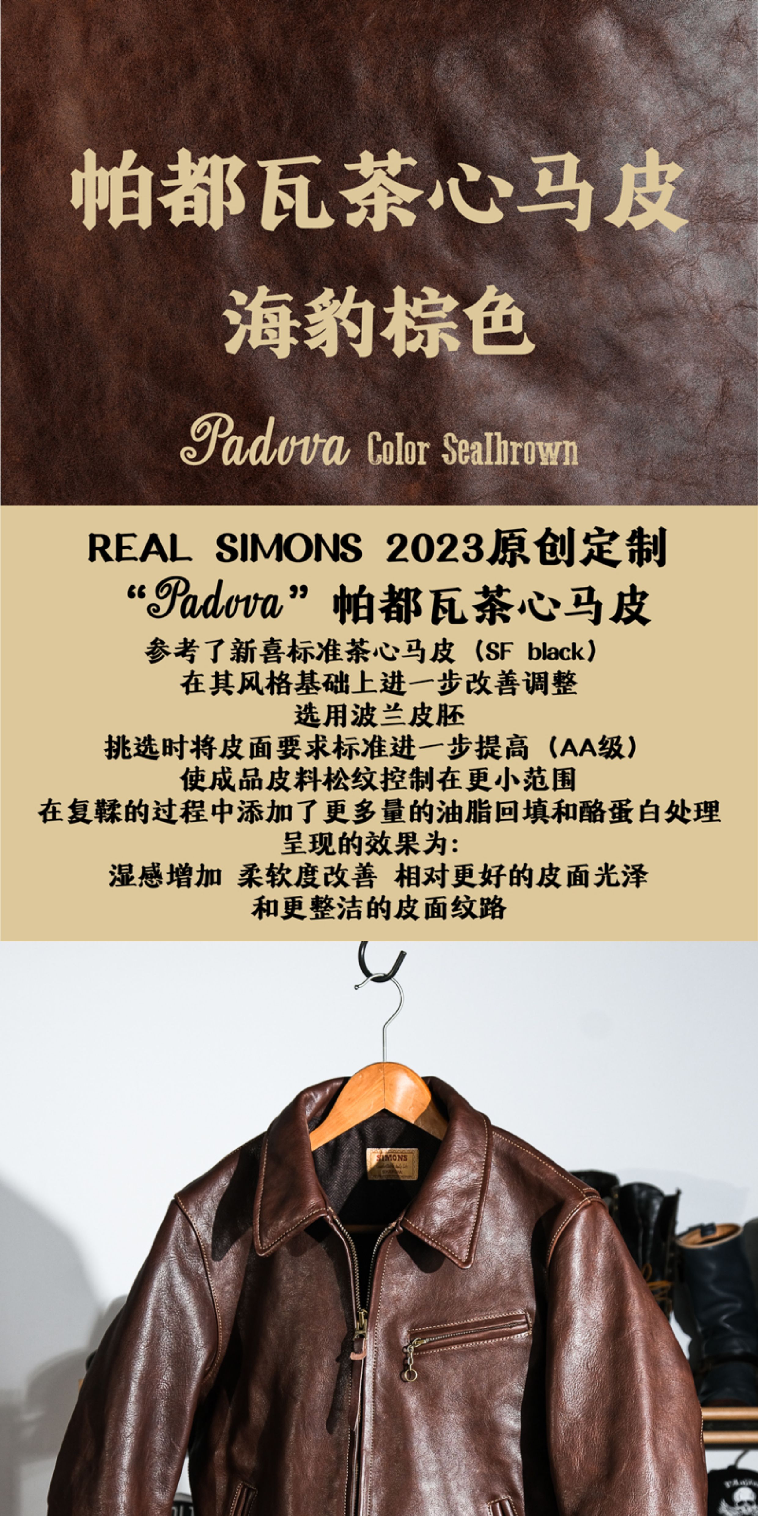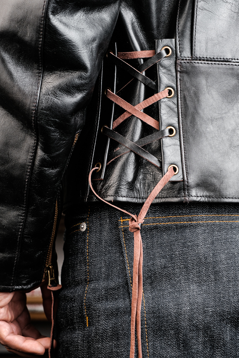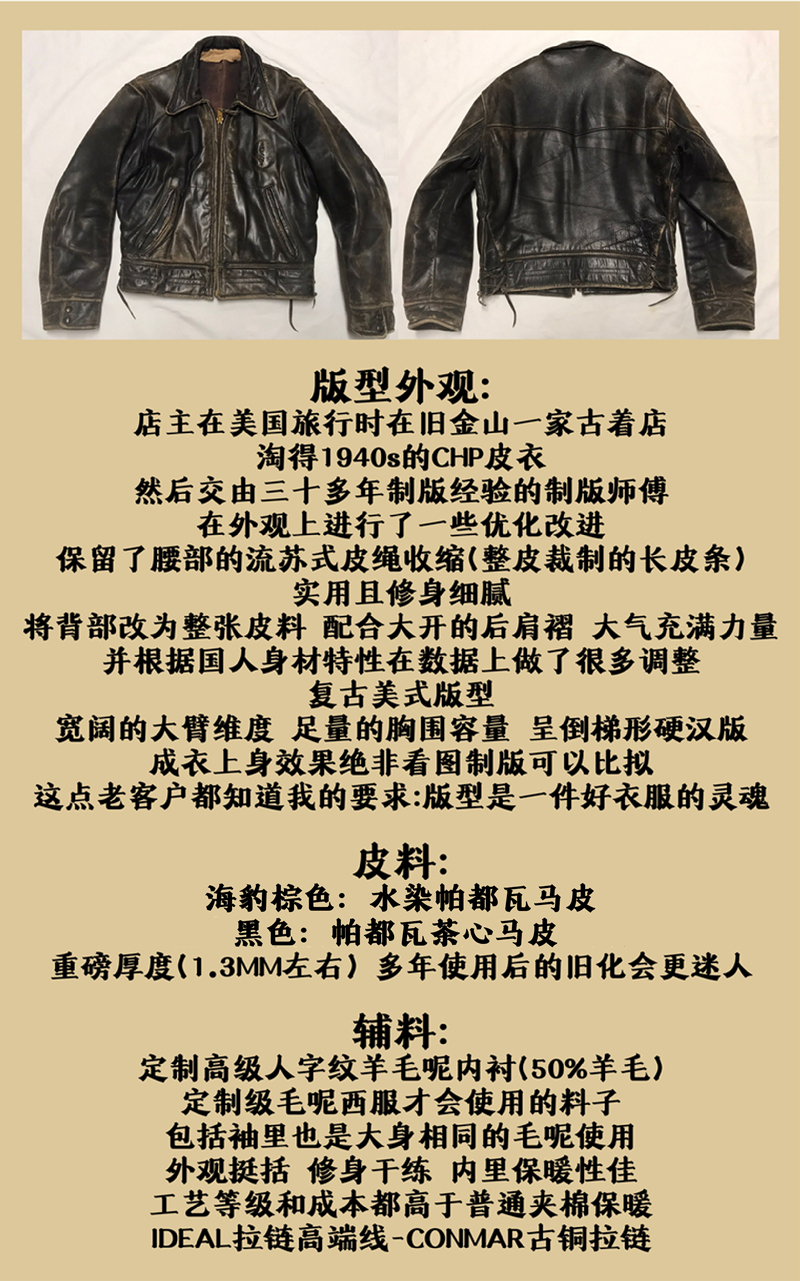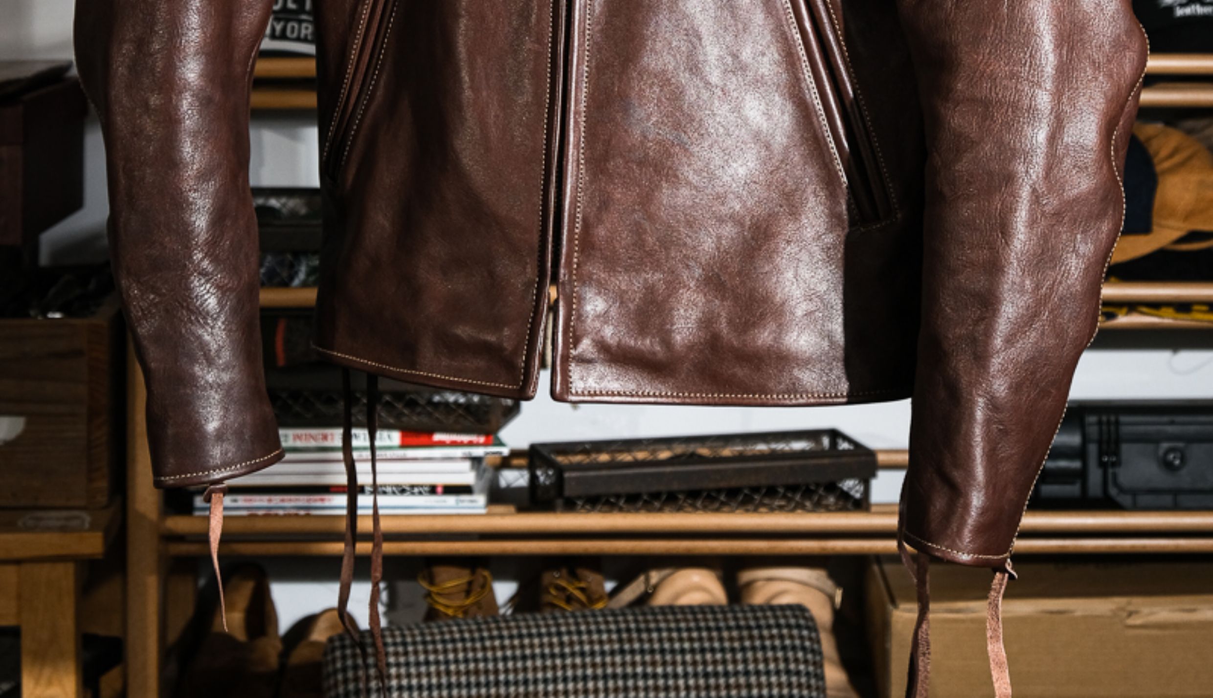 California Mounted Police Jacket, Water-Dyed Brown Horse Leather, Black Padova Tea-Colored Horse Leather, Wool Lining, Full Leather Back