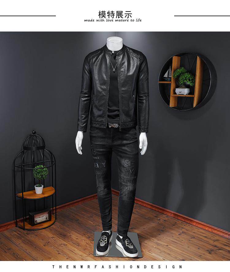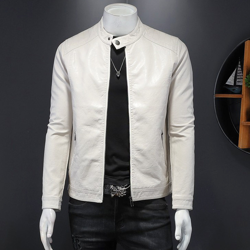 Spring Casual Stand-Up Collar Biker Leather Jacket for Men, Thin Pu Leather Jacket, Short Style, Large Size, Fleece-Lined Leather Parka Jacket