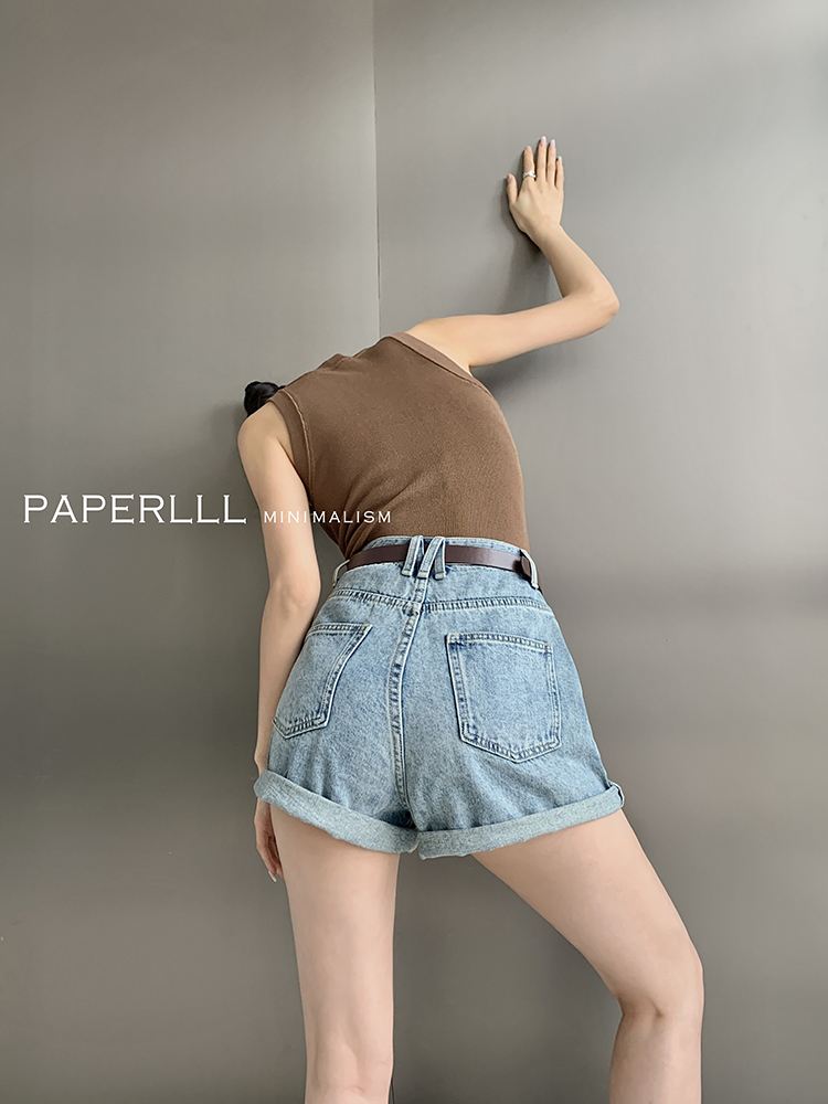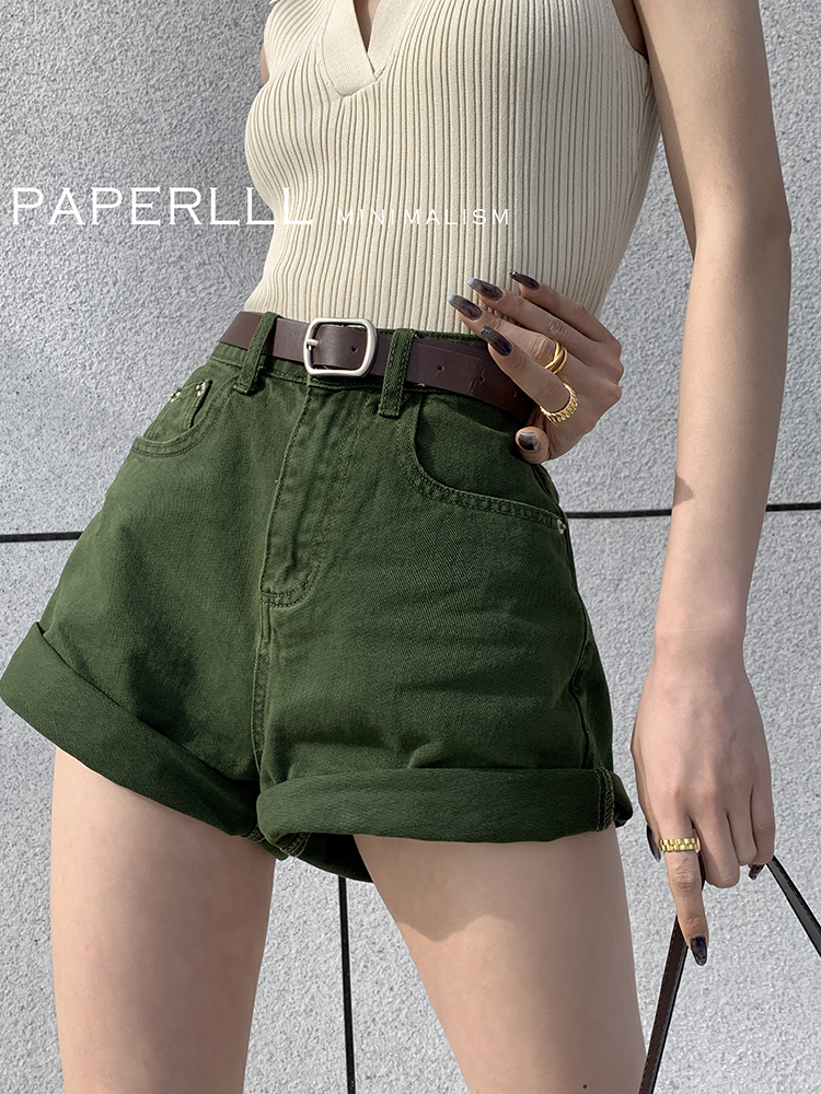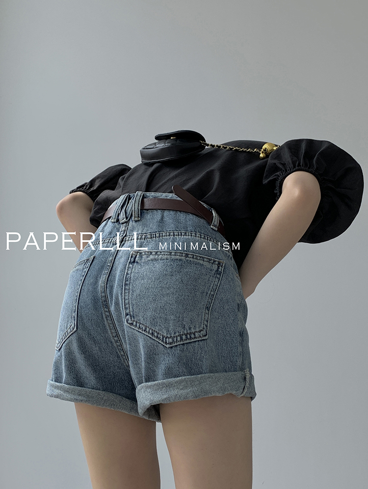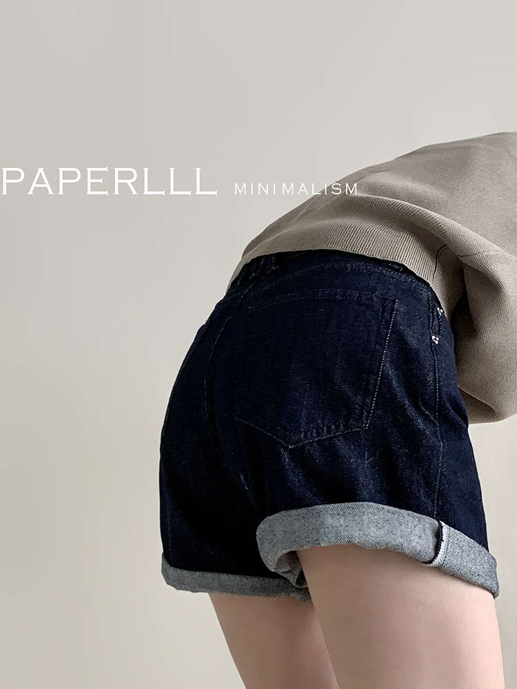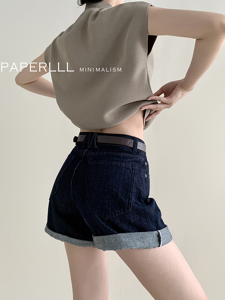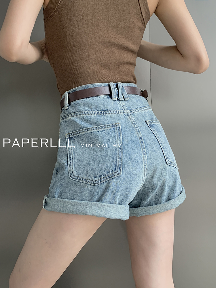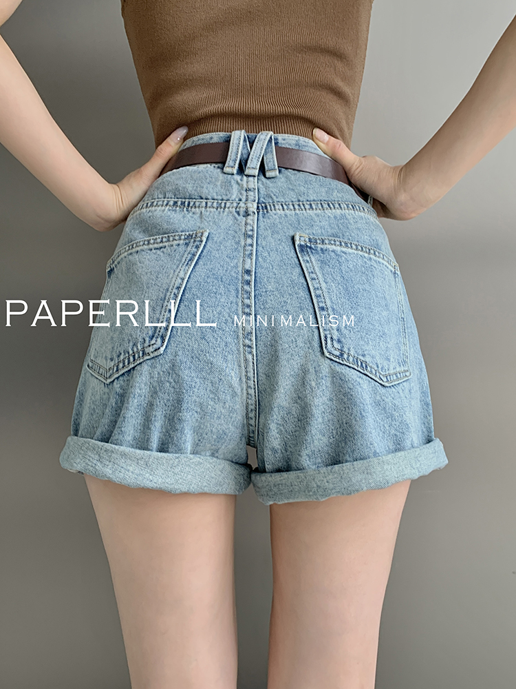 Paperlll Xinjian 2025 New A-Line Retro American High-Waisted Hot Pants Rolled Hem Denim Shorts for Women Summer