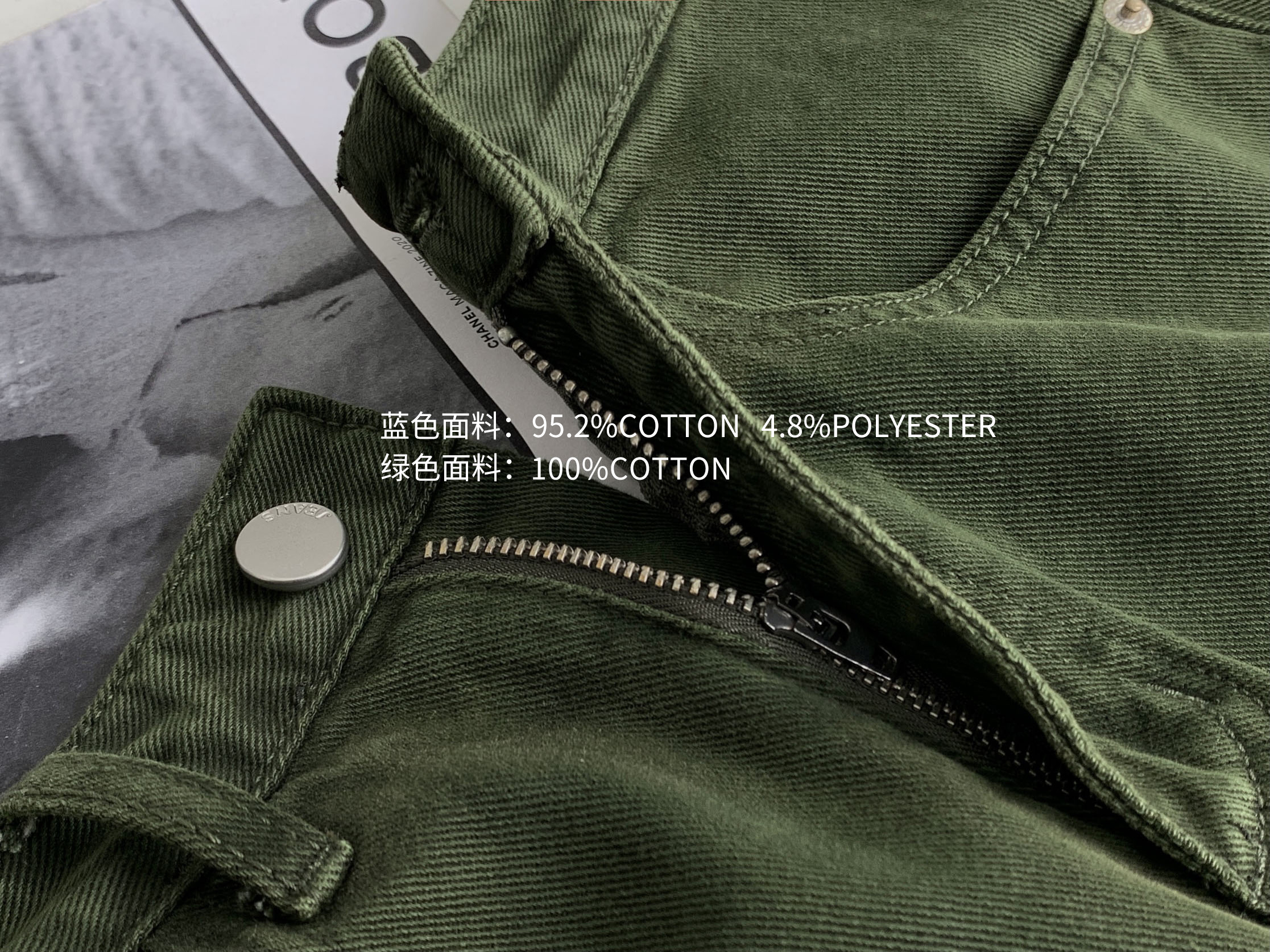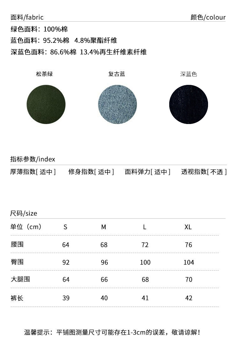复古蓝和松茶绿选用了全棉牛仔面料