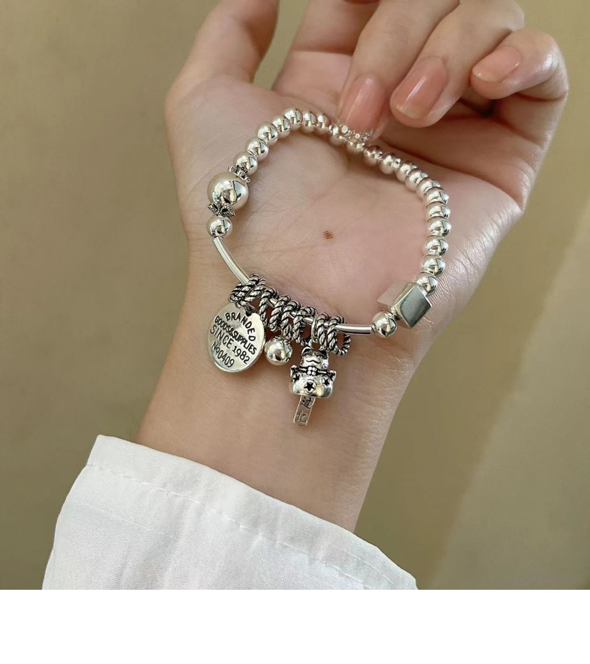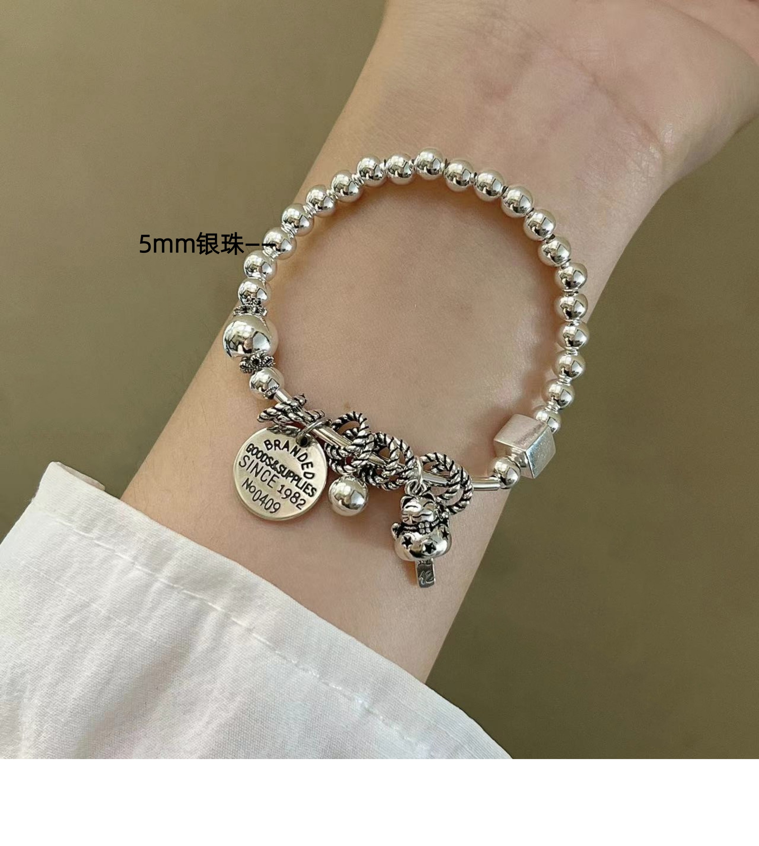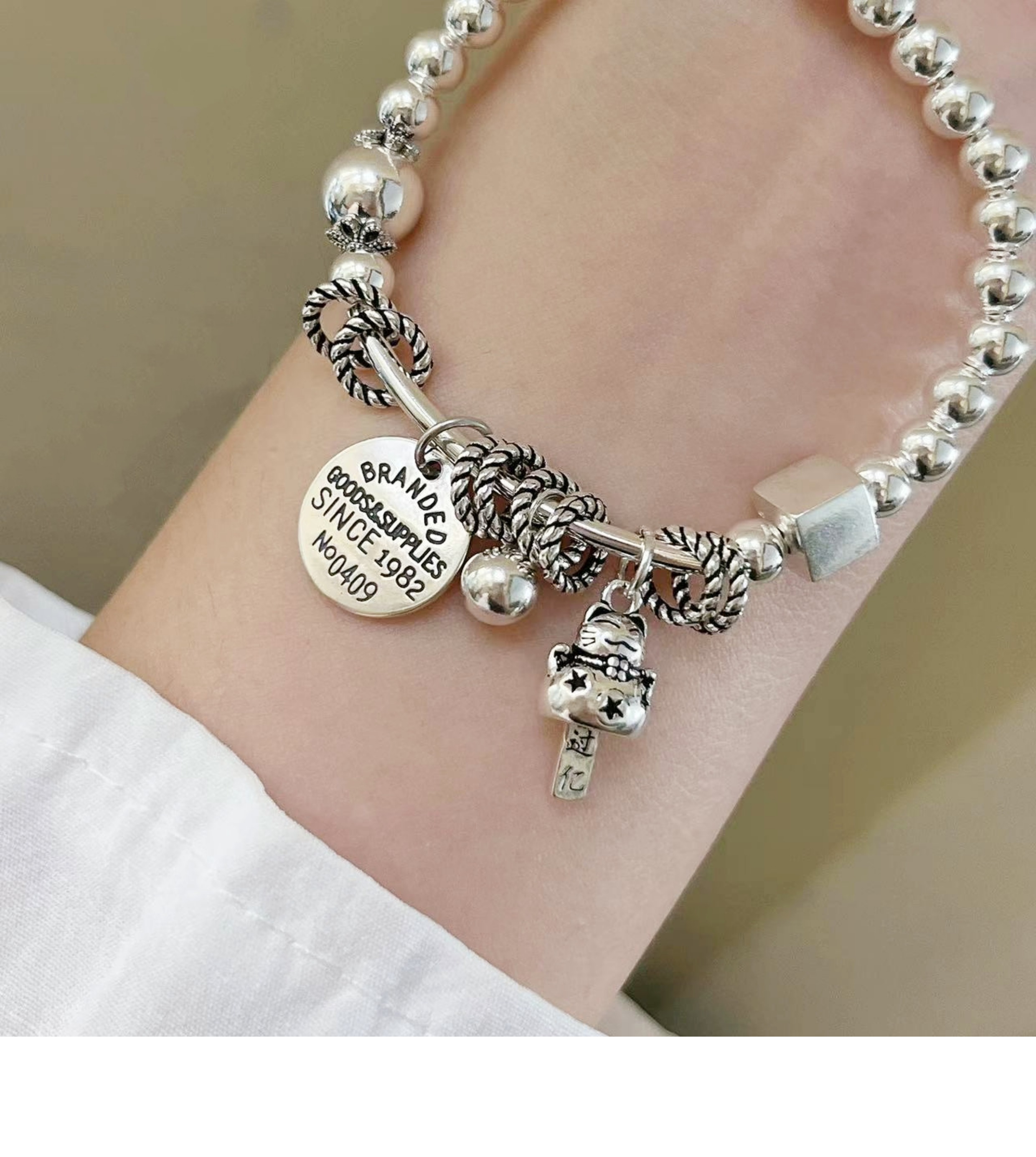 S925 Sterling Silver Vintage Lucky Cat Round Pendant Bracelet for Women, Round Bead Elastic Handmade Single Circle Bracelet, Versatile Birthday Gift