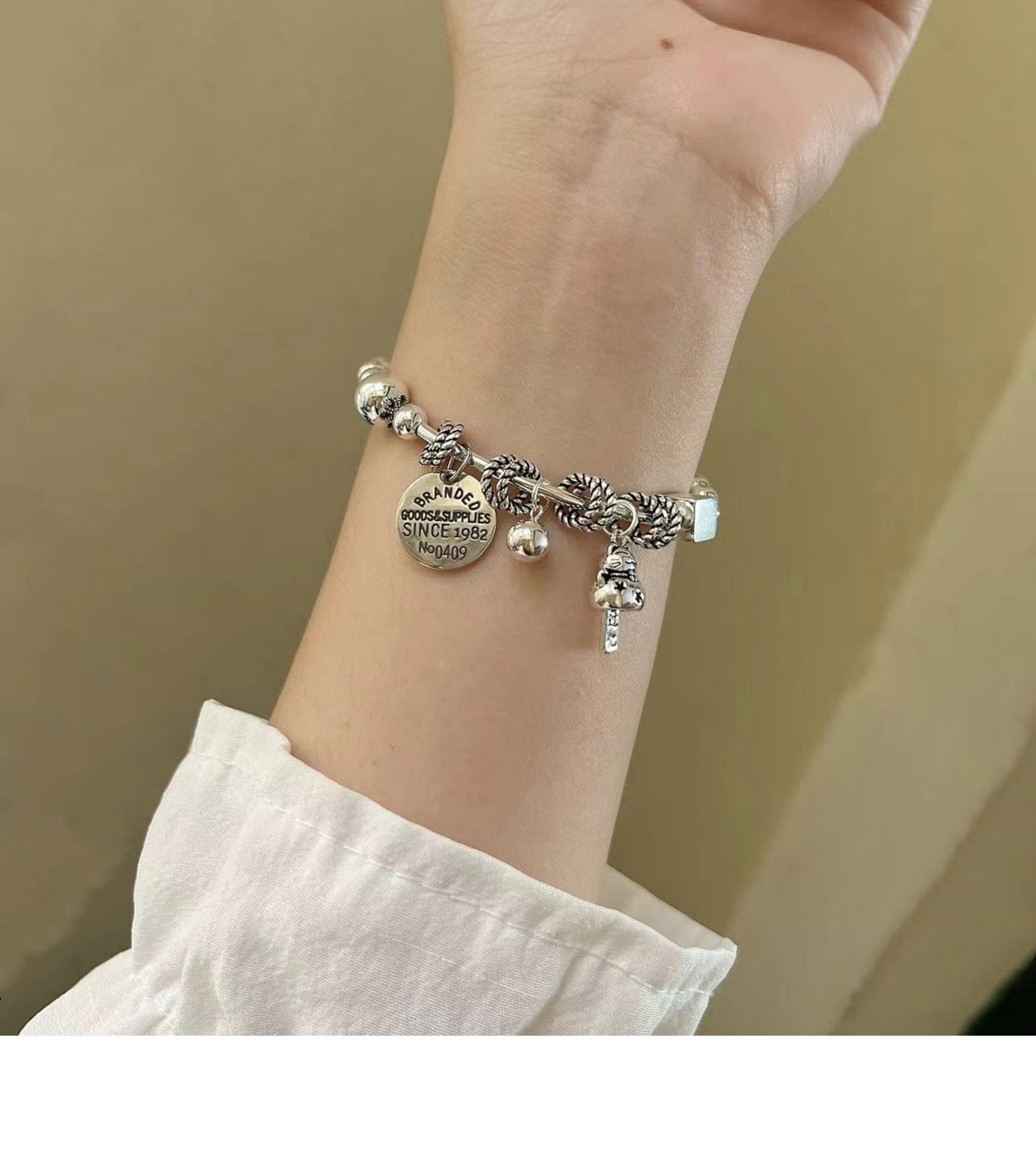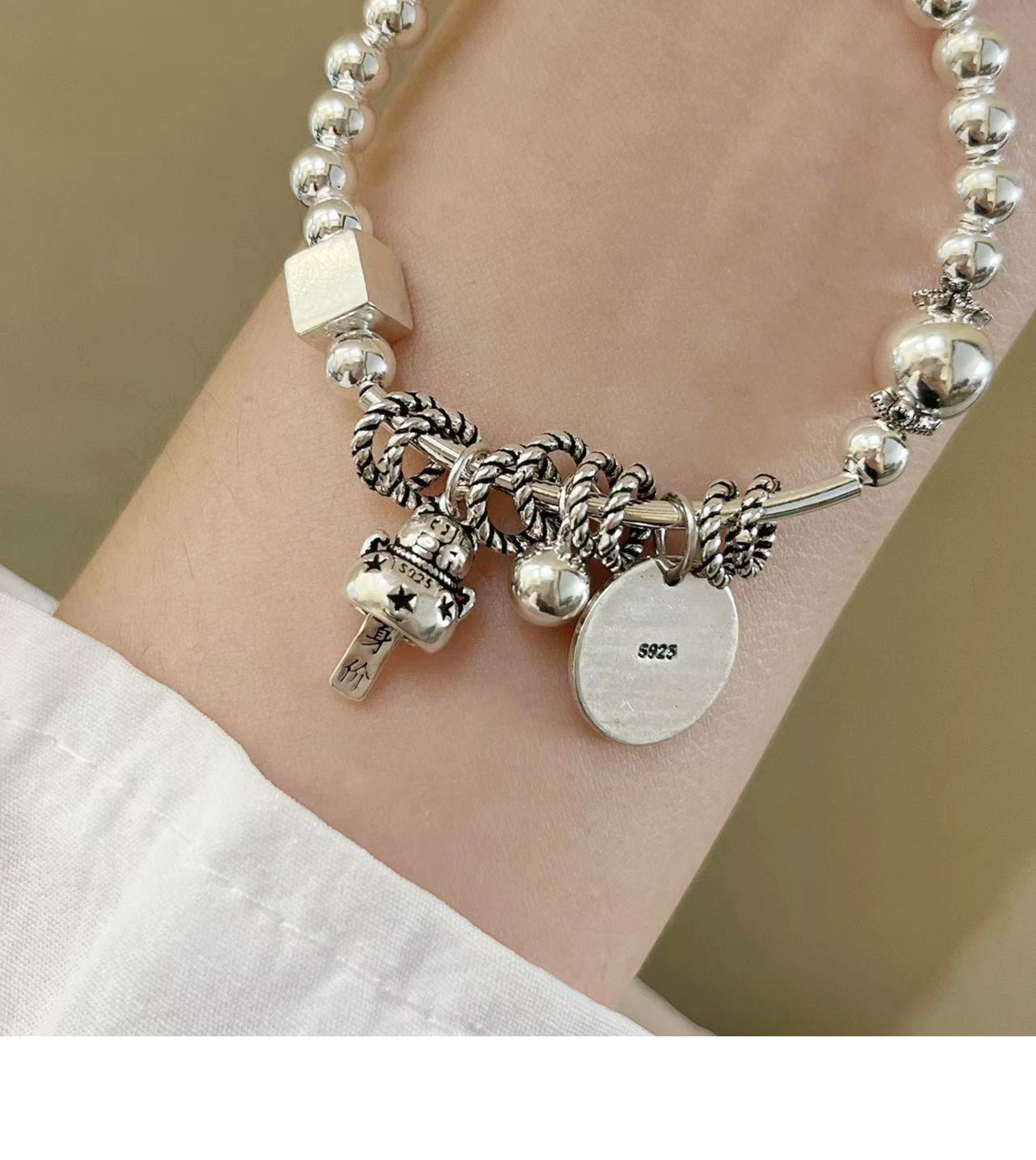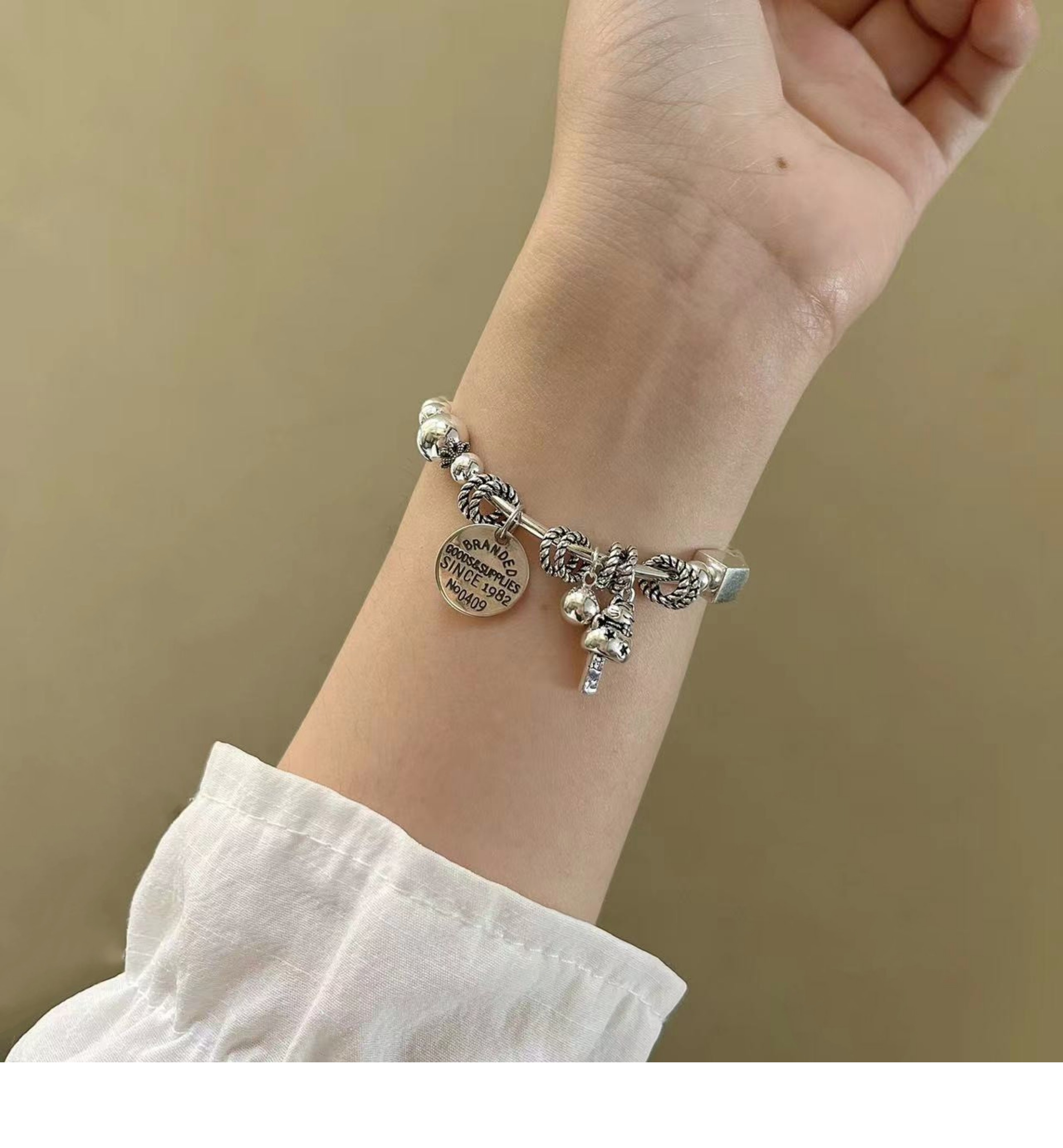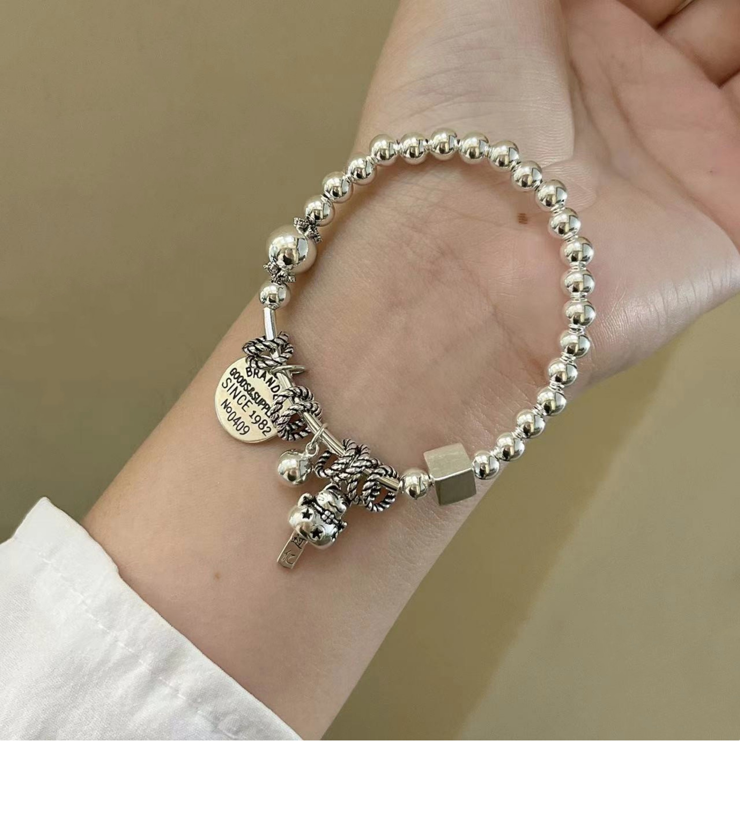 S925 Sterling Silver Vintage Lucky Cat Round Pendant Bracelet for Women, Round Bead Elastic Handmade Single Circle Bracelet, Versatile Birthday Gift