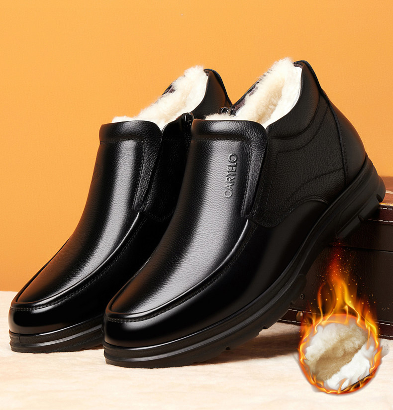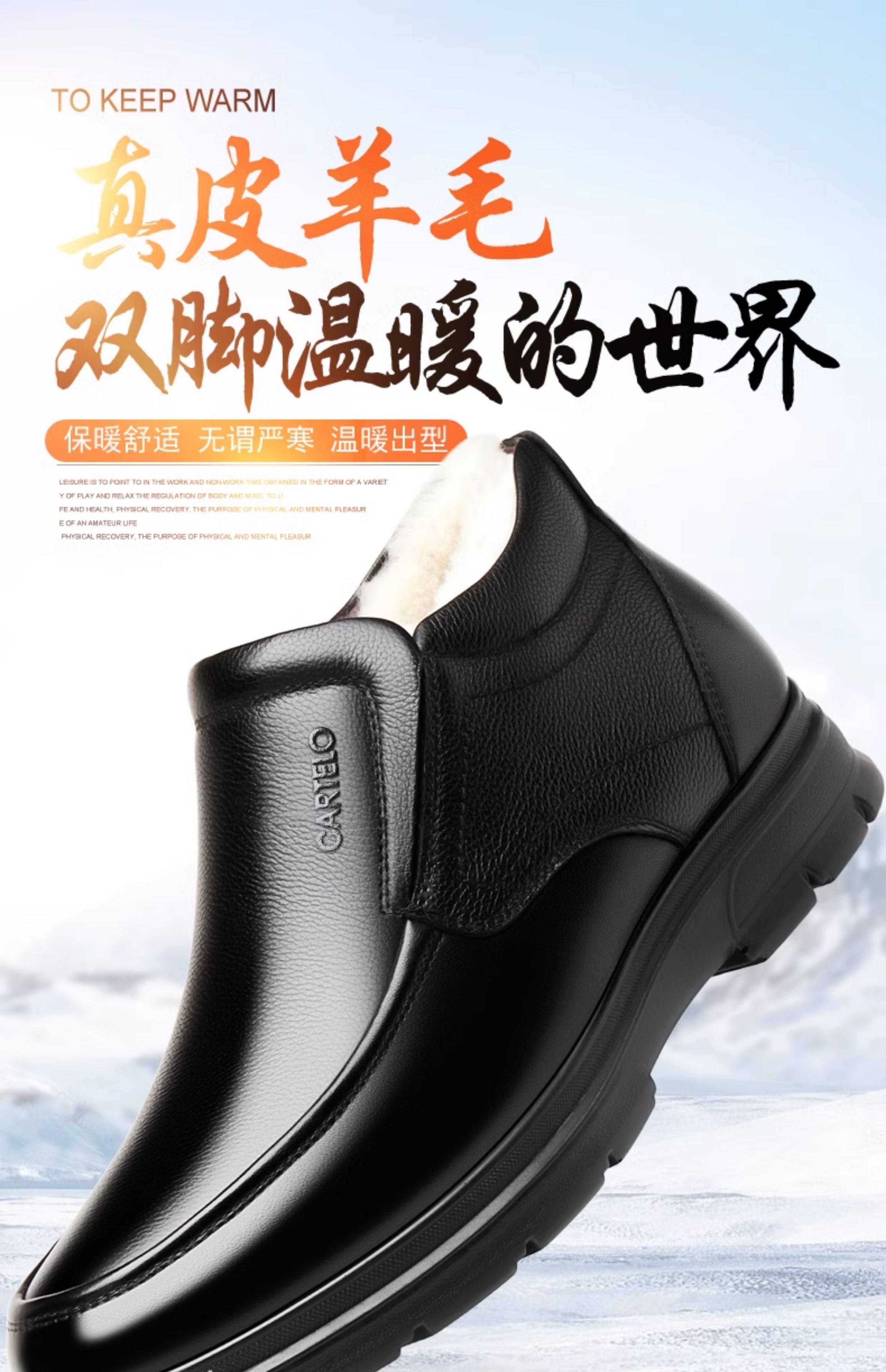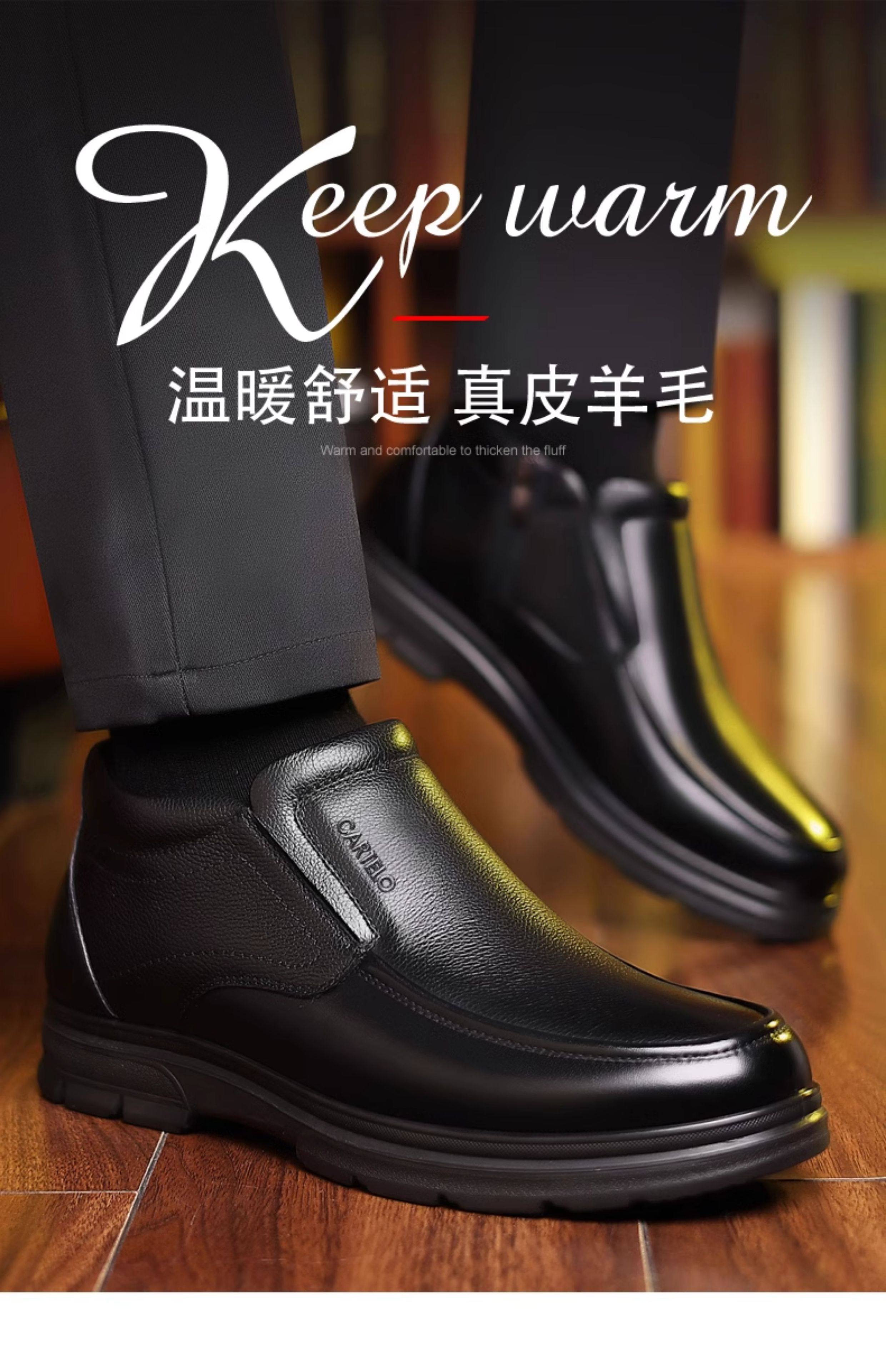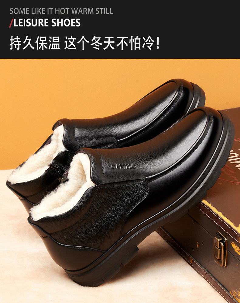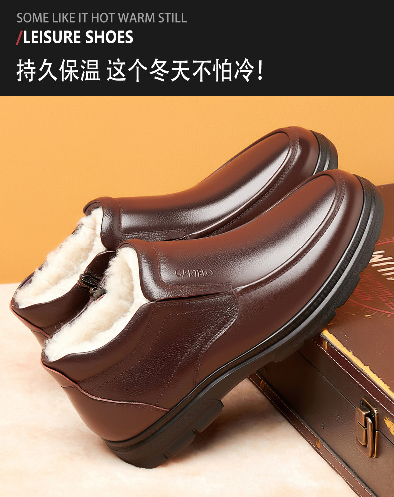 Winter Genuine Leather Wool Warm High-Top Cotton Shoes for Men, Slip-On Fleece-Lined Men's Leather Shoes, Cotton Leather Shoes for Middle-Aged and Elderly Dads