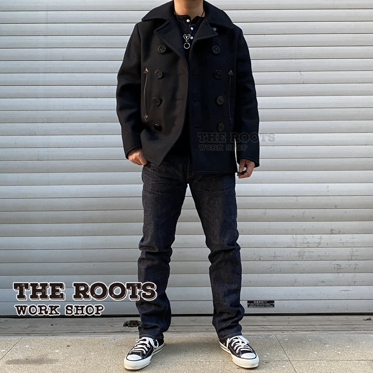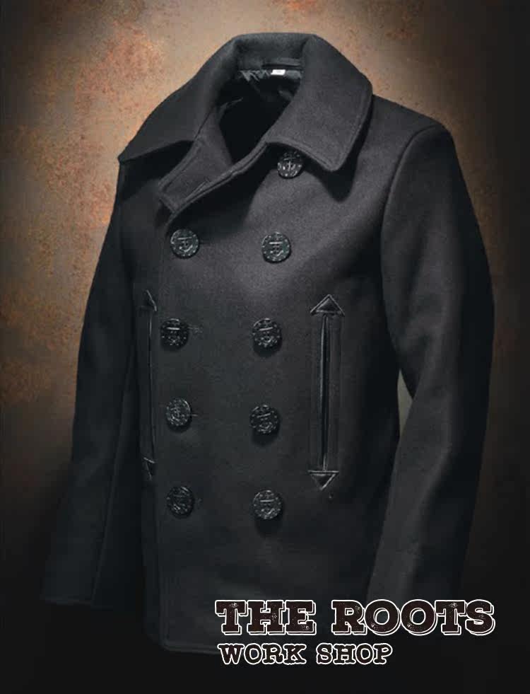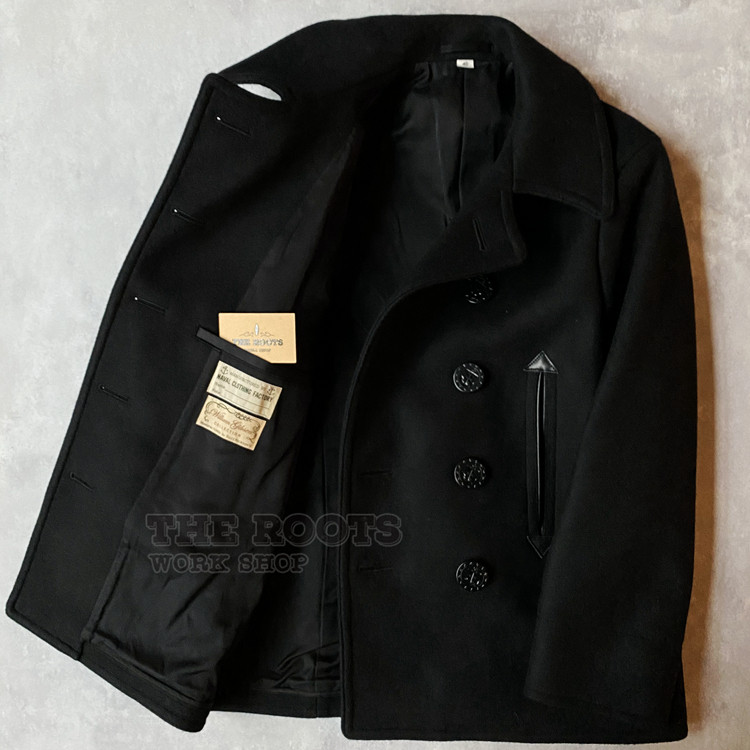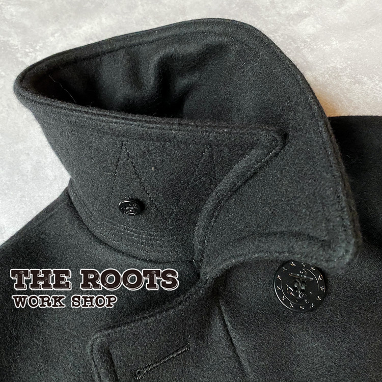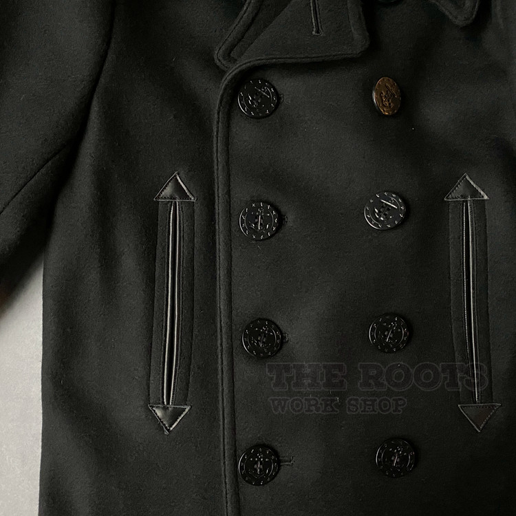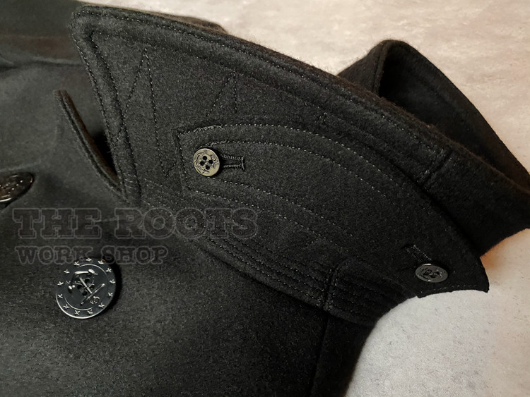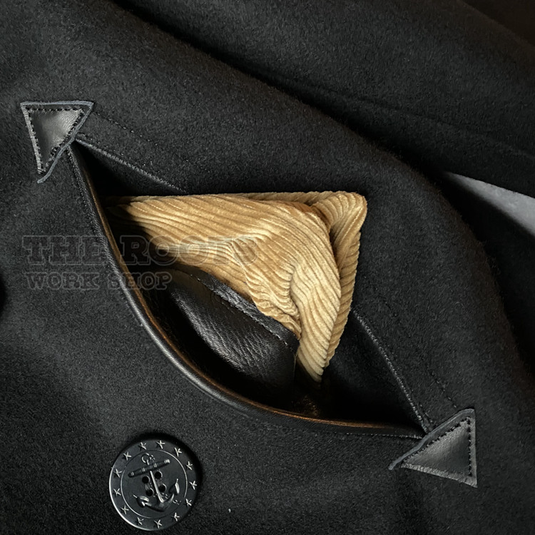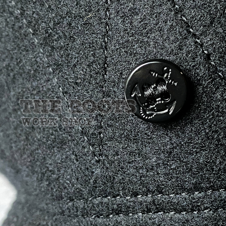 以1910s美国海军军官大衣为原型,选用36oz重磅梅顿羊毛,面料厚重挺括,13星船锚纽扣。领子大型为了在海上作业时,竖起遮住脸部对抗强风。斜插外口袋内里采用保暖性更好的灯芯绒面料。