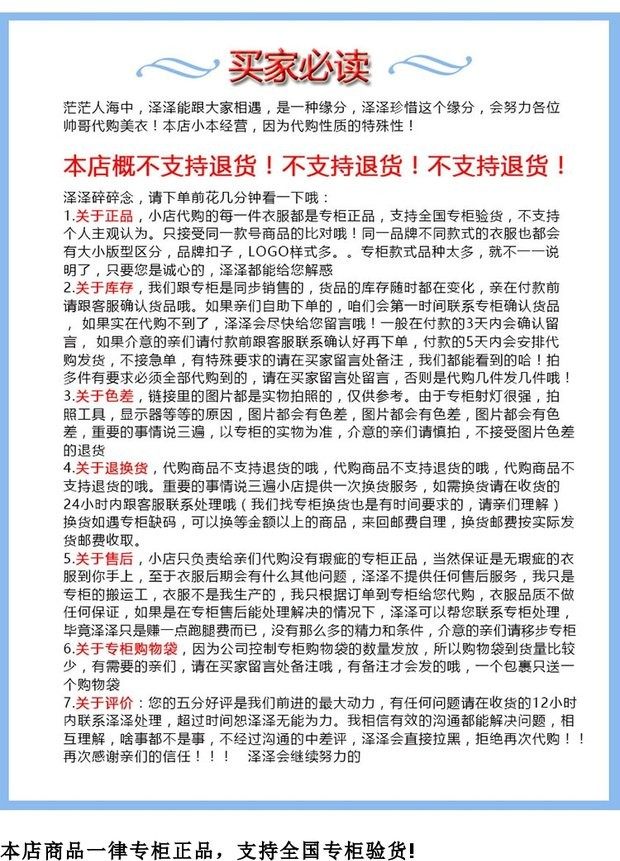 所有商品都是专柜代购,支持专柜验货!!!不接受个人的主观认为!!!毕竟同样面料的商品,衣服的纹路也是多种,专业代购九年,也不敢说所有的面料都见过!