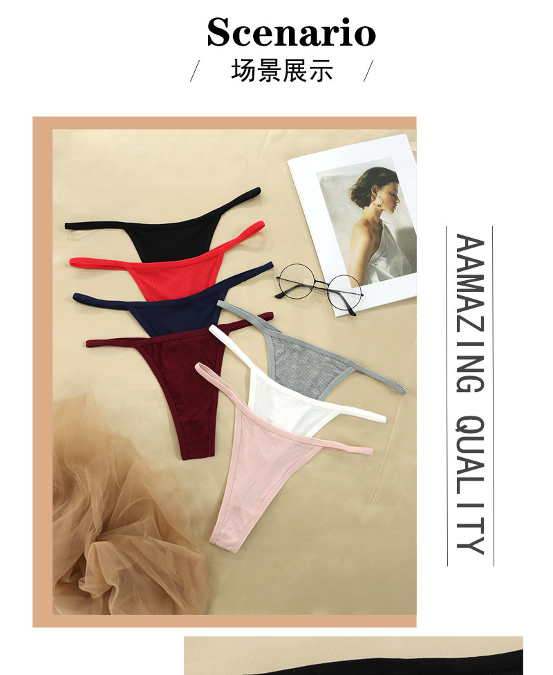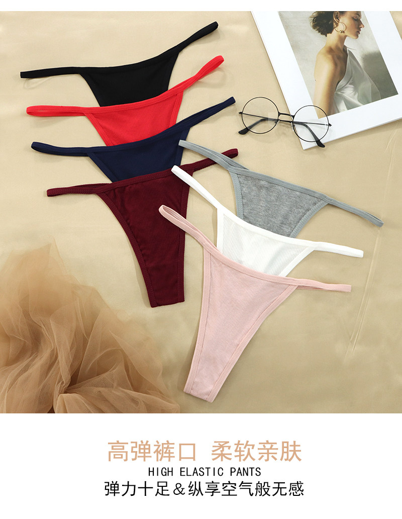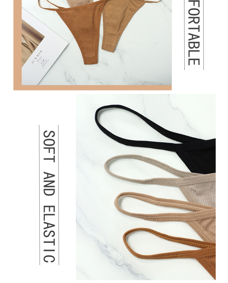 T113 Basic Foreign Trade Style Thin Strap Sexy Thong Low-Rise Cotton Women's Underwear Solid Color Ribbed Simple Cross-Border Plus Size
